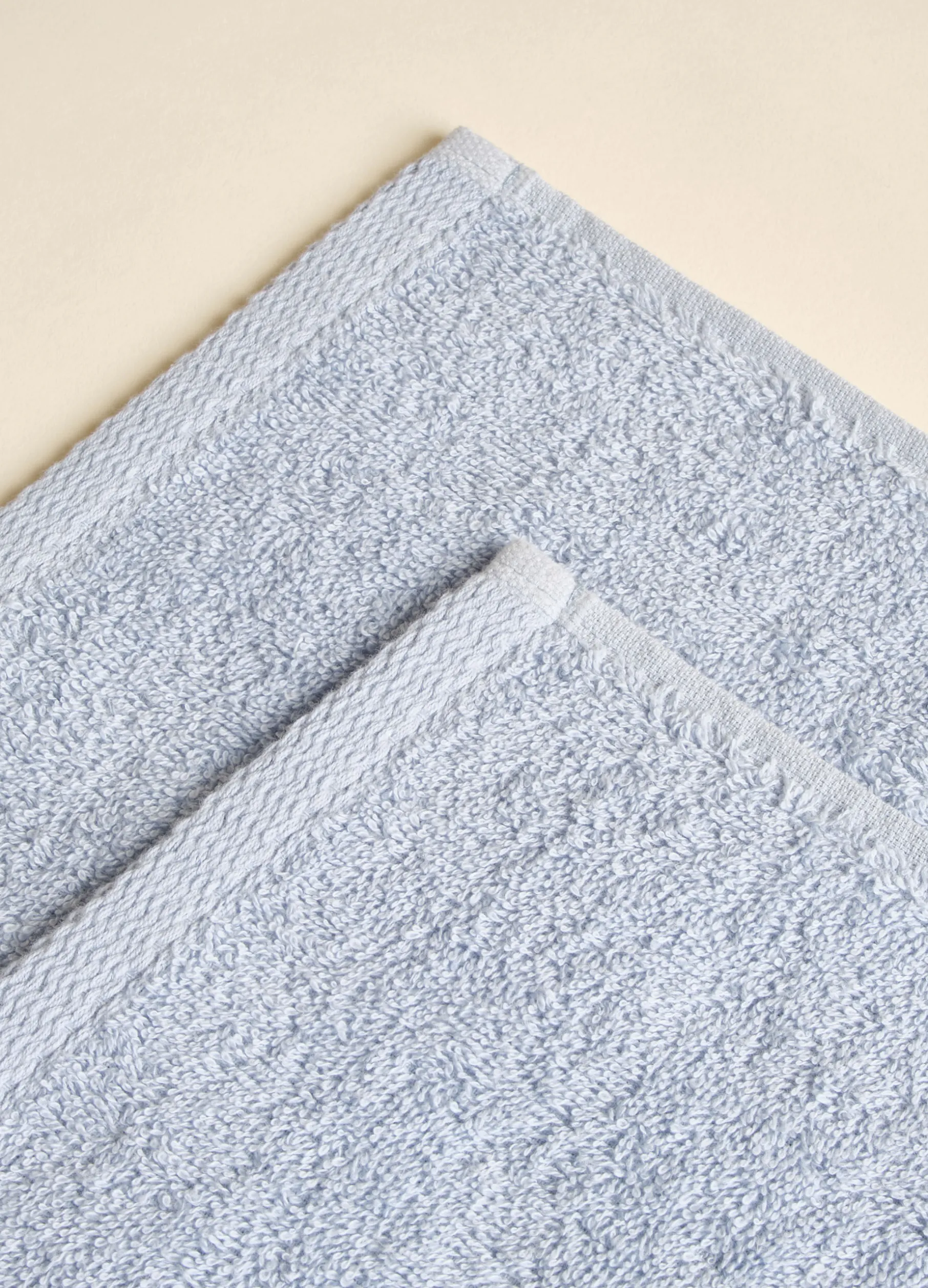 Set da due asciugamani piccoli in spugna di puro cotone azzurro cielo, un materiale soffice e leggero, ideale per garantire il comfort a ogni uso.