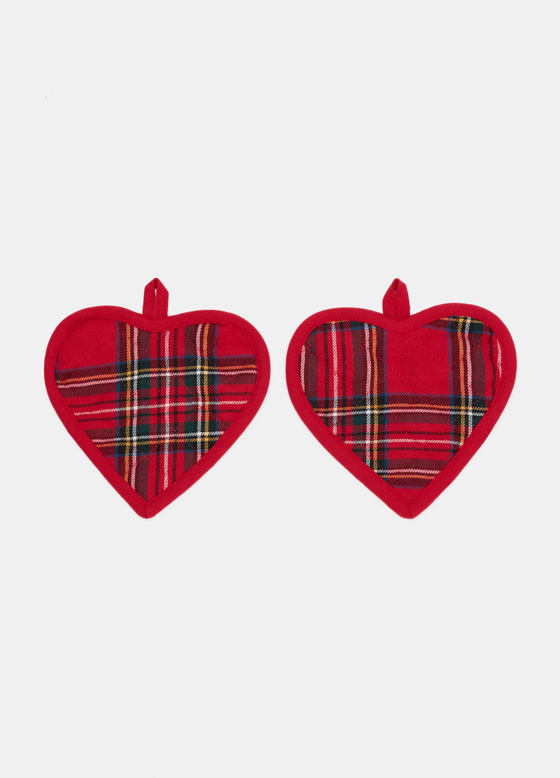 Set da due presine a forma di cuore leggermente imbottite e realizzate in puro cotone con trapuntatura, ispirate alle atmosfere natalizie e festose grazie al motivo a scacchi nei toni del rosso. Complete di laccetto per appenderle. Diametro: 20 cm.