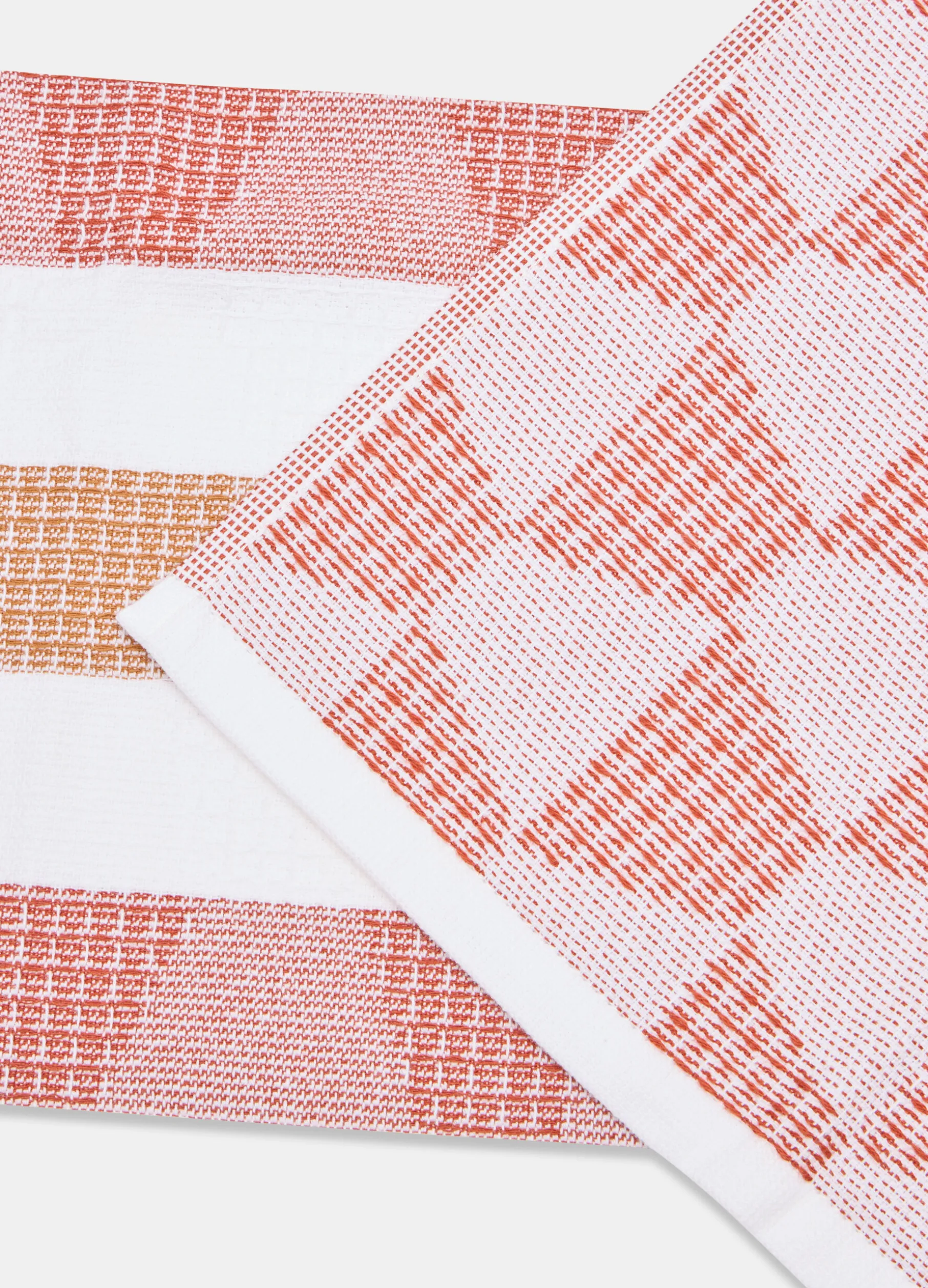 Set da due strofinacci da cucina rettangolari in tela leggera di cotone bianco, un tessuto naturale, assorbente e resistente perfetto per l’uso quotidiano. Il motivo geometrico e a strisce è declinato nei toni del rosso e dell’arancione. Dimensioni: 60 x 50 cm.
