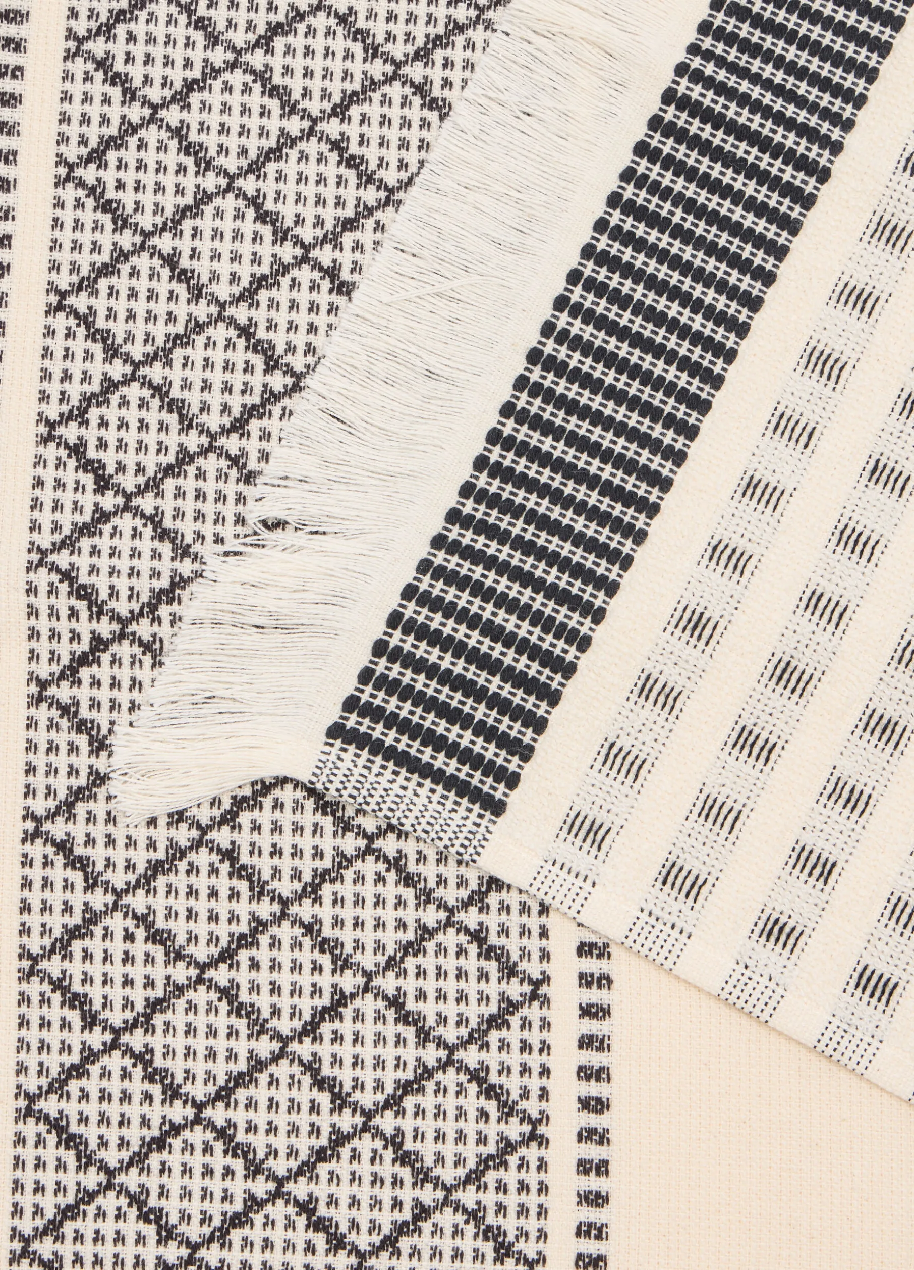 Confezione da due strofinacci da cucina in tela di cotone bianco avorio, leggera e versatile, in grado di arricchire l’ambiente della cucina grazie anche ai motivi decorativi bicolore. Completi di frange o bordo ricamato. Dimensioni: 60 x 50 cm.