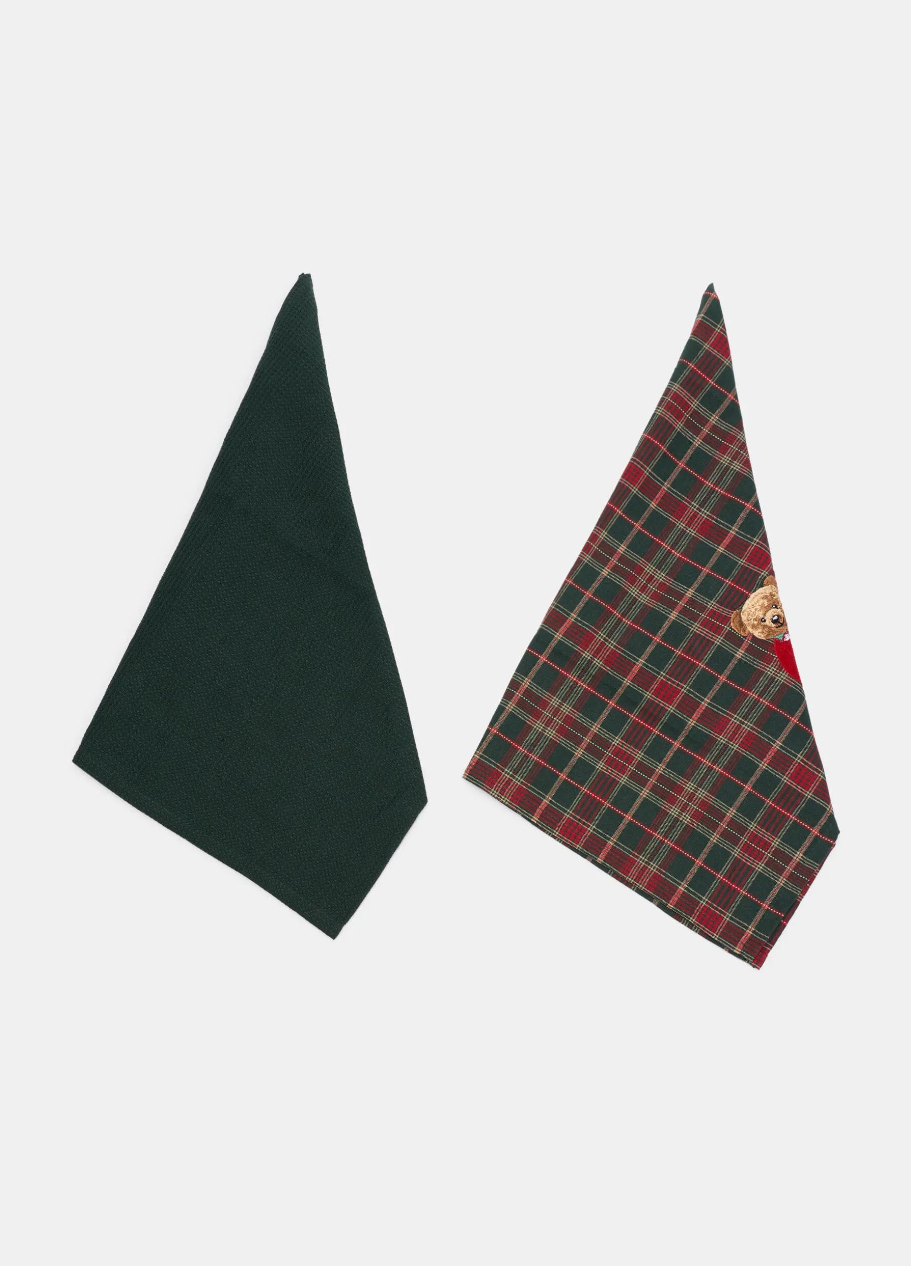 Set da due strofinacci, abbinati alla linea dedicata di tessili per la cucina, realizzati in puro cotone e presentati in due varianti: tessuto verde scuro tinta unita a nido d’ape e tartan verde e rosso arricchito dal ricamo di un allegro orsacchiotto. Dimensioni: 70 x 50 cm.