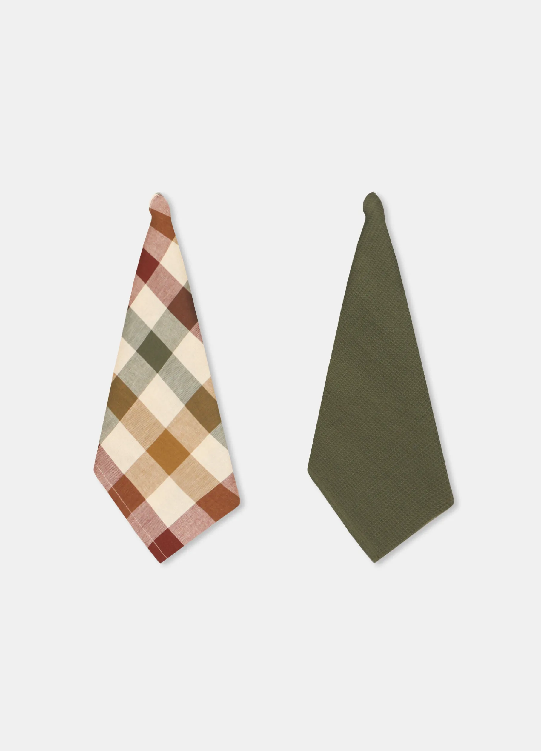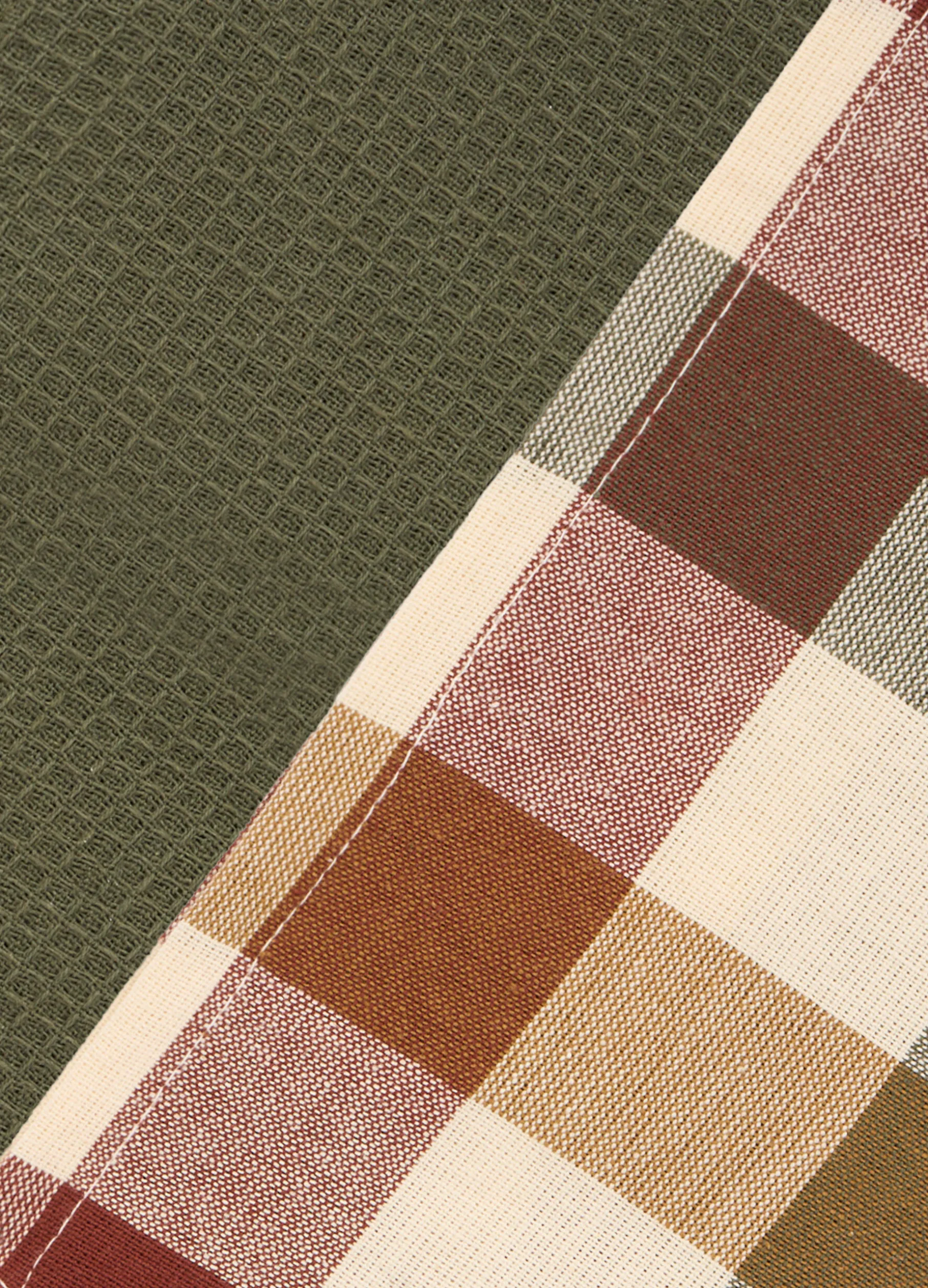 Set da due strofinacci leggeri e versatili, particolarmente assorbenti grazie alla composizione in puro cotone. Il set alterna un classico motivo a quadri con una versione in tinta unita con tessuto a nido d’ape. Dimensioni: 70 x 50 cm.