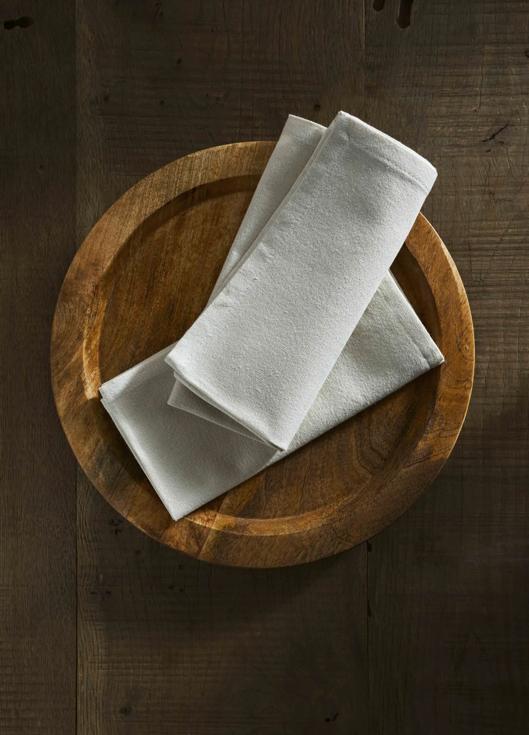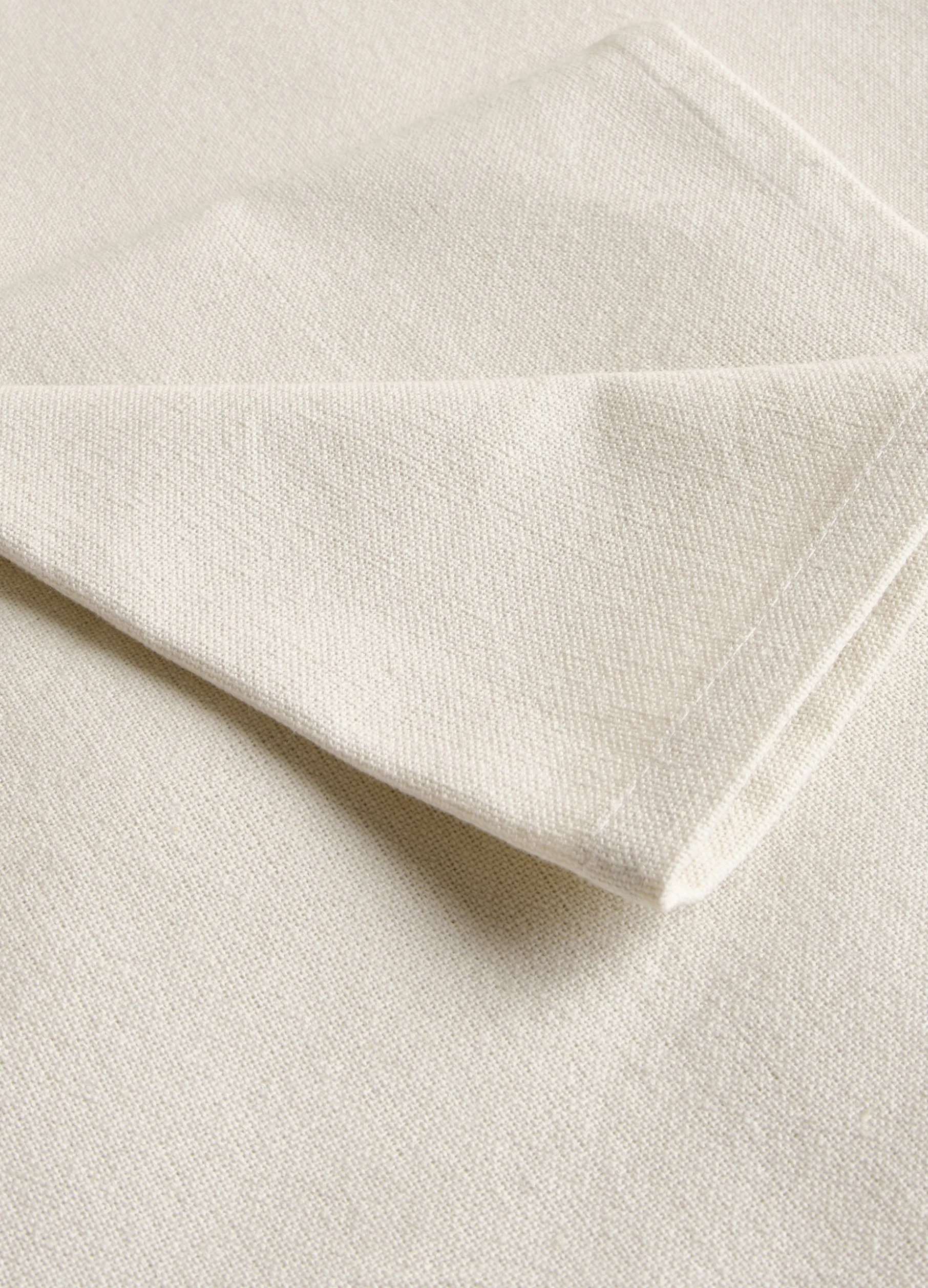 Set di due tovaglioli da cucina realizzati in puro cotone bianco avorio: il tessuto ha un aspetto fresco e rustico ed è arricchito da un trattamento antimacchia. Dimensioni: 42 x 42 cm.