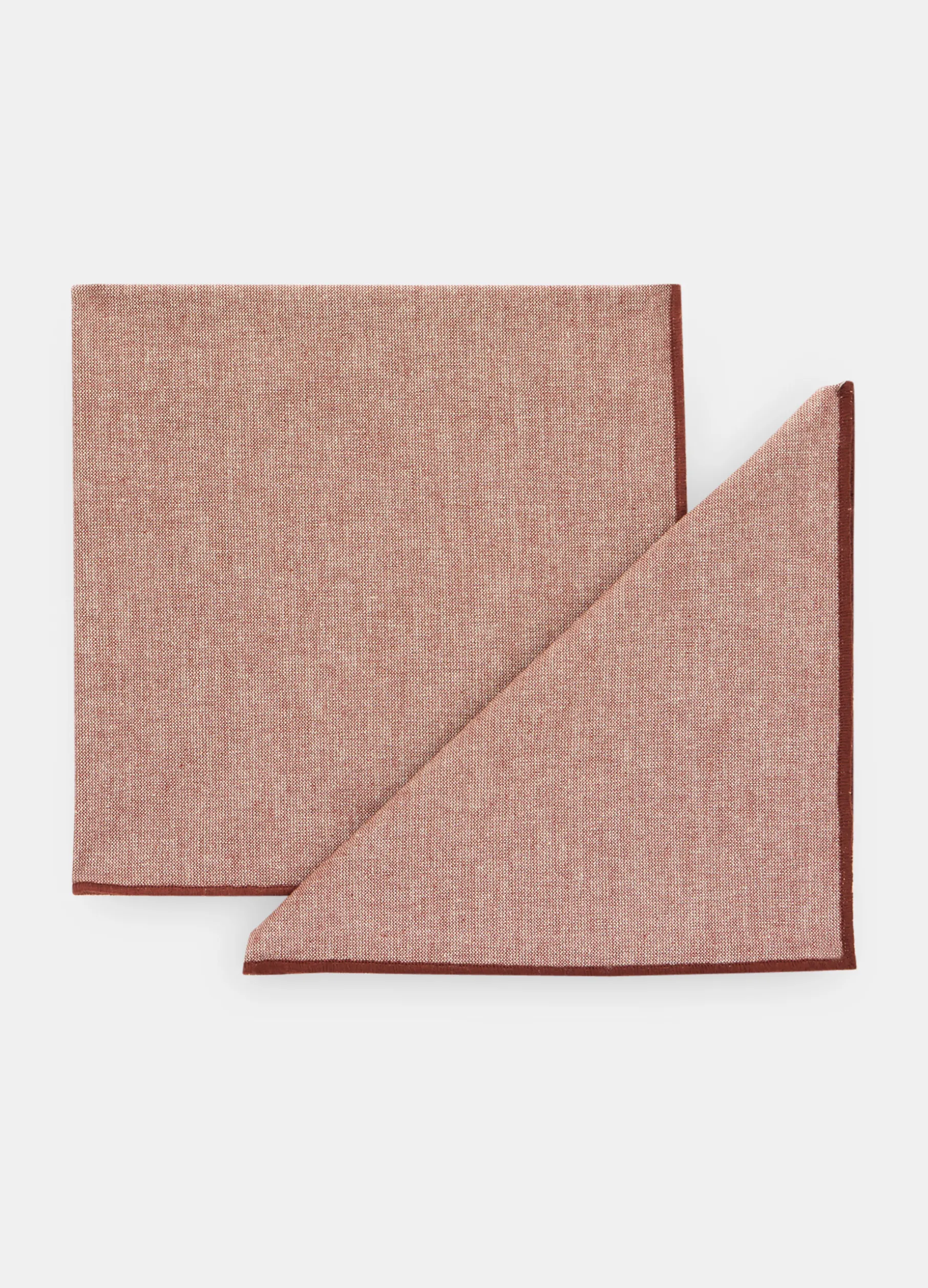 Confezione da due tovaglioli da tavola realizzati in puro cotone rosso con una texture particolare: il tessuto riprende l’effetto fiammato tipico del lino e crea una colorazione mélange, completata dal bordo più scuro. Dimensioni: 42 x 42 cm.