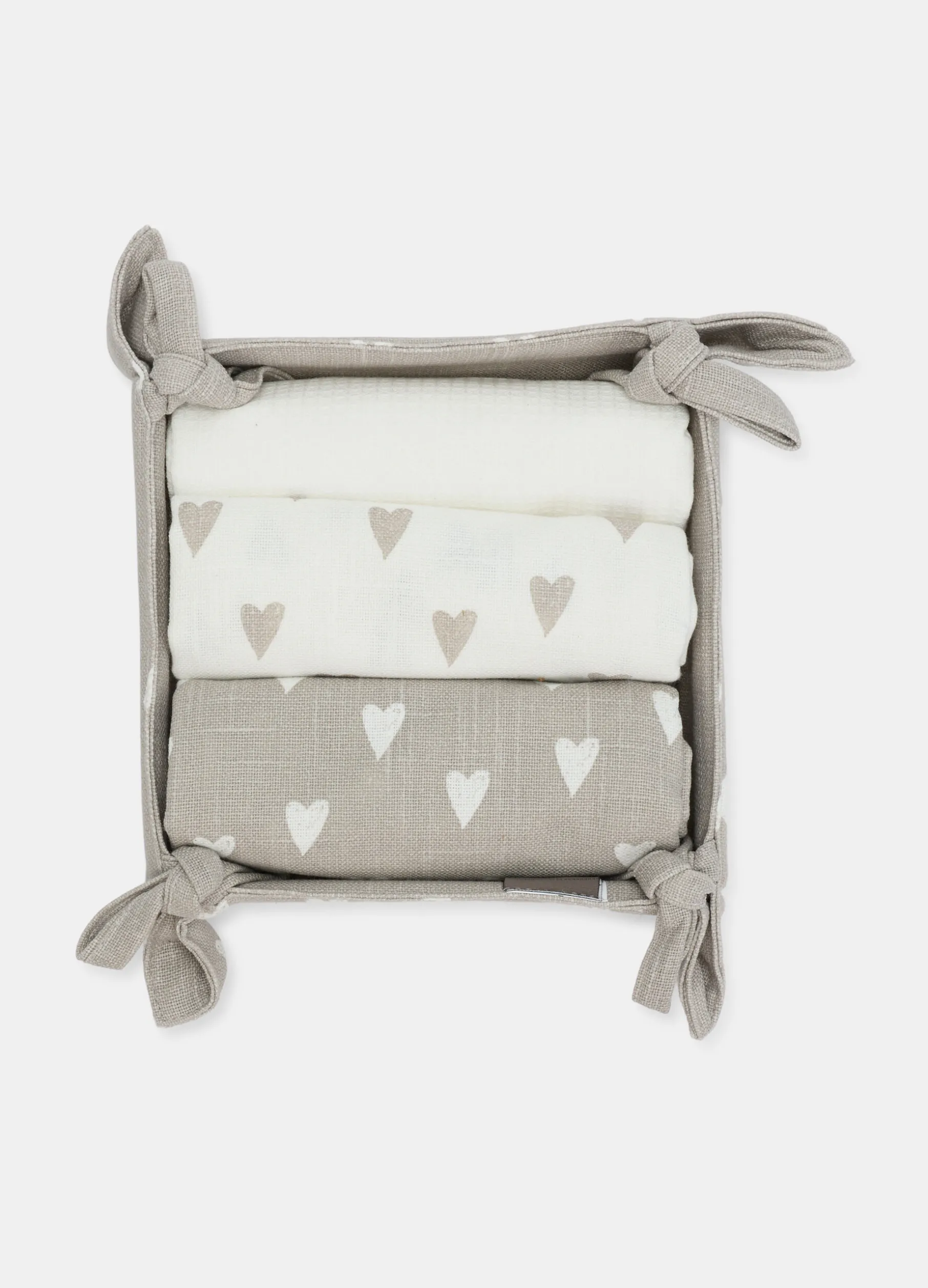 Set da cucina, perfetto come regalo o per arricchire gli spazi domestici con un tocco di eleganza, completo di tre strofinacci in puro cotone nei toni del grigio e del bianco, con un romantico motivo a cuori, e cestino quadrato rinforzato. Dimensioni strofinacci: 70 x 50 cm.