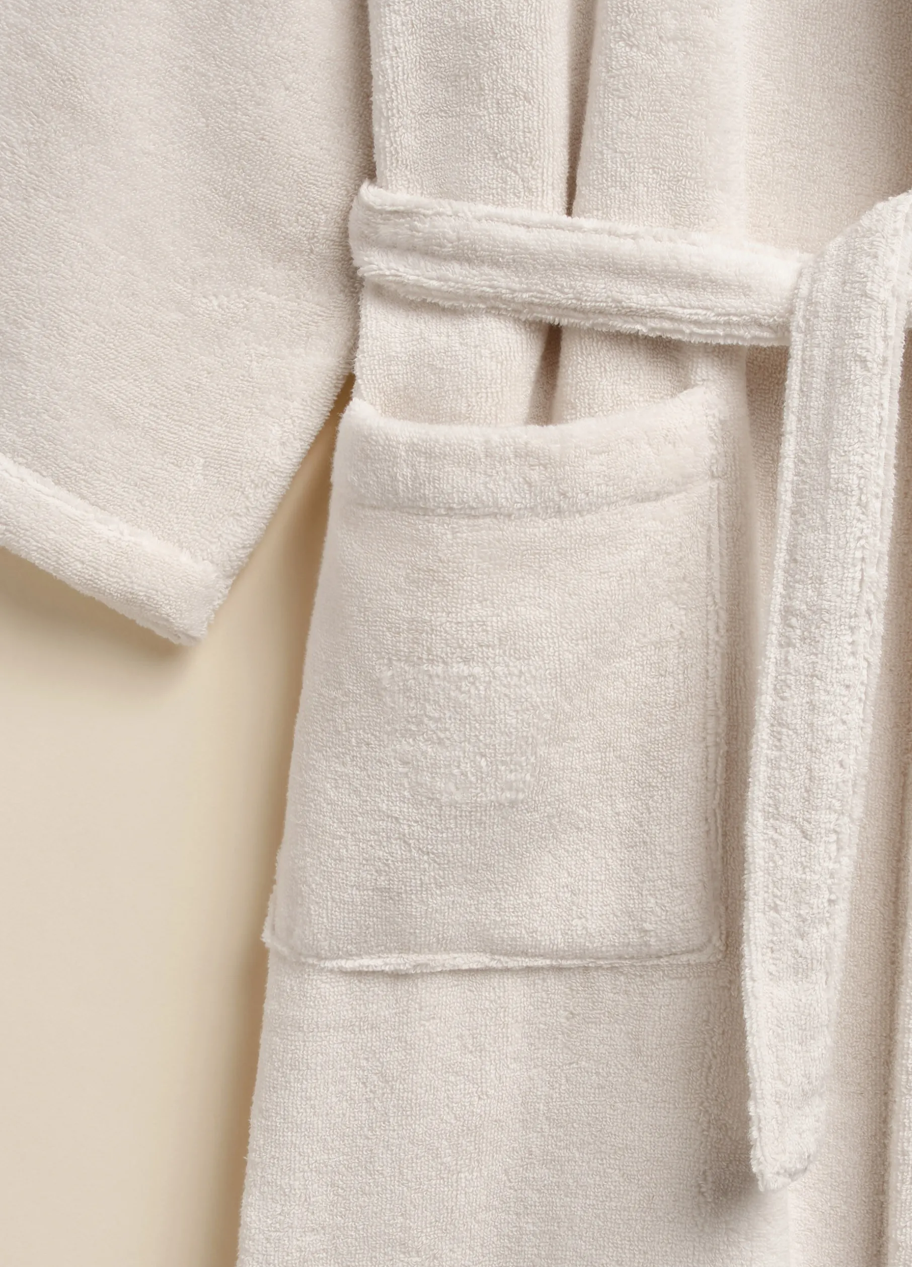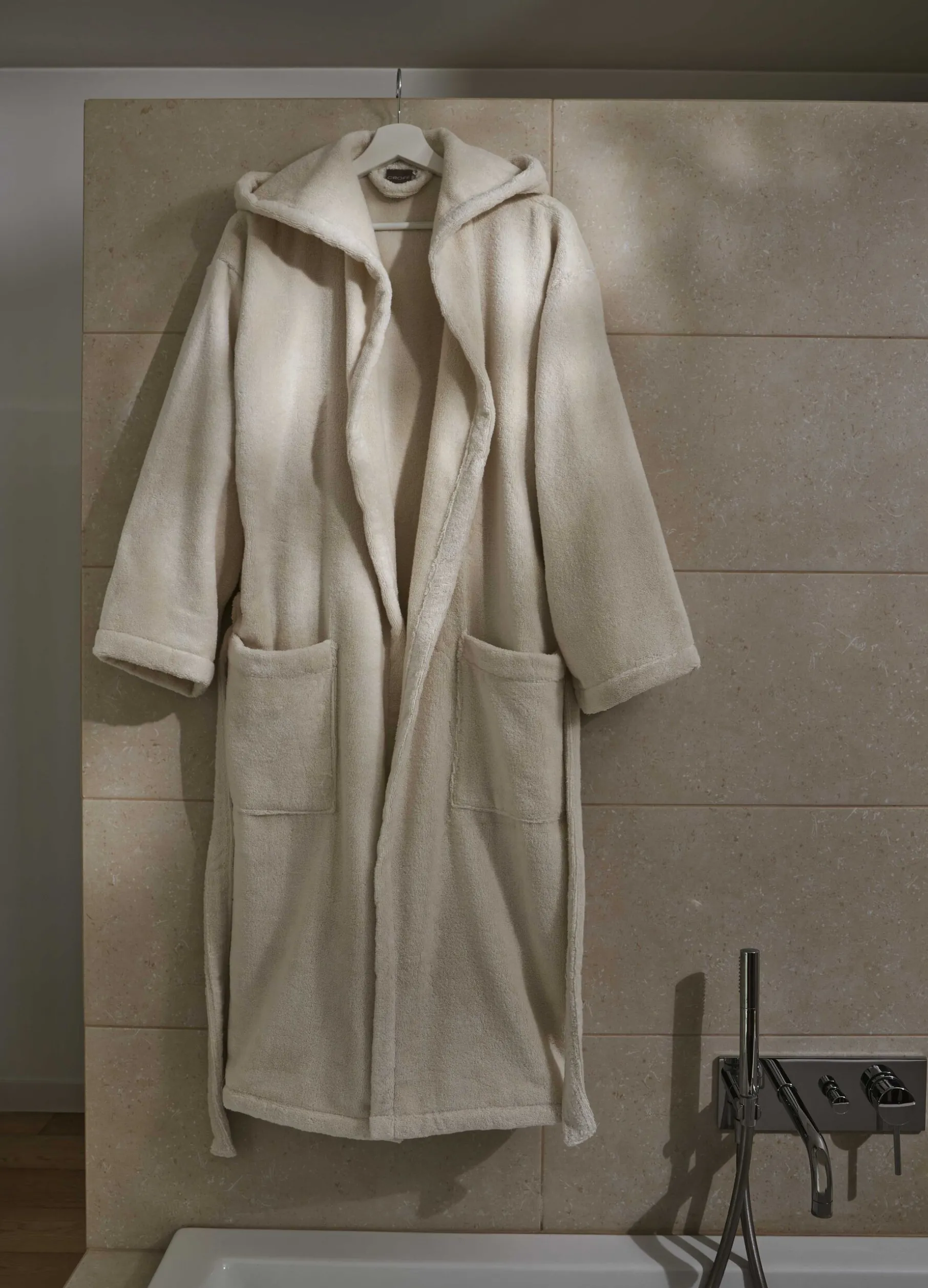 Accappatoio con cappuccio in puro cotone con due tasche applicate sul davanti e fusciacca legata in vita. Tinta unita. Taglia S. Made in Portogallo.