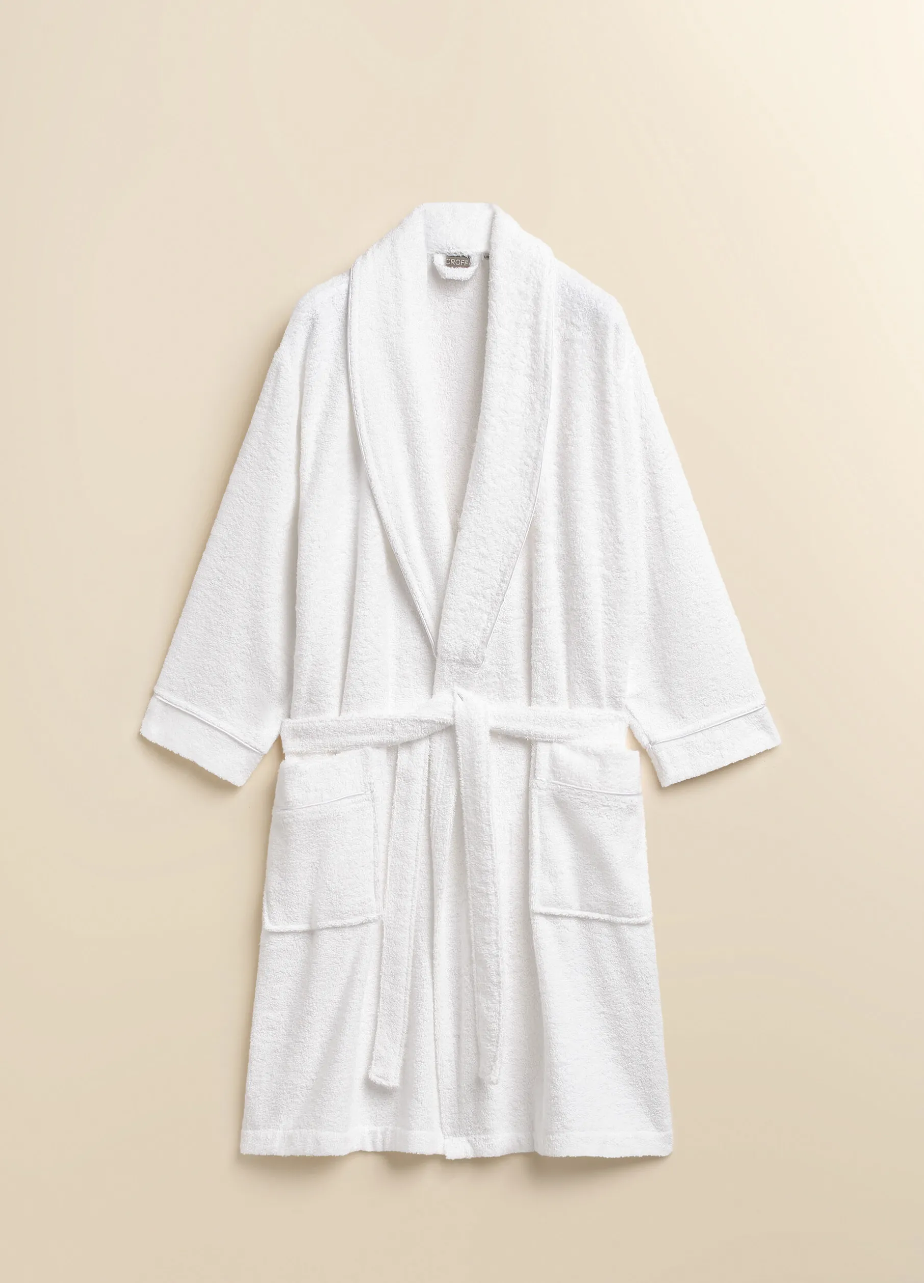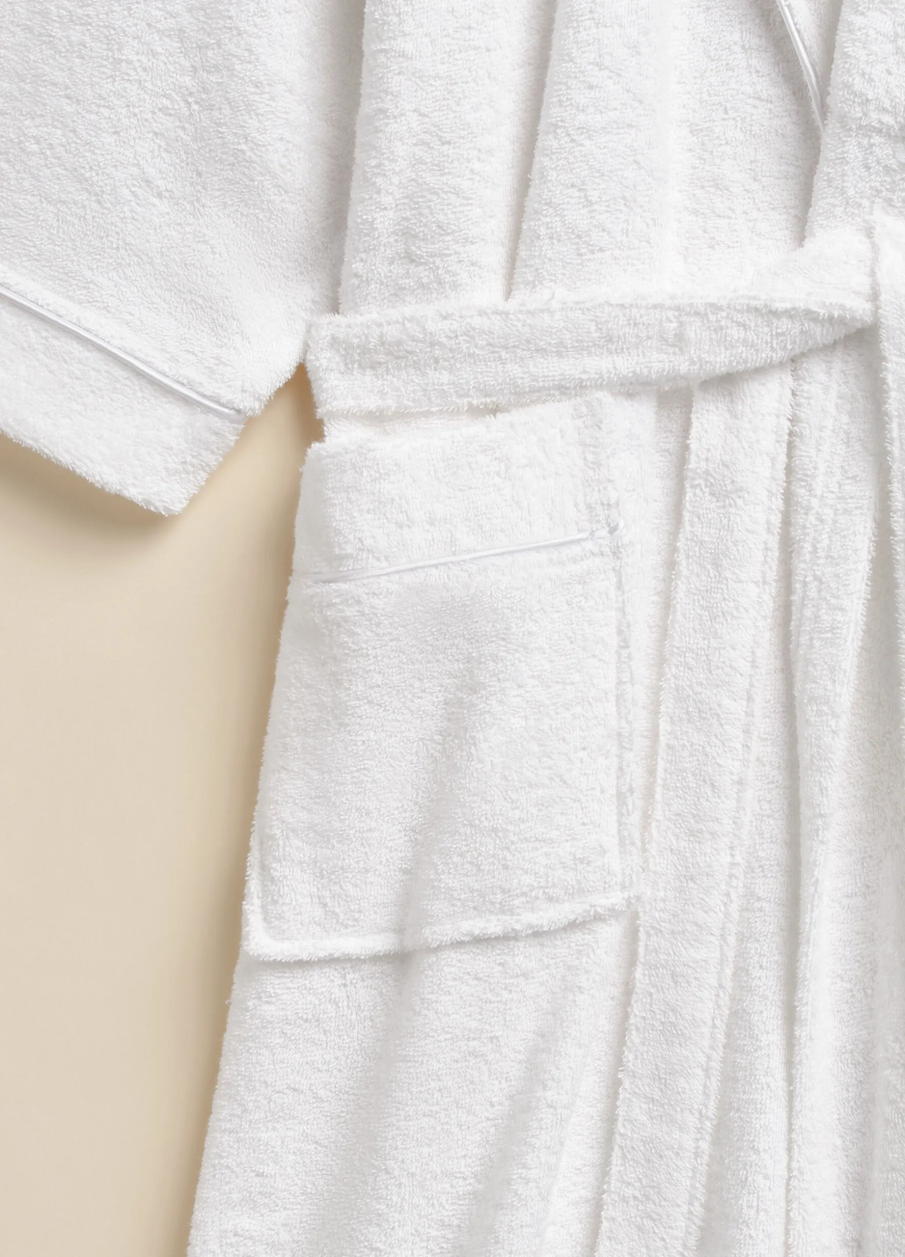Accappatoio morbido realizzato in spugna di puro cotone, dalla trama fitta e soffice, per garantire il comfort totale. Con collo sciallato e cintura, è arricchito da profili satinati.