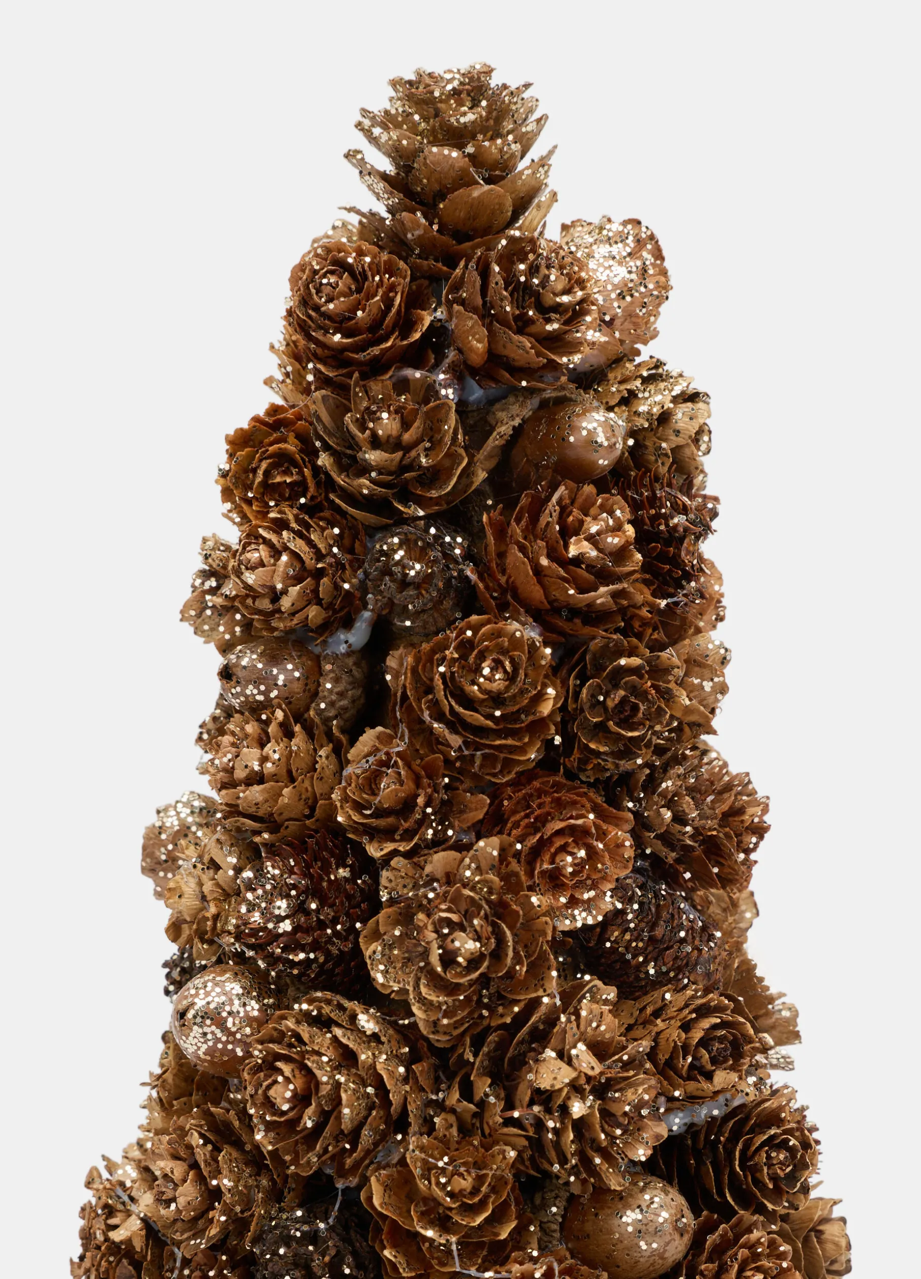 Alberello decorativo con base conica, ricoperta da pigne e ghiande spolverate da un velo di glitter dorato, che rallegra e accende l’atmosfera festiva. Altezza: 41 cm.