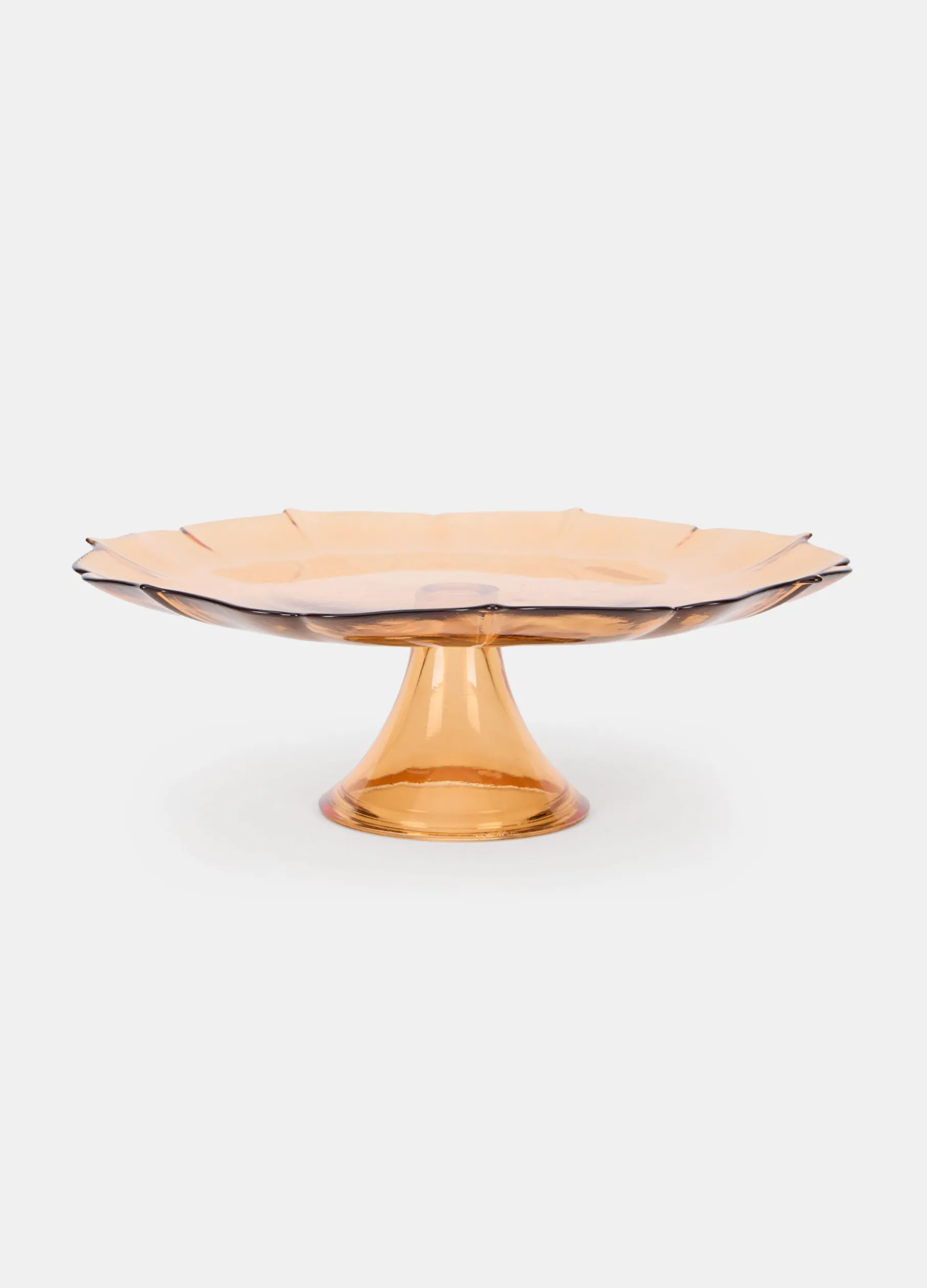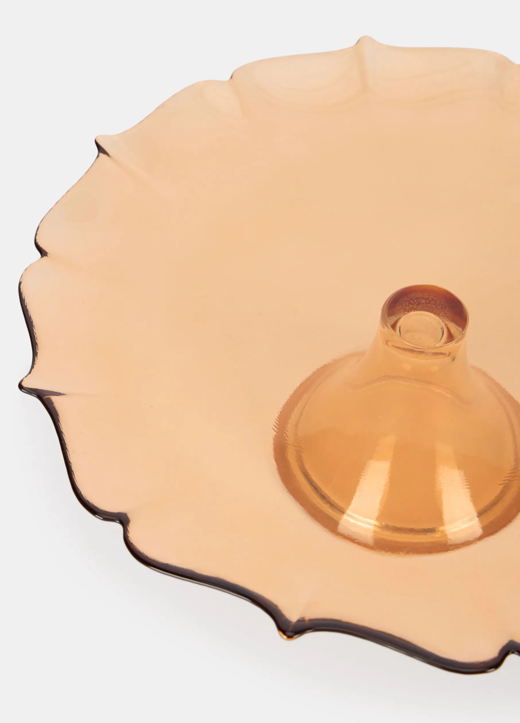 Alzata per dolci e vivande dal gusto originale e romantico realizzato in vetro colorato e trasparente: la sagoma e il colore che mescola marrone e arancio ricordano le atmosfere autunnali e rallegrano la tavola con eleganza. Altezza: 9,5 cm; diametro: 27,5 cm.