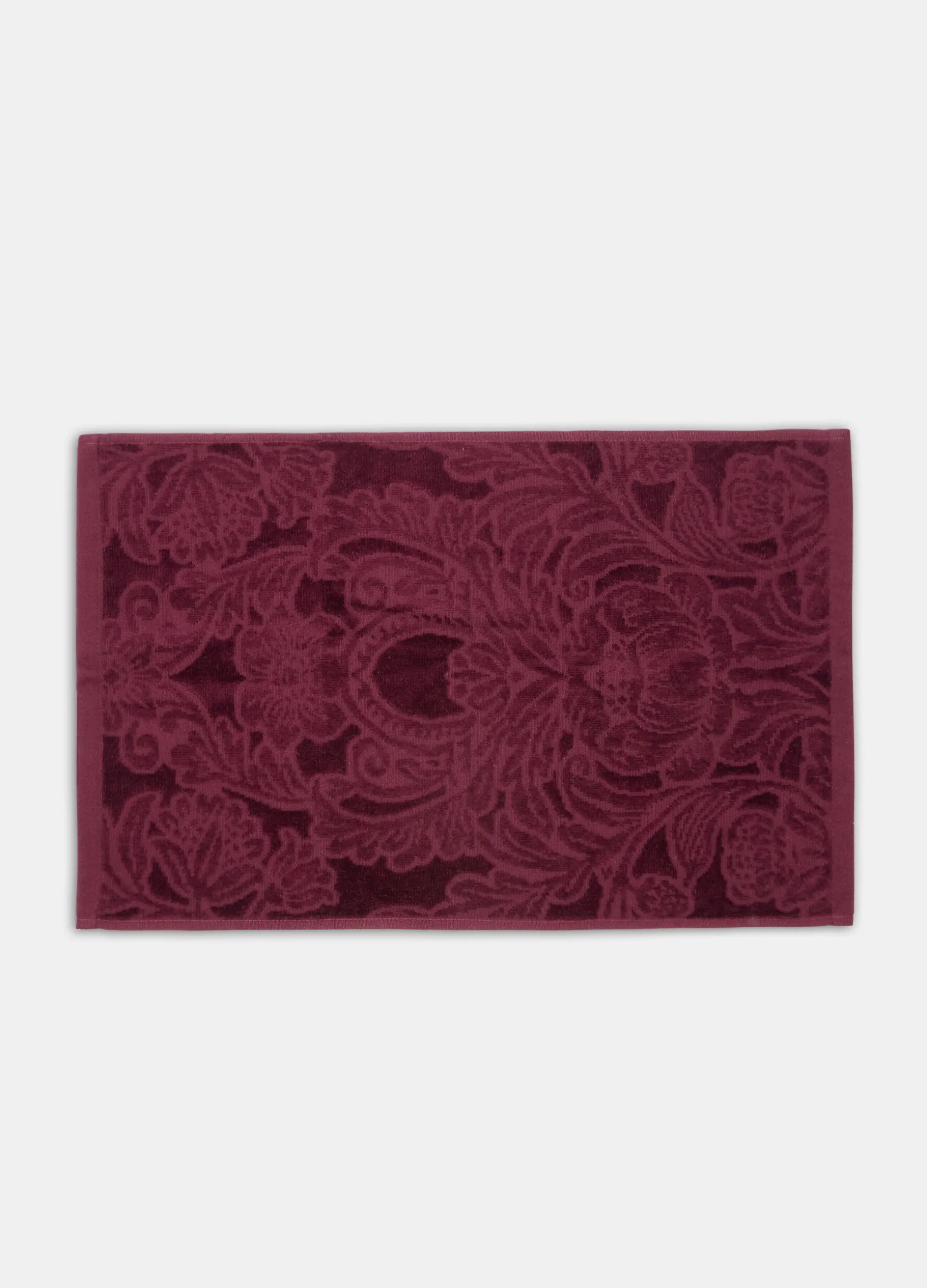 Asciugamano rettangolare per mani e viso in pura spugna di cotone rosso bordeaux. Il tessuto morbido e avvolgente è caratterizzato da un motivo decorativo effetto jacquard. Dimensioni: 90 x 50 cm.