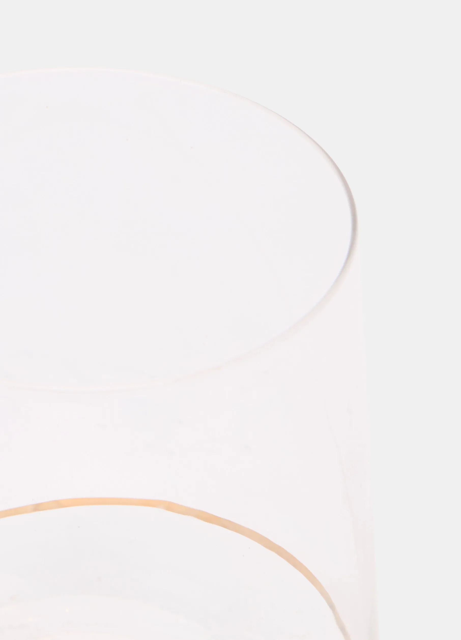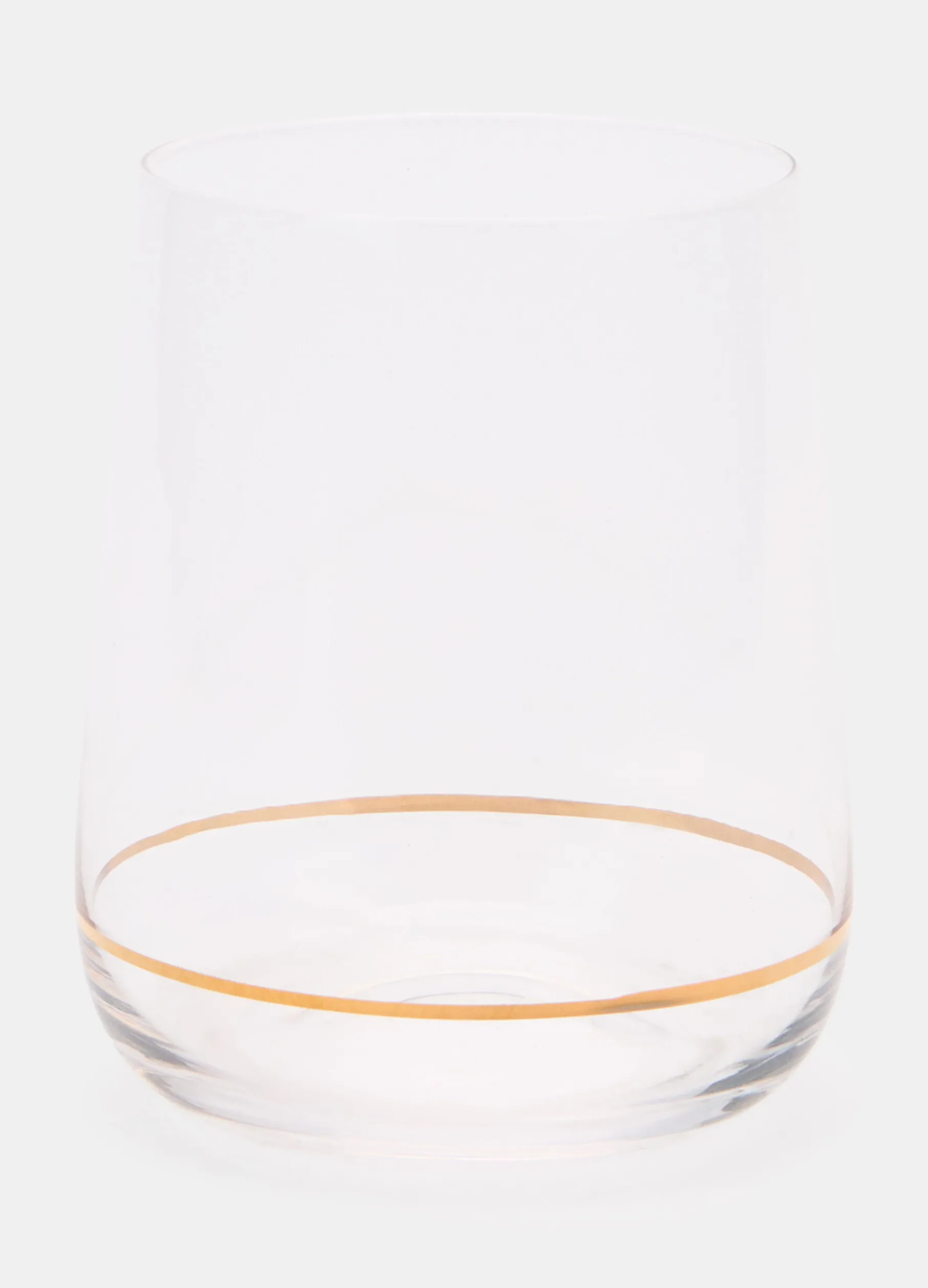 Delicato bicchiere basso in vetro trasparente a base larga e rotonda, ideale per acqua e altre bevande, pensato per arricchire la tavola nelle occasioni speciali grazie all’elegante dettaglio dorato. Altezza: 10 cm; diametro: 8,6 cm.