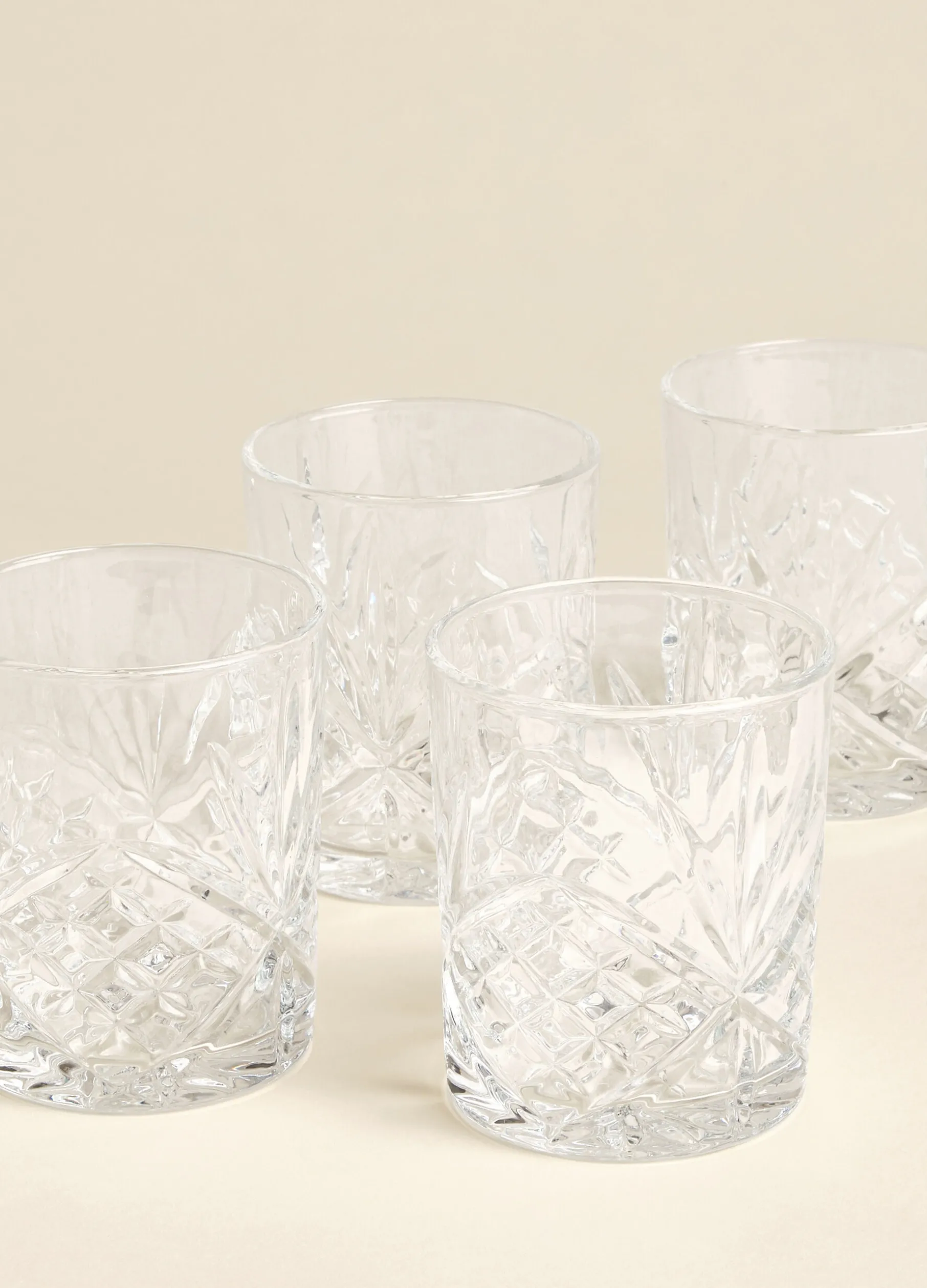 Bicchiere classico stile tumbler, ideale per il whiskey, realizzato in vetro spesso e trasparente arricchito da un ricco motivo decorativo inciso.