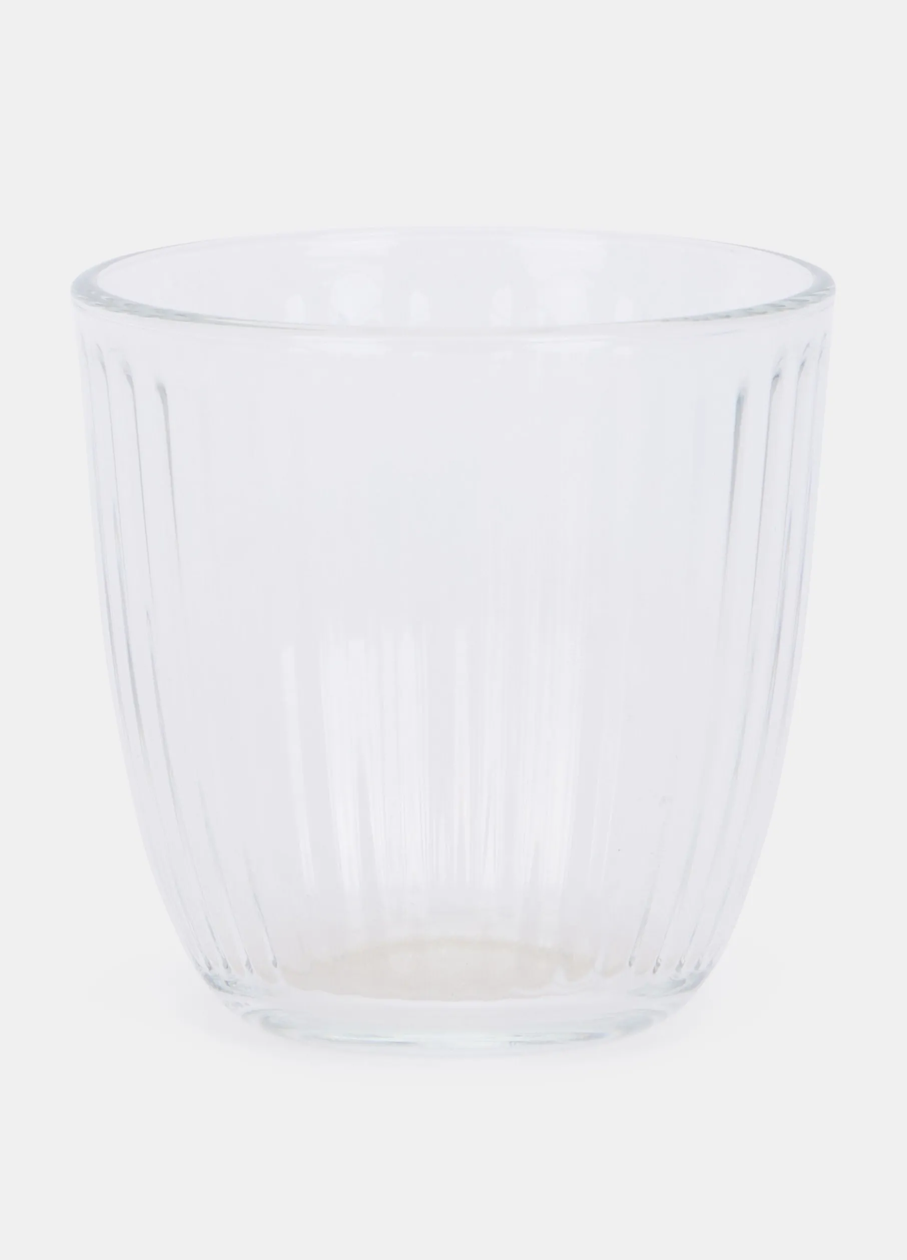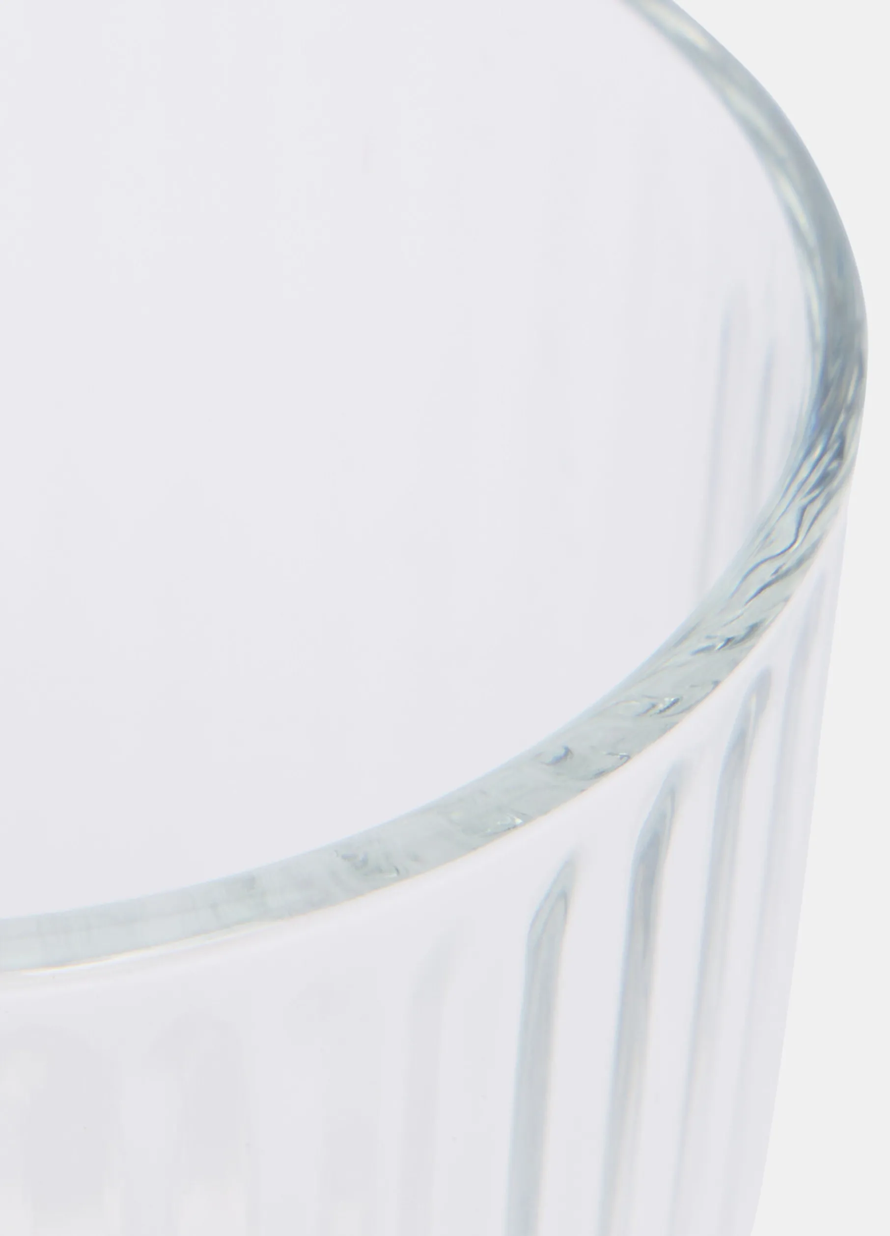 Bicchiere in vetro trasparente, caratterizzato da scanalature verticali. Altezza: 9 cm; capacità: 29,5 CL