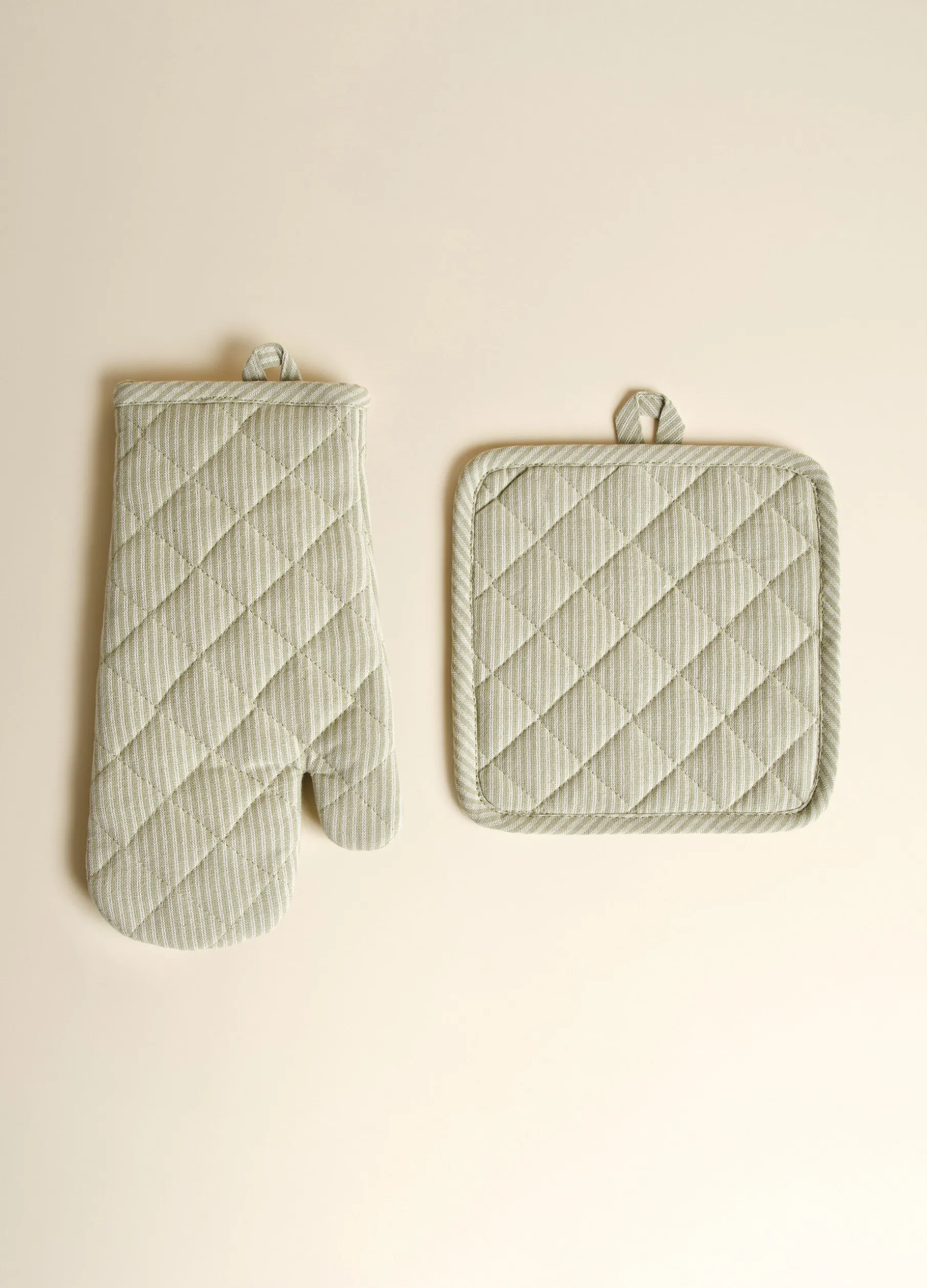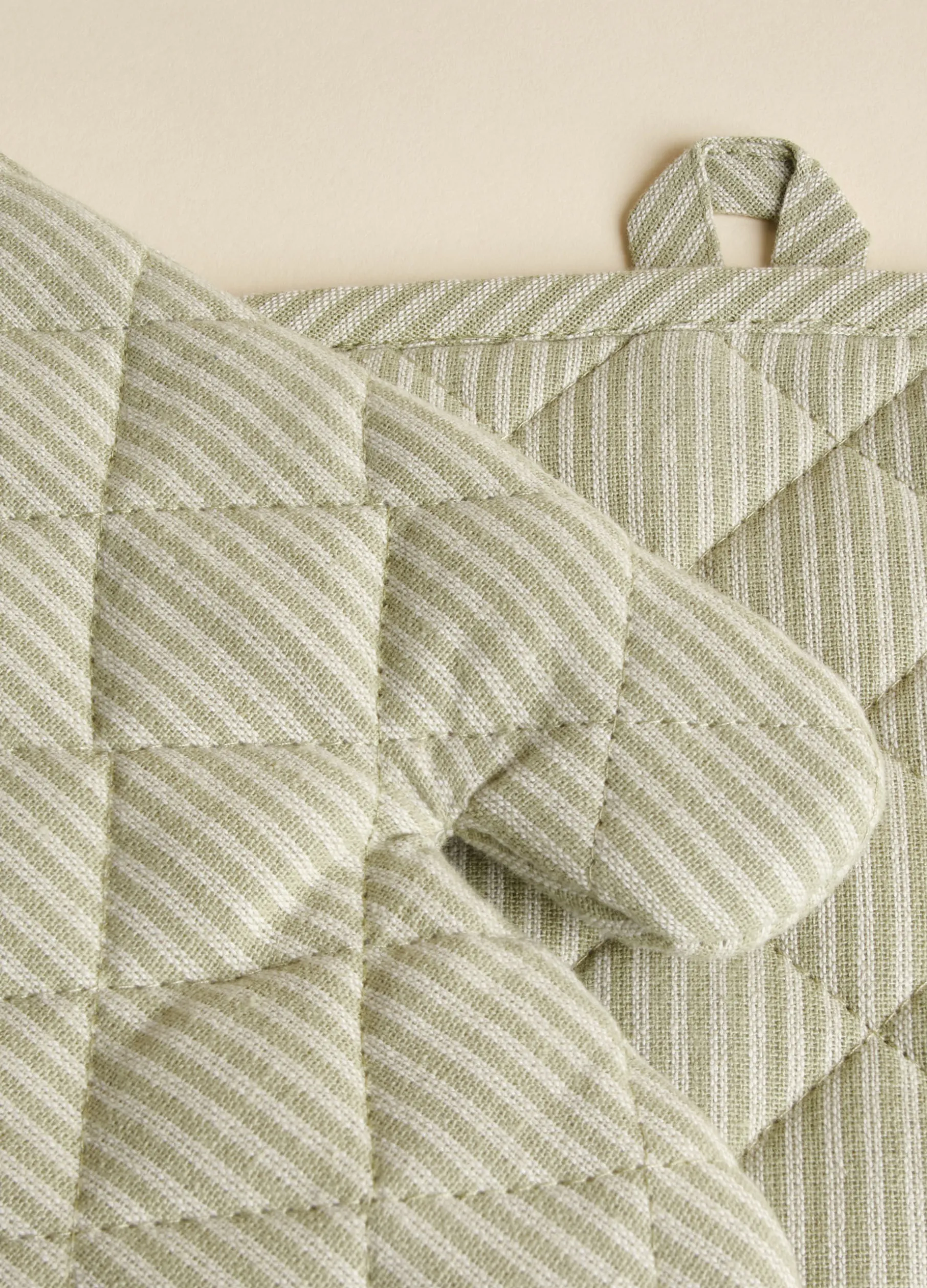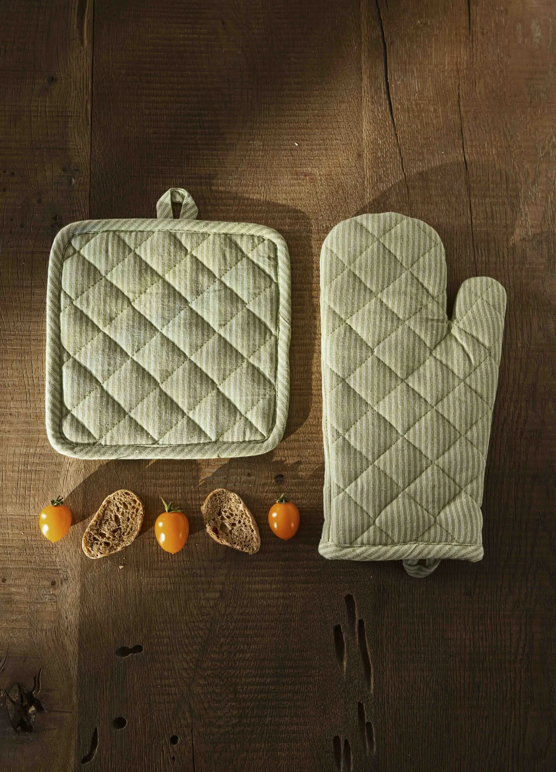 Bipack con 1 guanto e 1 presina. Stampa a righe. Esterno in puro cotone. Linea ECO by Croff.