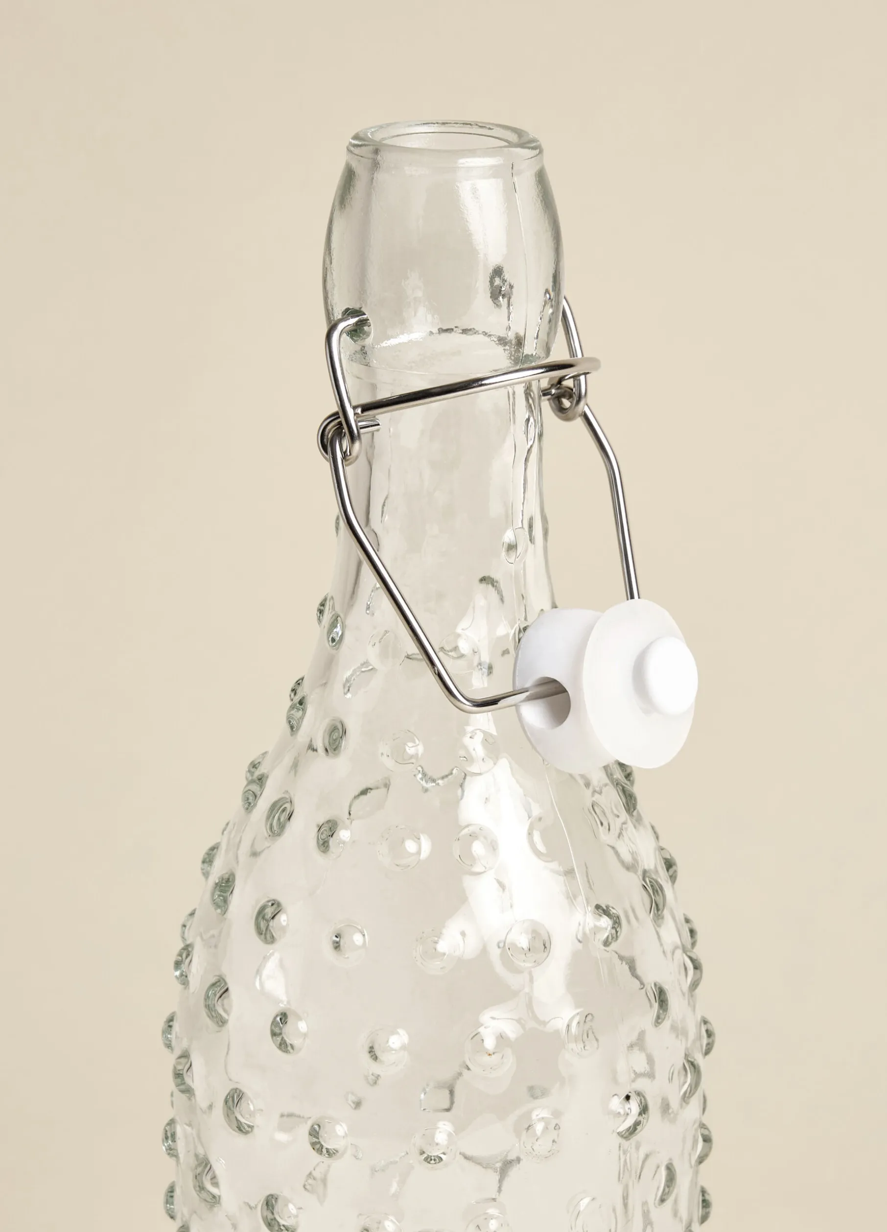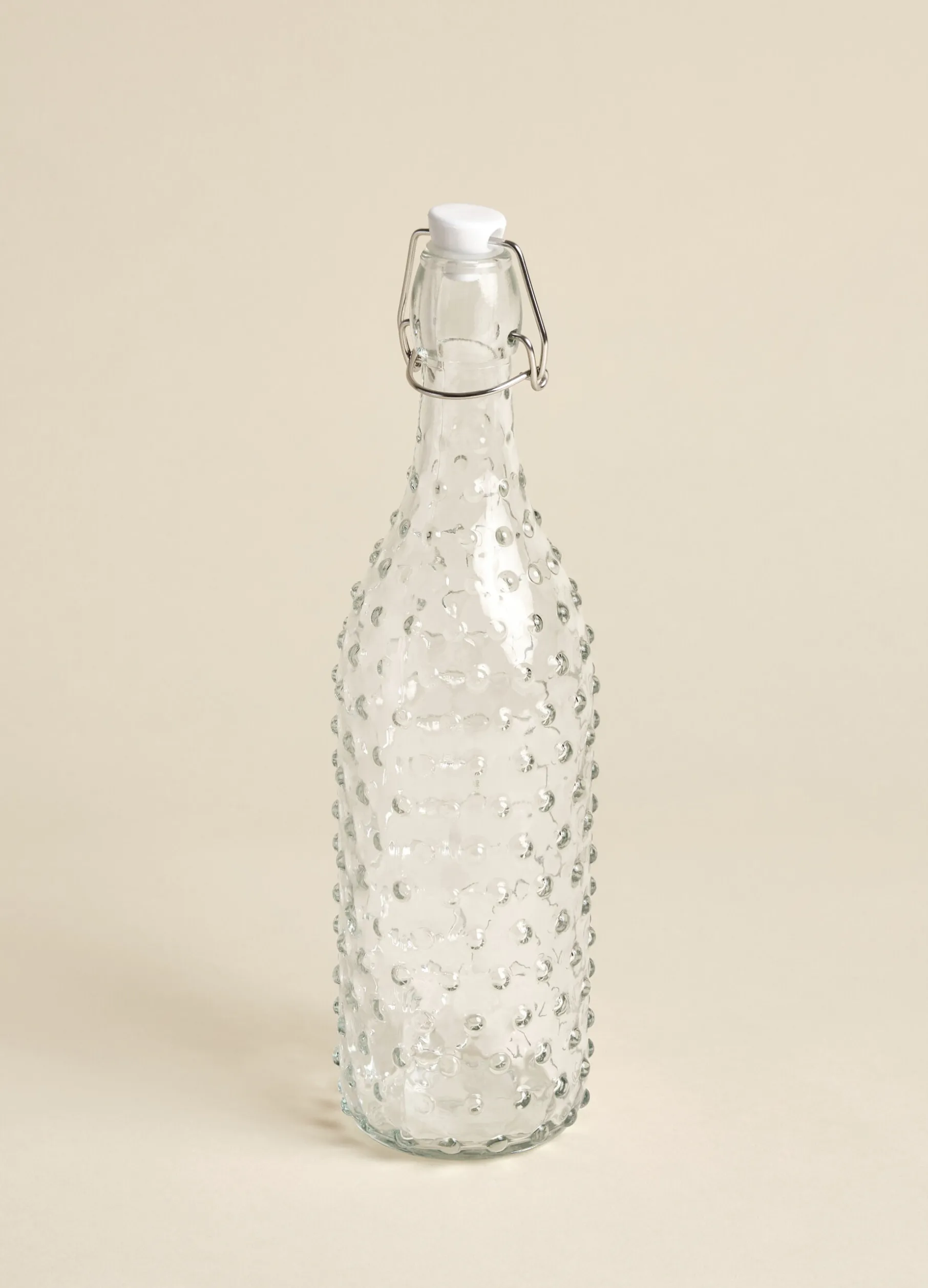 Bottiglia per acqua o altre bevande realizzata in vetro trasparente dalla particolare lavorazione a sfere tridimensionale che crea un effetto pois in 3D. Con tappo ermetico che garantisce una tenuta ottimale ed evita le perdite.