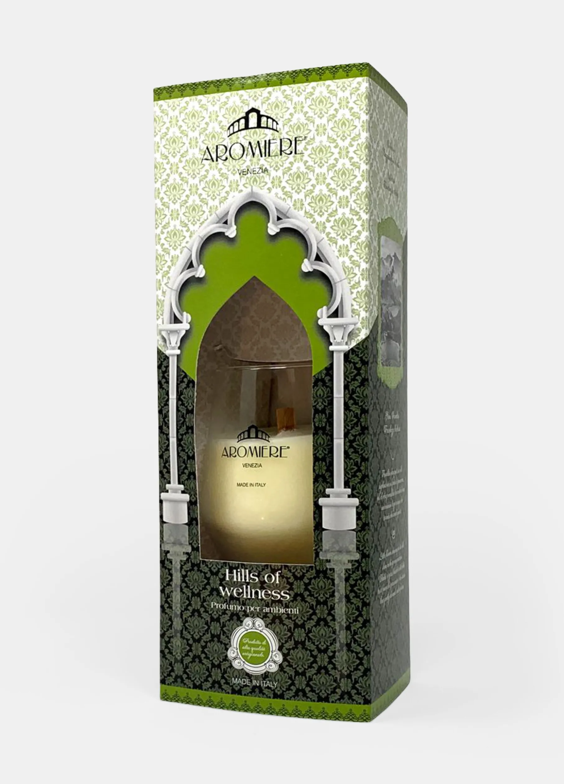 Candela in bicchiere Aromiere Venezia aroma “Hills of wellness”. Made in Italy. Dimensioni 12×27 cm.