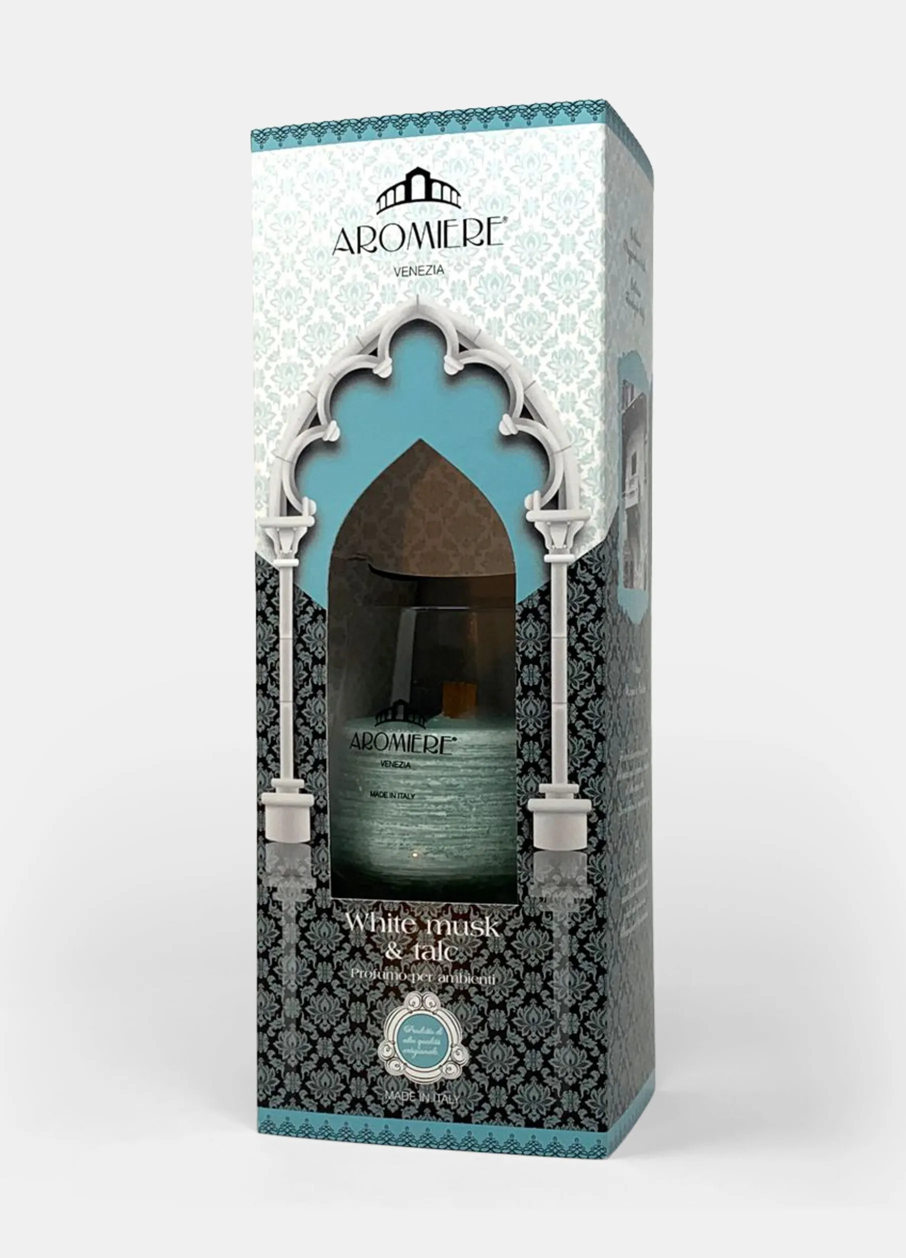 Candela in bicchiere Aromiere Venezia aroma “White musk & talc”. Made in Italy. Dimensioni 12×27 cm.