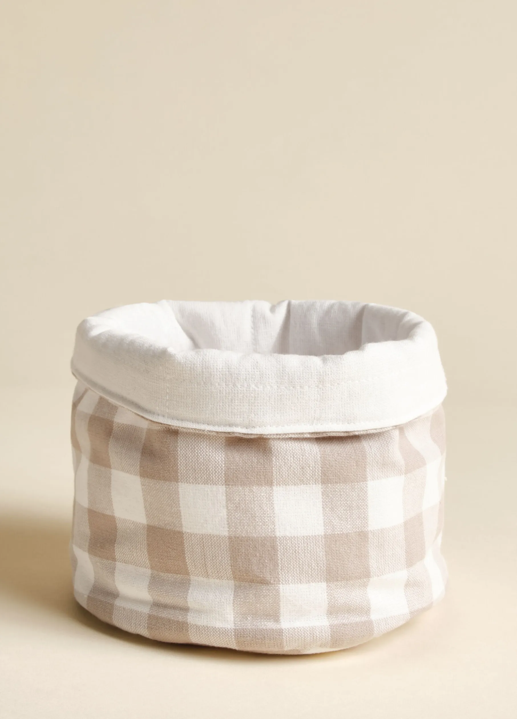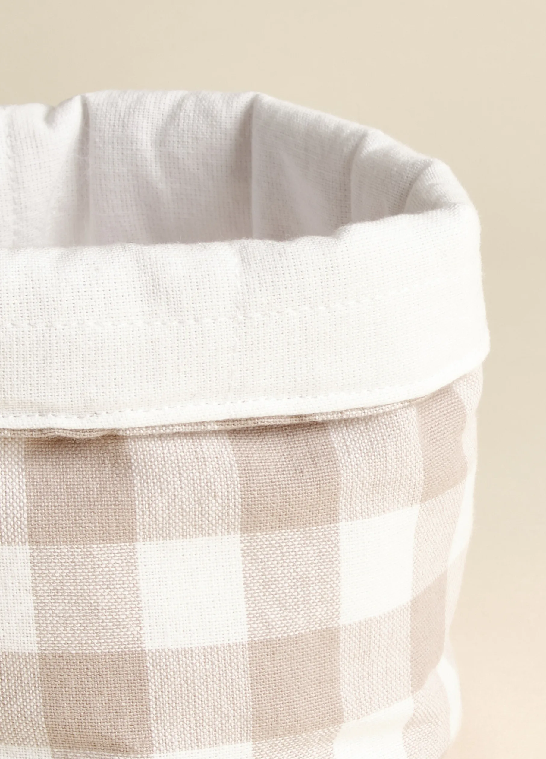 Cestino per pane e vivande realizzato in cotone morbido ma resistente, ottimo per l’utilizzo quotidiano. L’esterno con motivo bianco e beige a quadretti contrasta con l’interno bianco.
