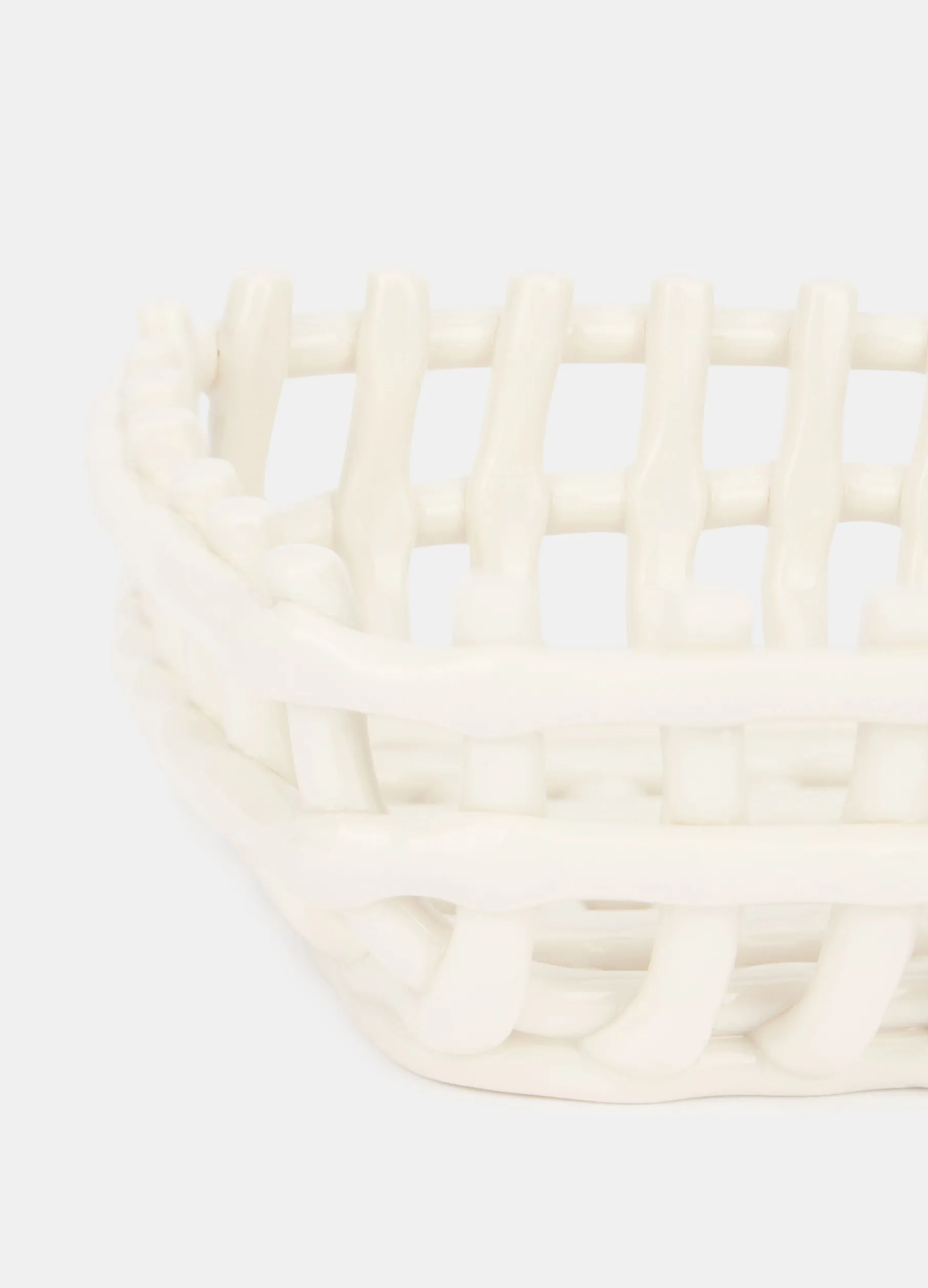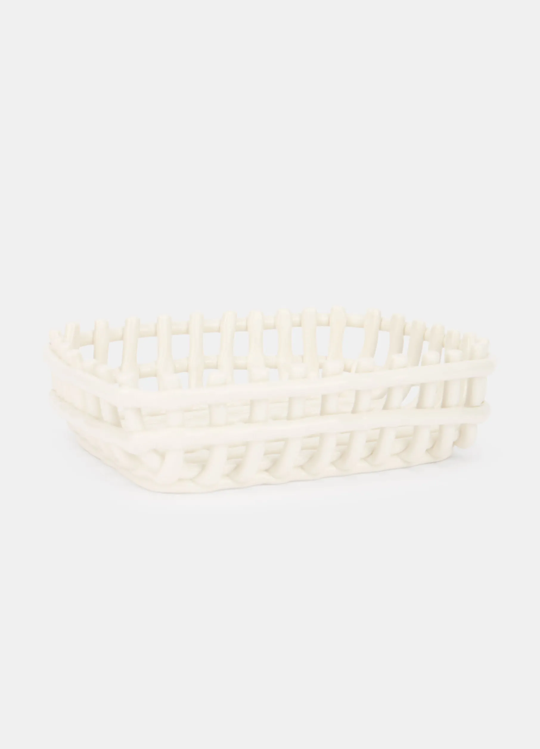 Cesto contenitore rettangolare realizzato in ceramica lucida bianco sporco con una particolare tecnica: il materiale duro e resistente è stato intrecciato e plasmato per assomigliare a un cestino tradizionale. Dimensioni: 16 x 21 x 5,3 cm.