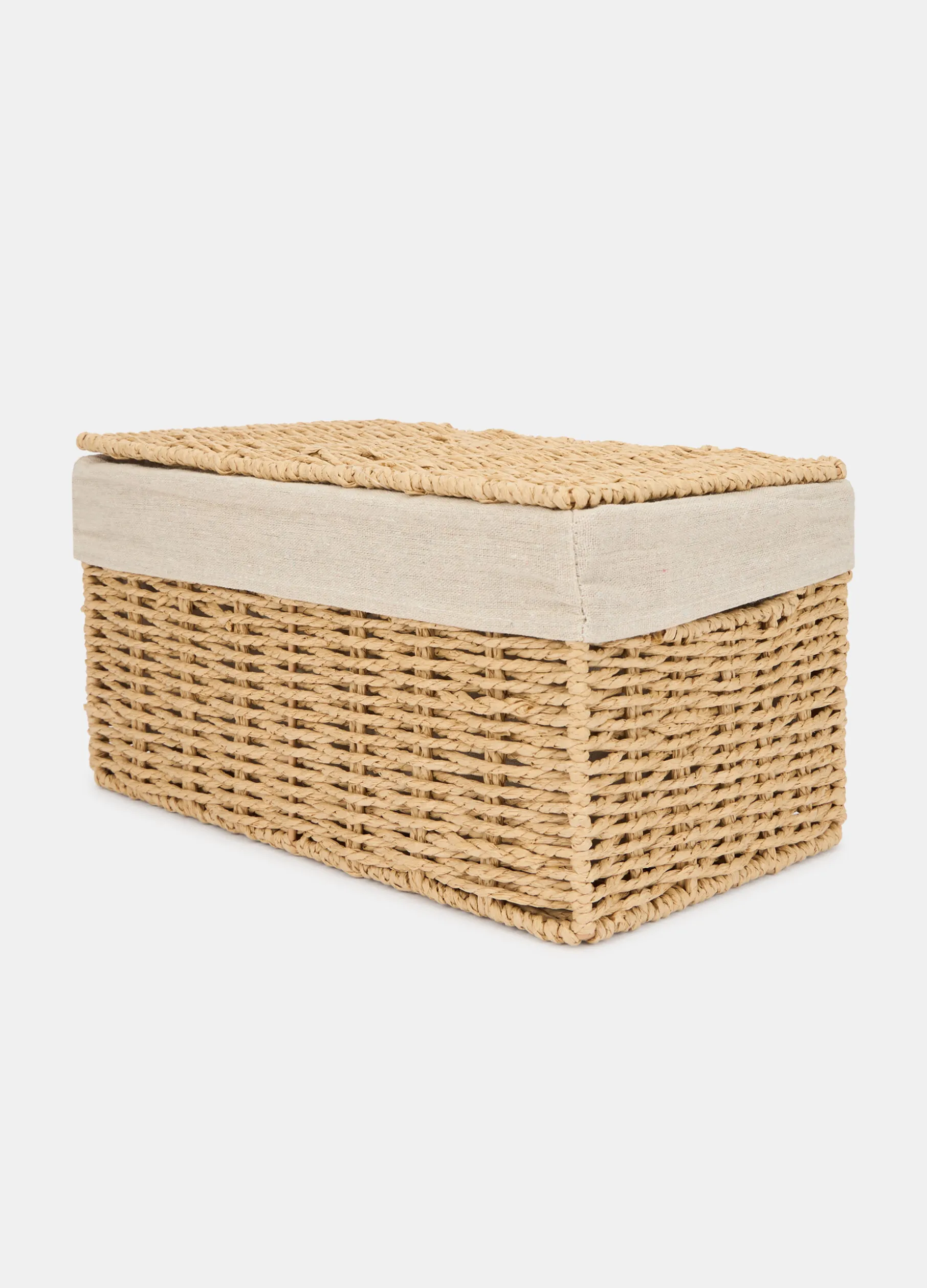 Cesto rettangolare con coperchio realizzato in raffia intrecciata, un materiale leggero dalla caratteristica colorazione marrone chiaro. L’interno è completato da una fodera in tessuto grezzo. Dimensioni: 35 x 18 x 20 cm.