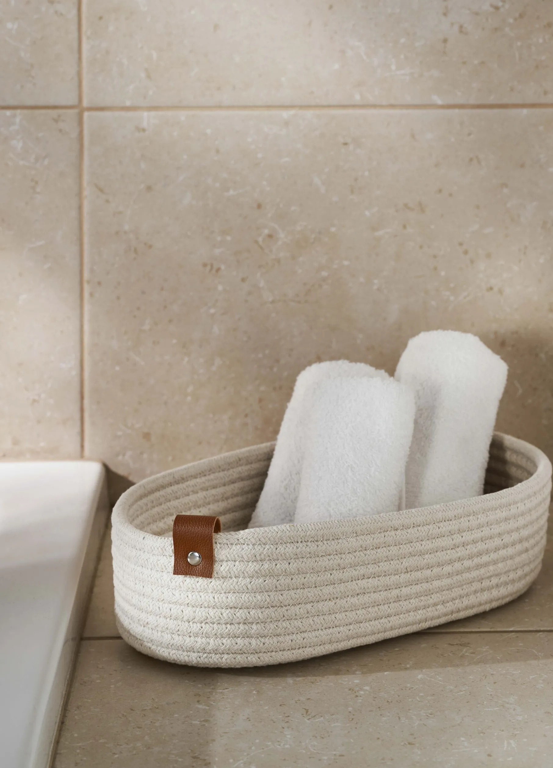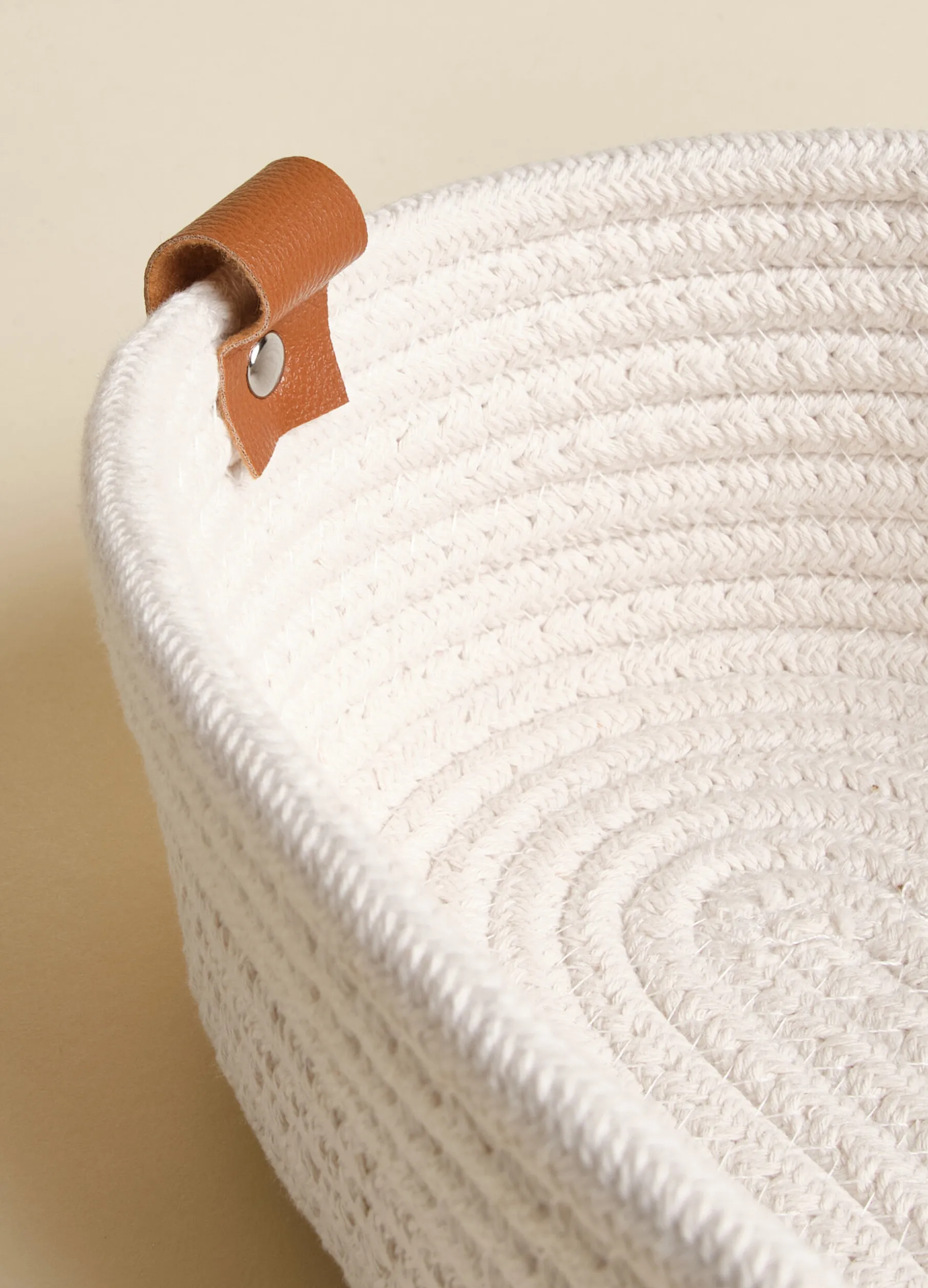 Cesto grande morbido di forma ovale in tessuto bianco avorio, realizzato intrecciando le fibre in una struttura a spirale. Completo di comodo gancio in pelle.