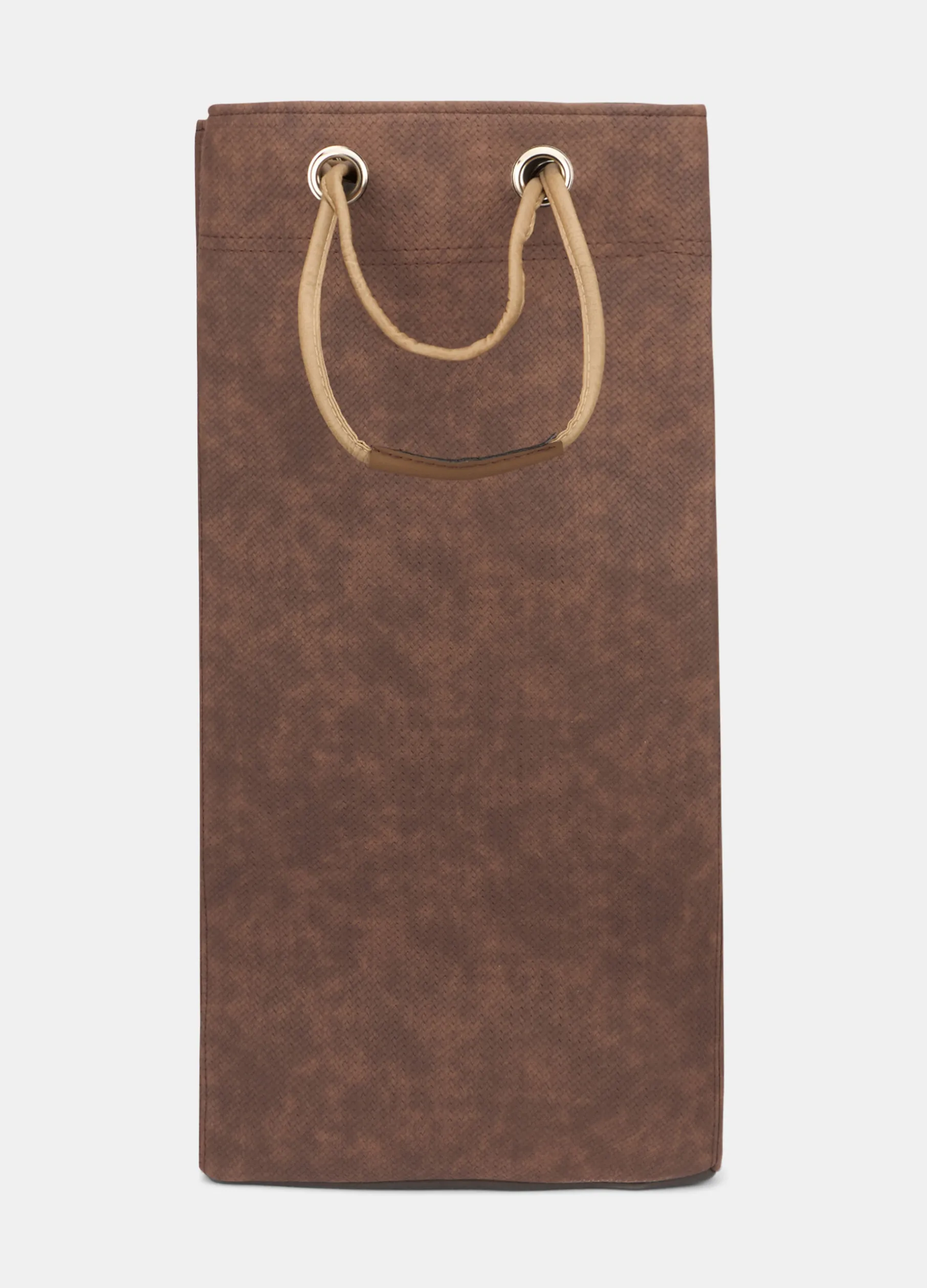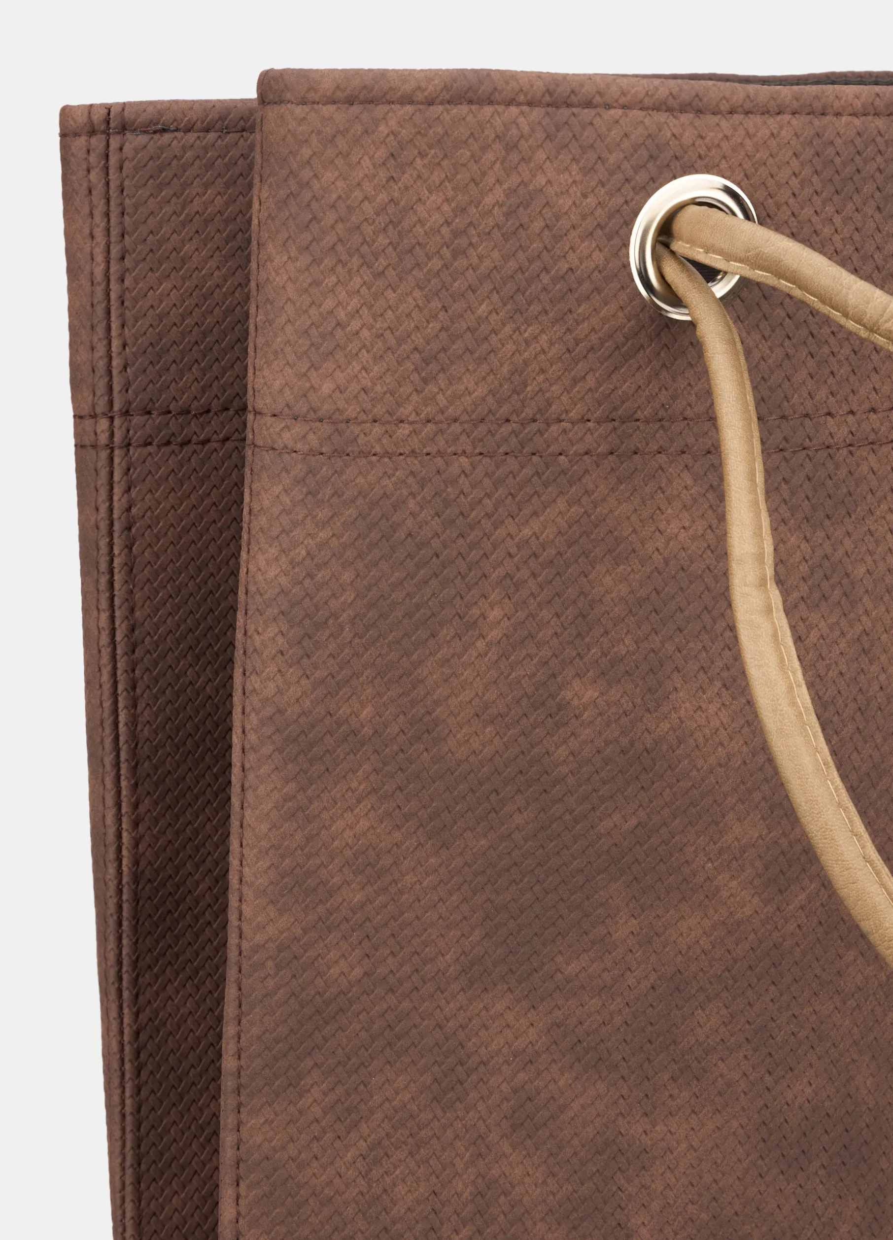 Cesto portabiancheria marrone senza coperchio in materiale intrecciato dalla caratteristica texture liscia e vellutata e da una colorazione irregolare. All’interno è foderato in tessuto tecnico ed è completato da manici in ECOpelle. Dimensioni: 35 x 68 x 27 cm.