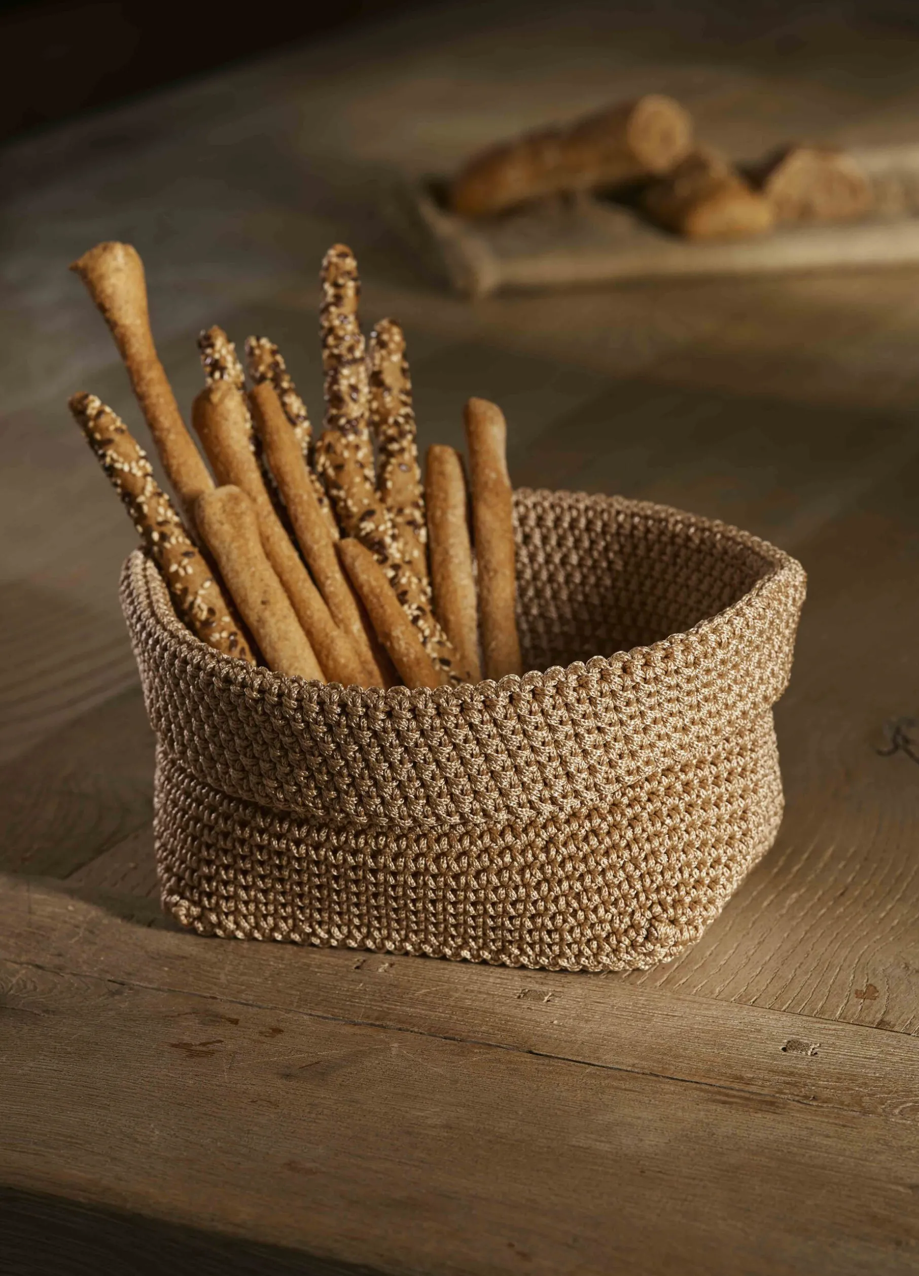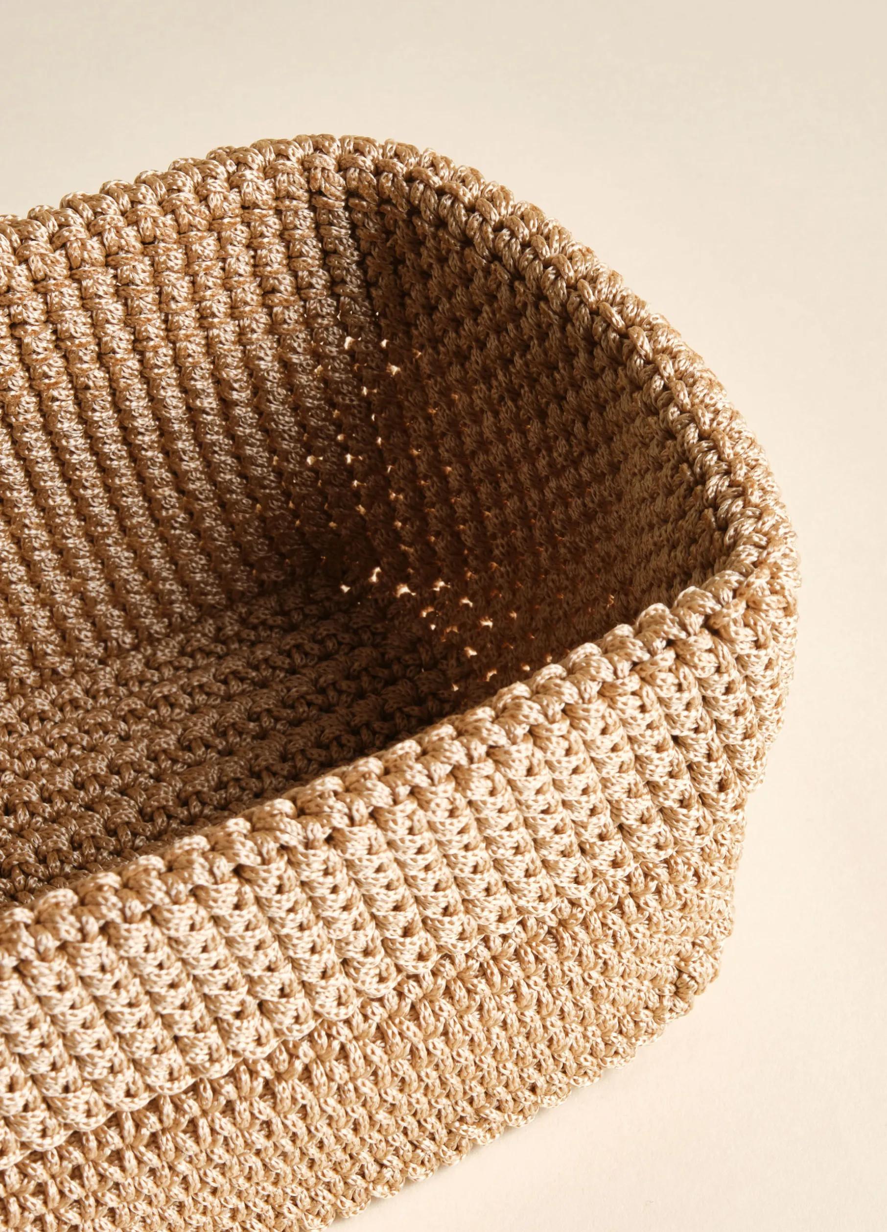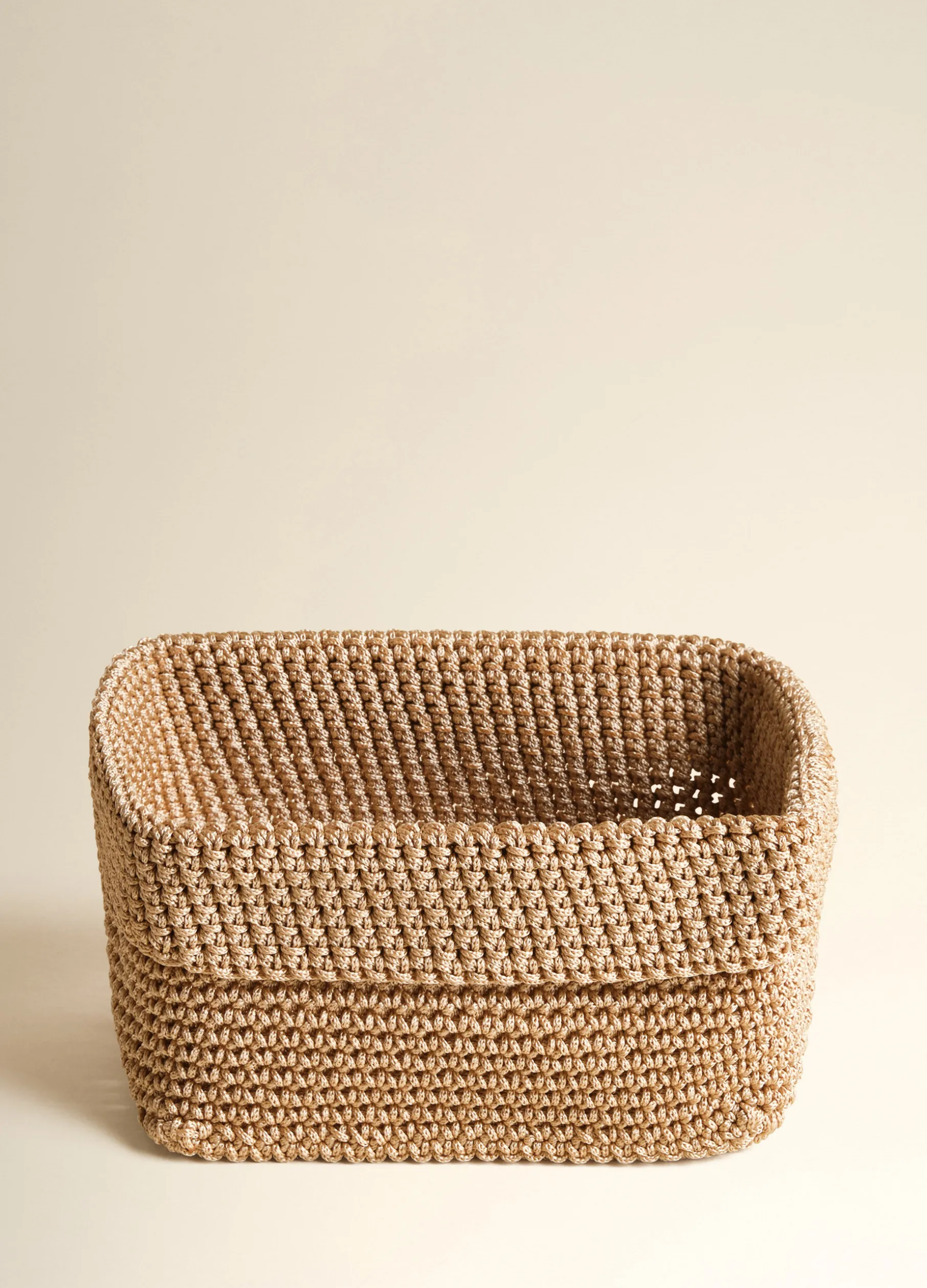 Cesto morbido di forma rettangolare realizzato intrecciando fibre spesse di un materiale pratico e resistente, di colore beige. Con risvolto nella parte superiore.