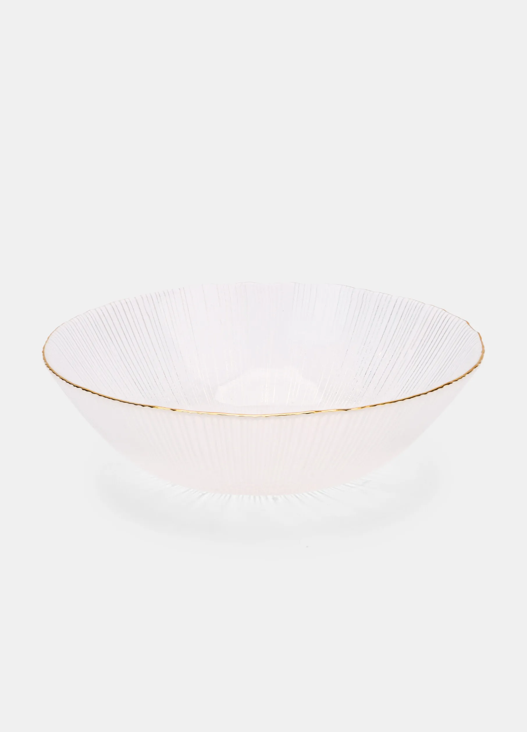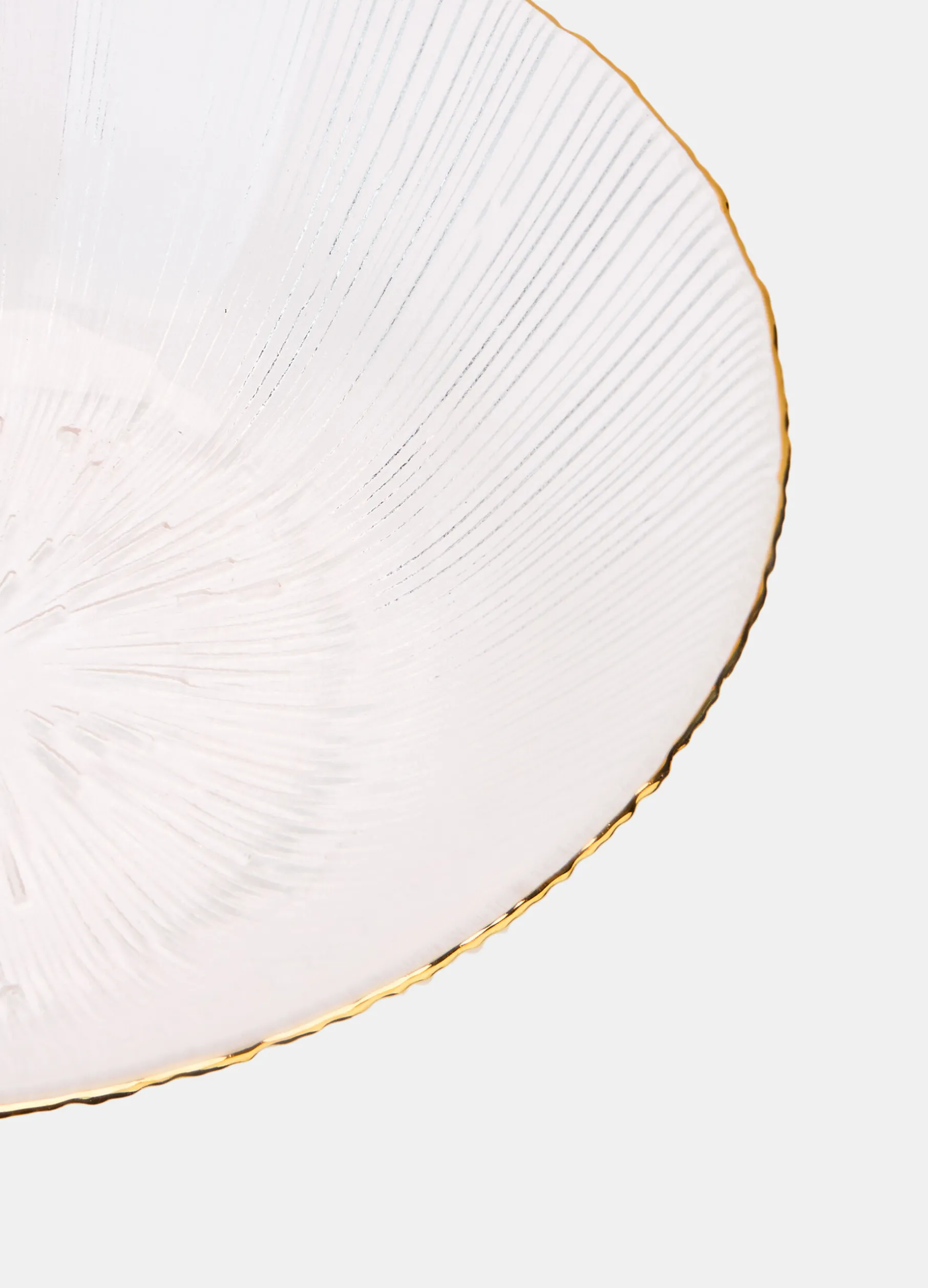 Elegante ciotola in vetro trasparente, arricchita dalla delicata scanalatura che parte dal centro estendendosi a raggiera e dal bordo dorato, che illumina tutto l’accessorio. Altezza; 7 cm; diametro: 25 cm.