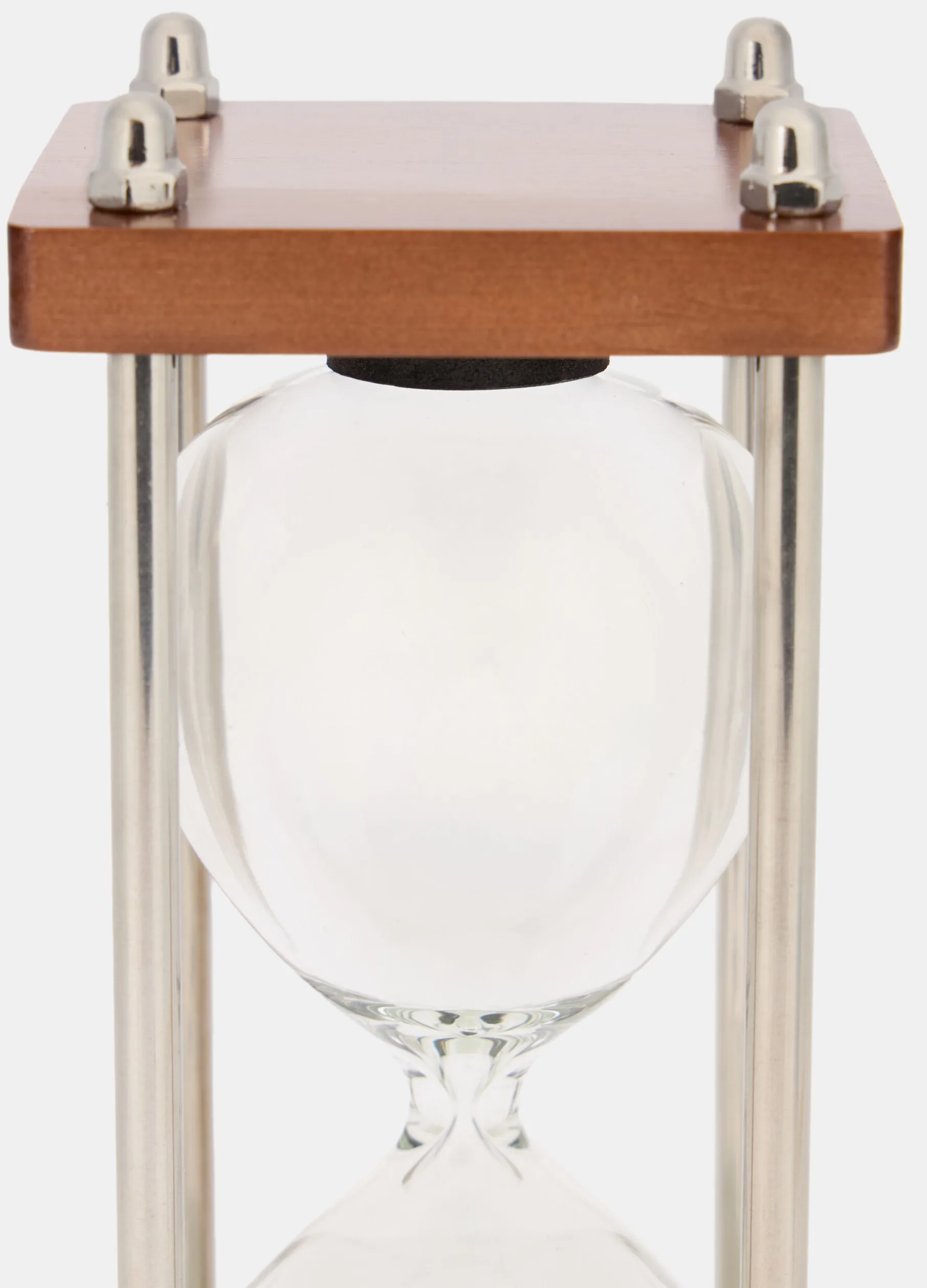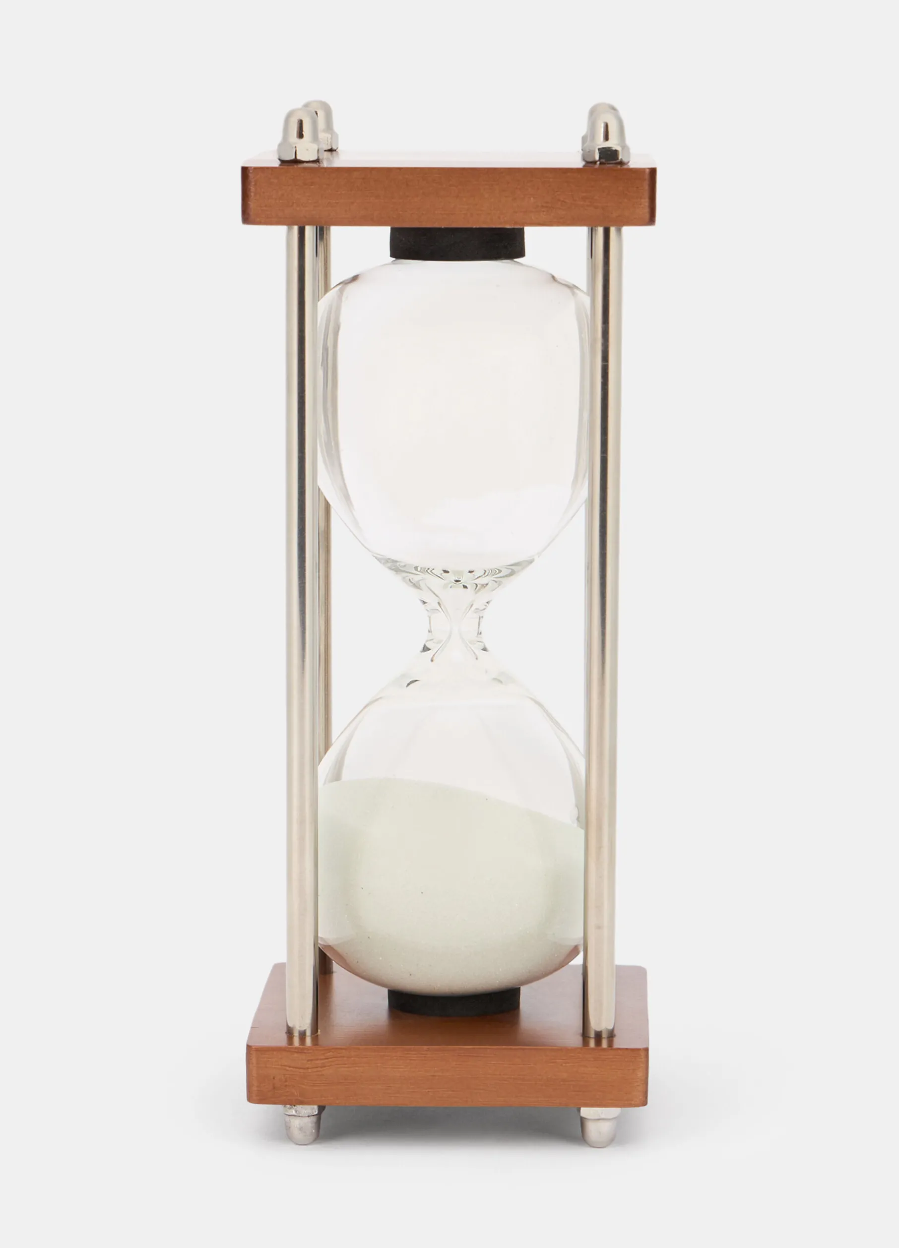Clessidra in vetro trasparente che arreda con gusto ed eleganza grazie anche alla struttura in cui è inserita: due basi in legno color noce completate da sostegni in metallo lucido, per una combinazione di materiali ricercata. Altezza: 19,5 cm; diametro: 7,5 cm.