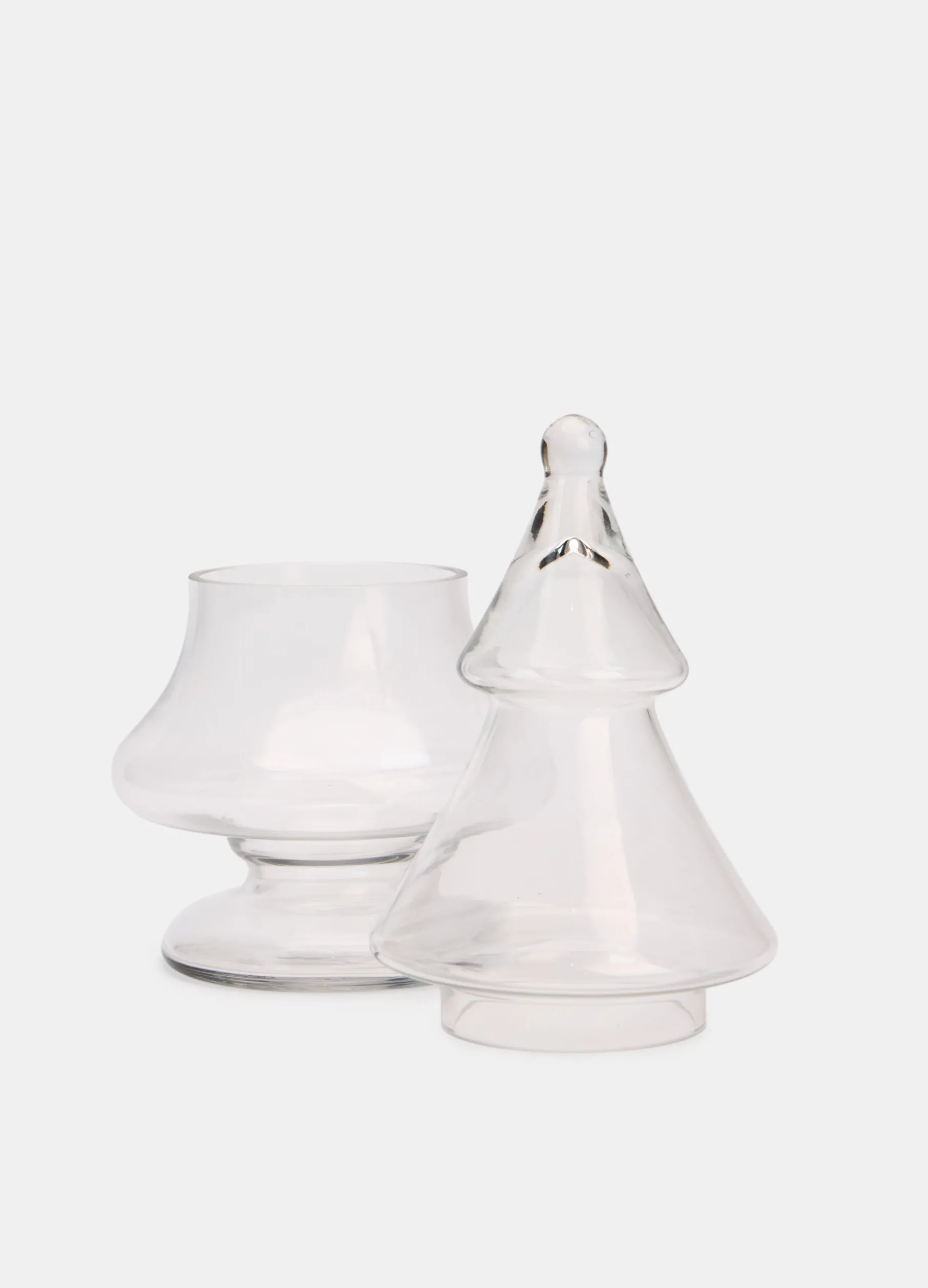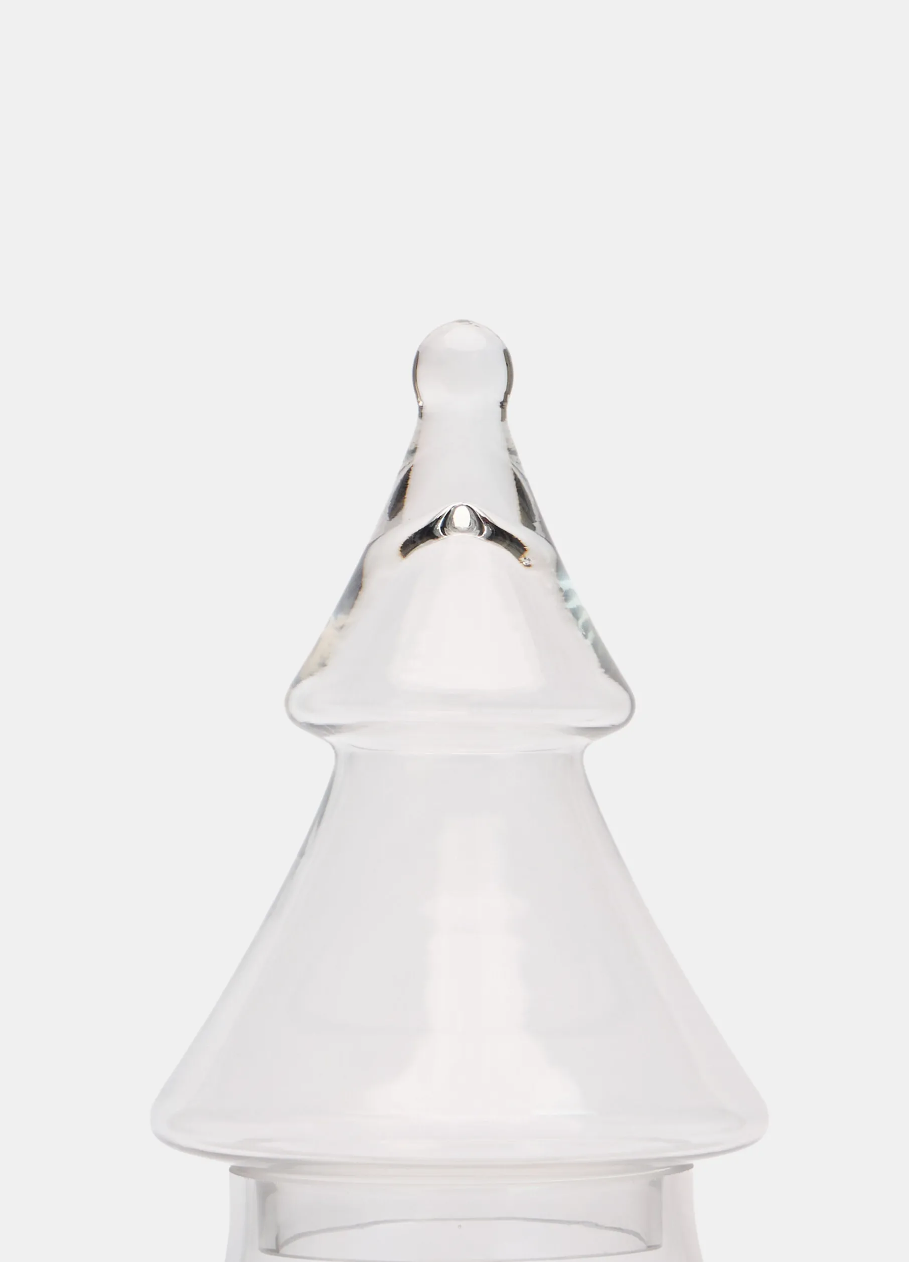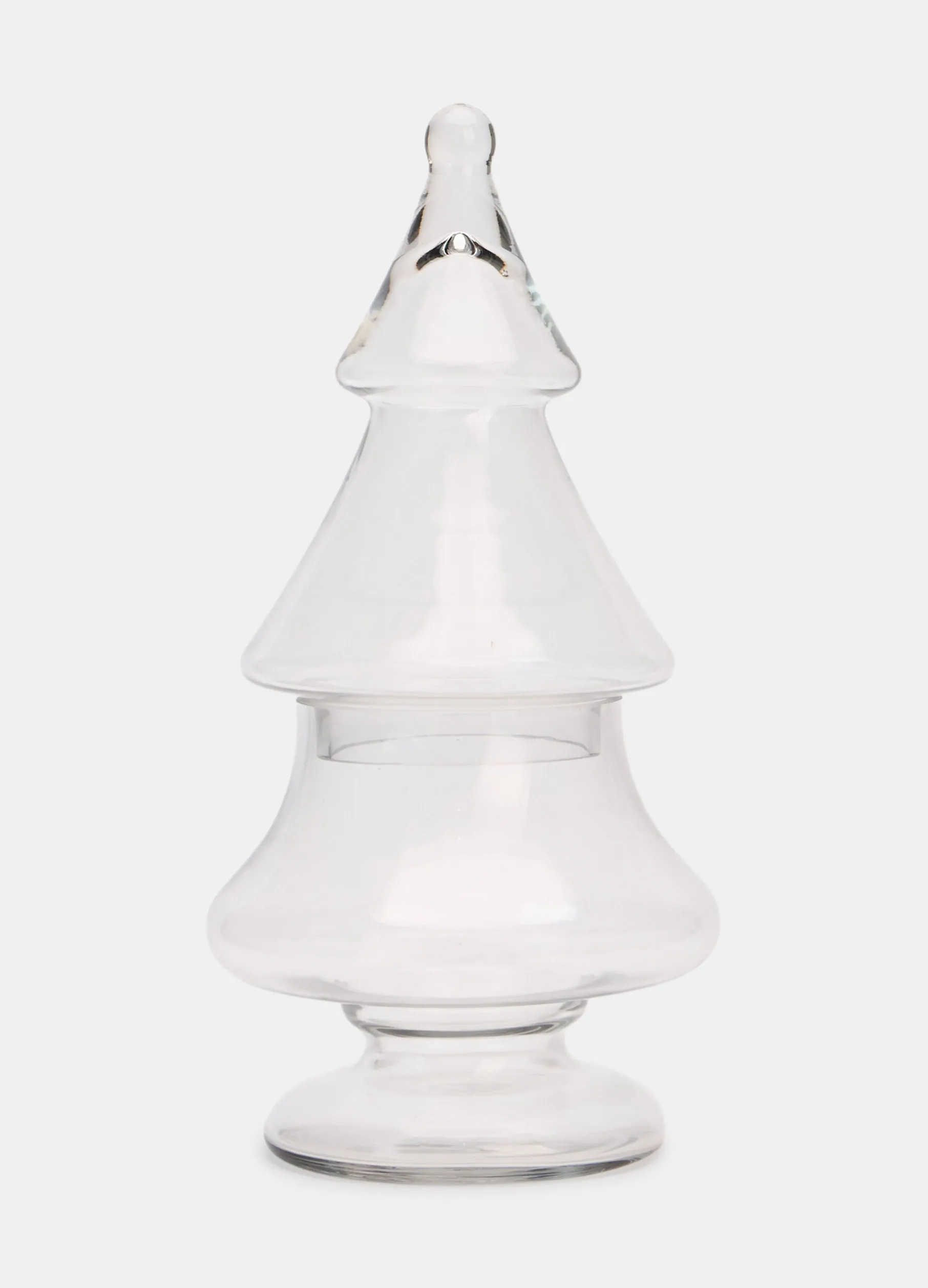 Contenitore in vetro trasparente composto da base e coperchi a riprodurre la silhouette iconica di un albero di Natale, perfetto per rallegrare l’atmosfera casalinga nel periodo delle feste. Altezza: 32 cm.