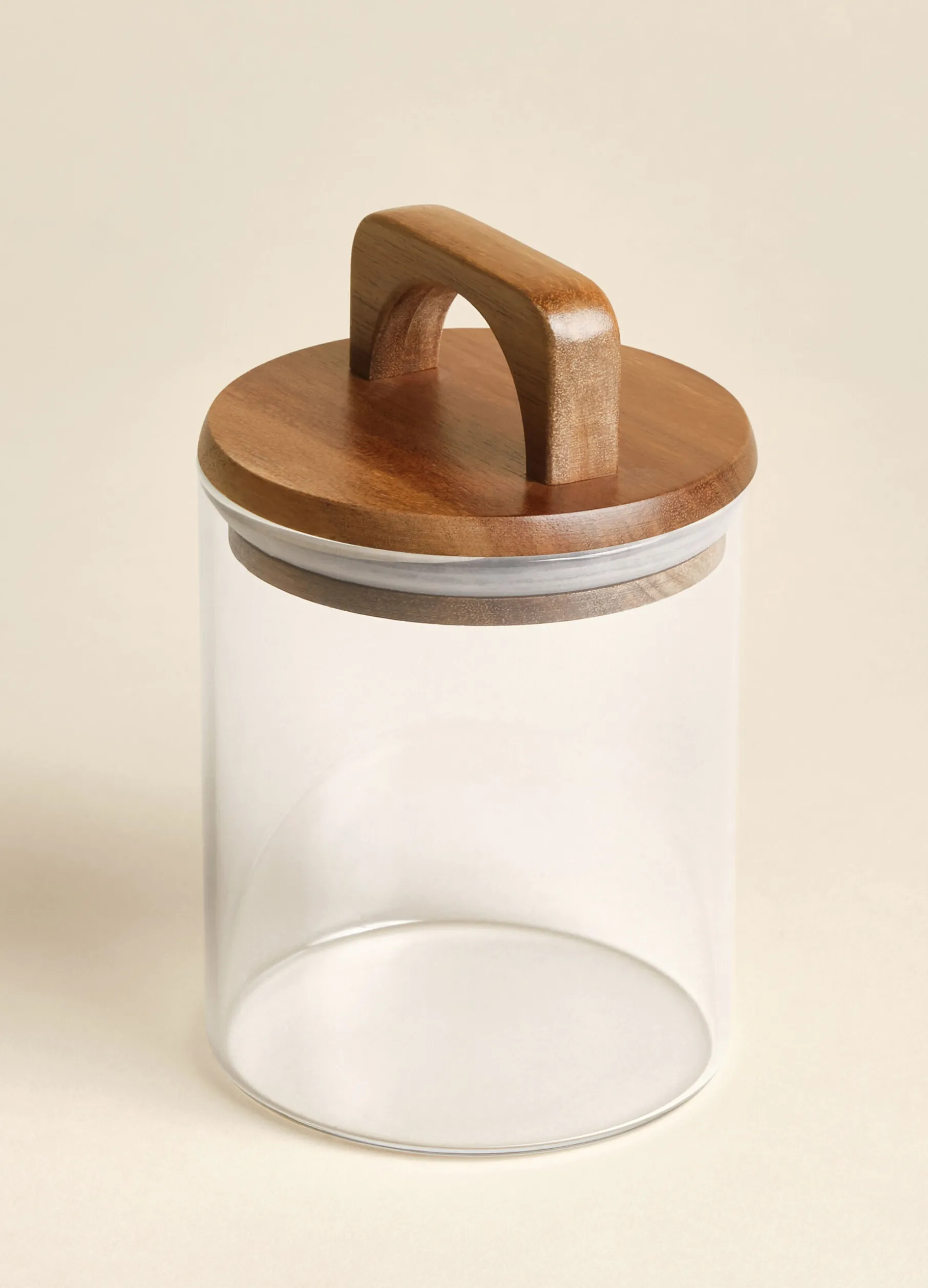 Contenitore cilindrico per alimenti composto da una base in vetro trasparente e dal coperchio in legno scuro con manico. La fascia in gomma all’interno del coperchio garantisce una chiusura ermetica. Altezza: 12 cm; diametro: 10 cm.