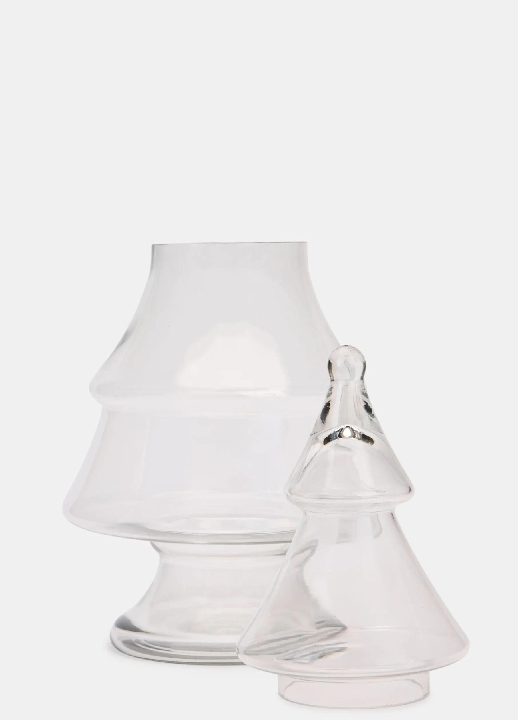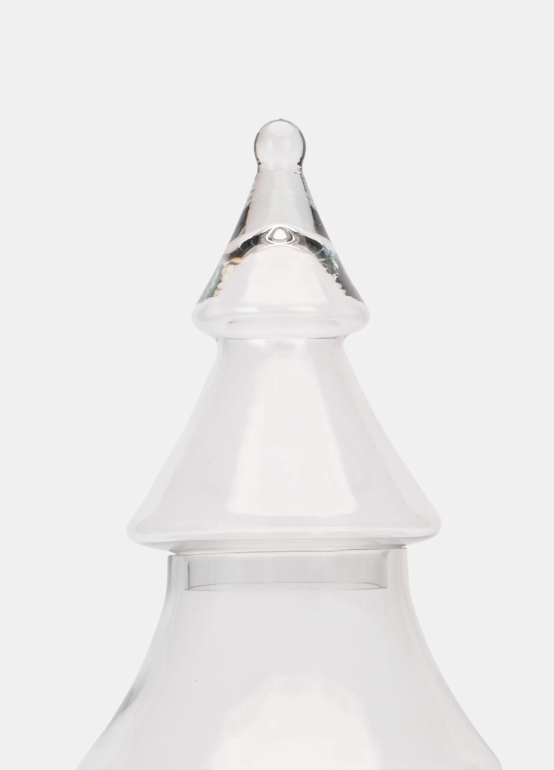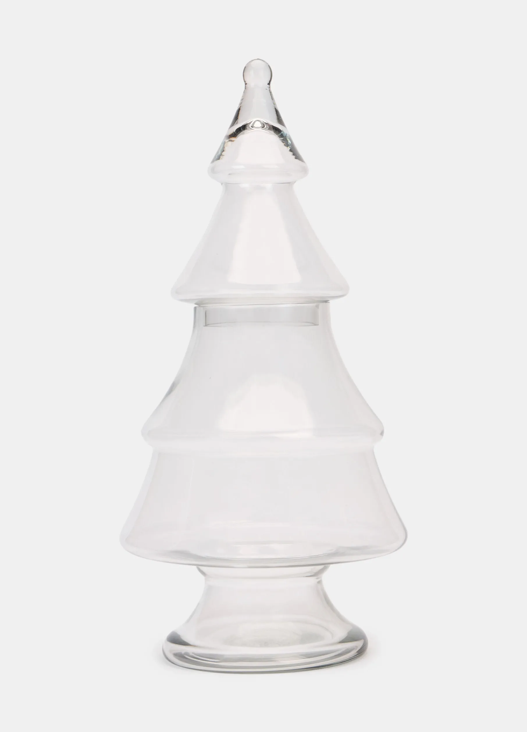 Contenitore grande in vetro trasparente composto da base e coperchi a riprodurre la silhouette iconica di un albero di Natale, perfetto per rallegrare l’atmosfera casalinga nel periodo delle feste. Altezza: 50,5 cm.