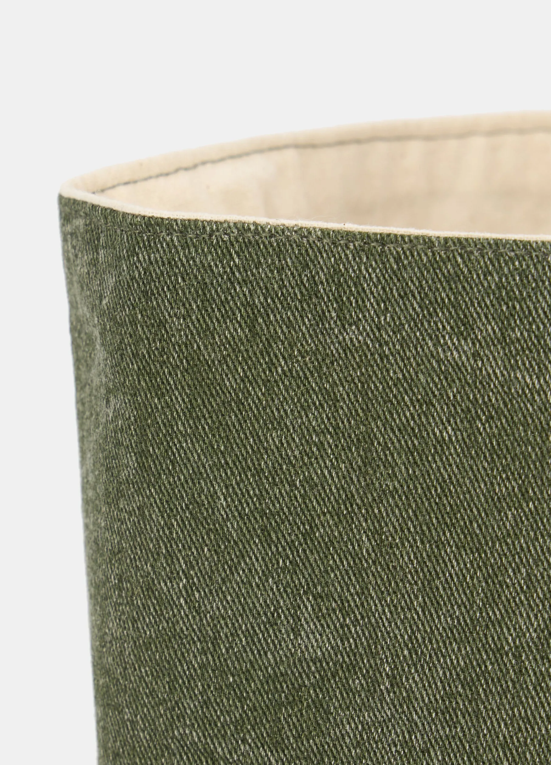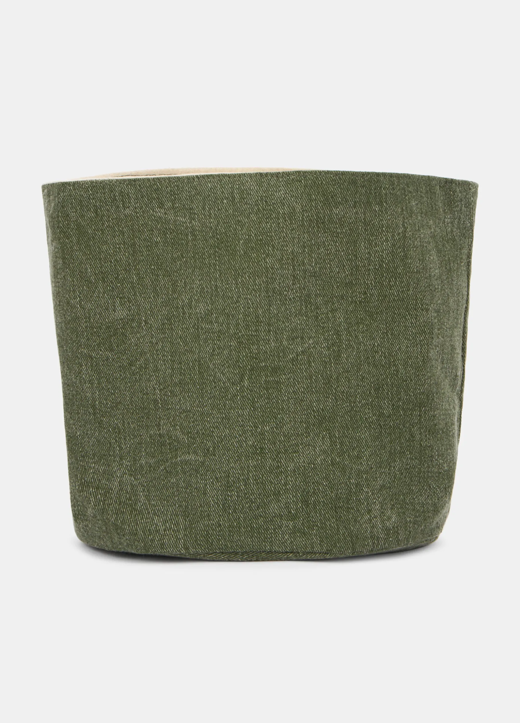 Contenitore morbido verde scuro realizzato in cotone lavato: la particolare lavorazione di questo tessuto ricorda l’aspetto del denim, con una texture liscia e una colorazione sfumata. Completo di fodera interna a contrasto. Diametro: 16 cm; altezza: 16 cm.