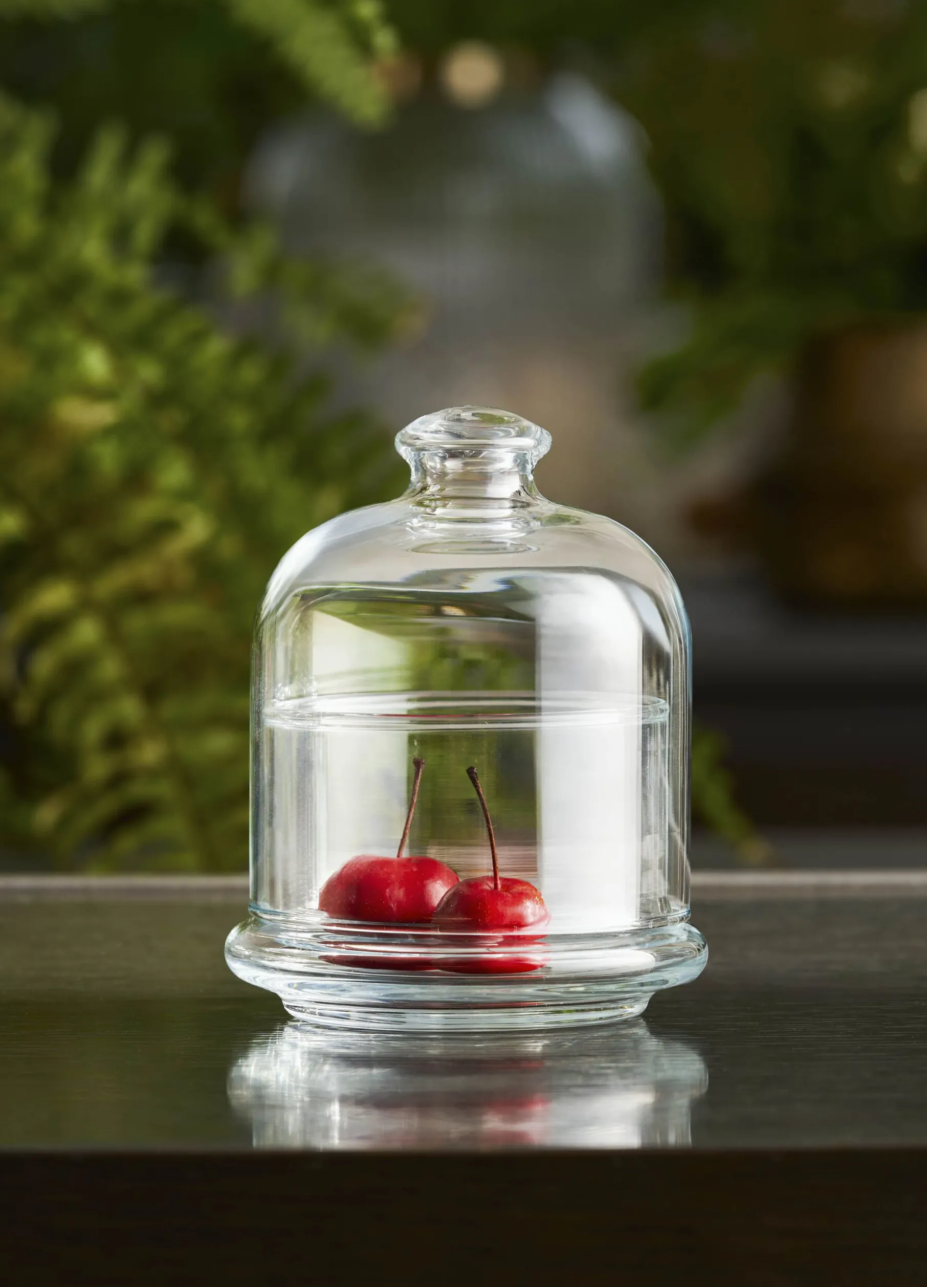 Contenitore in vetro con cupola. Dimensioni 9×11 cm.