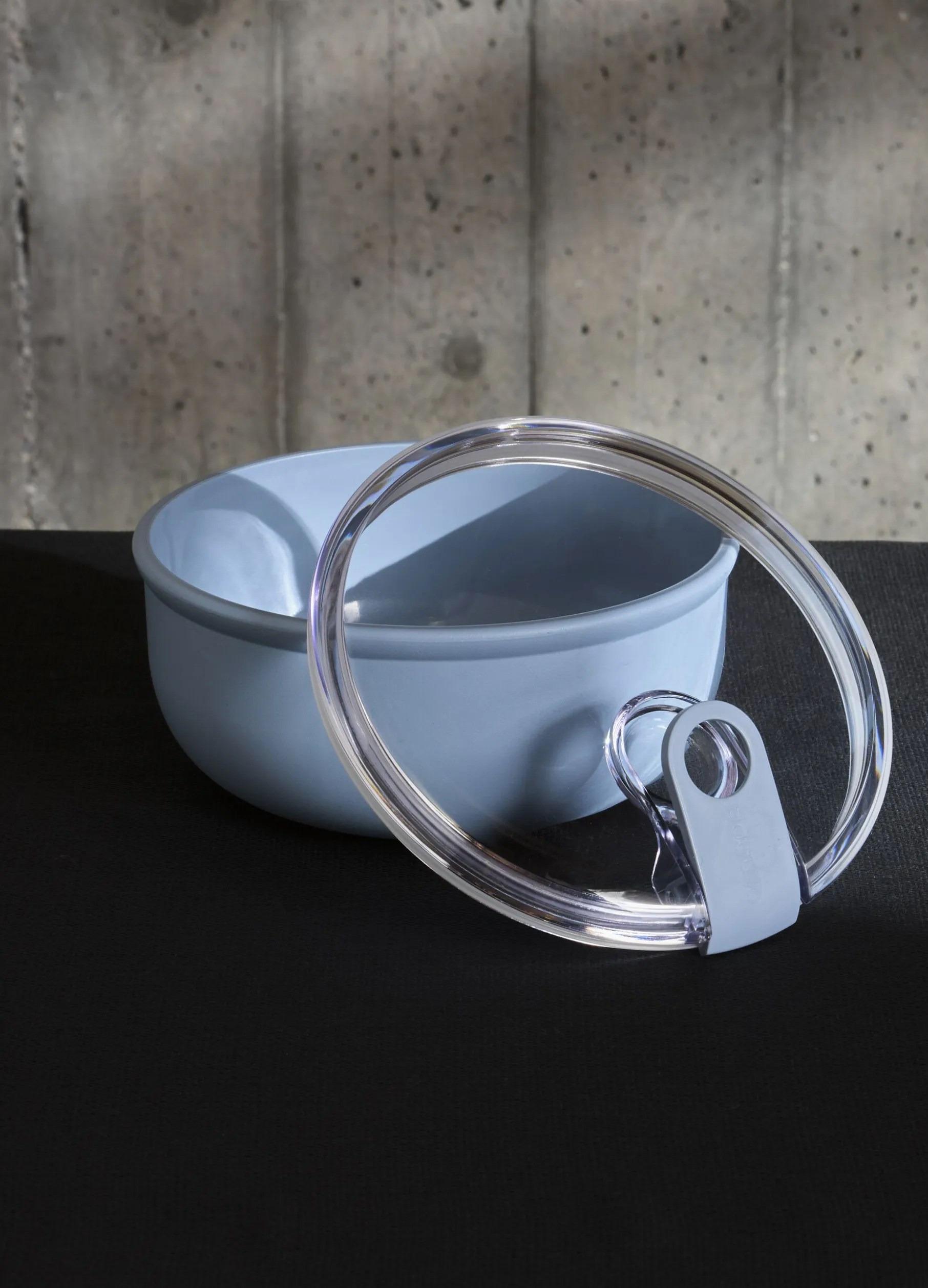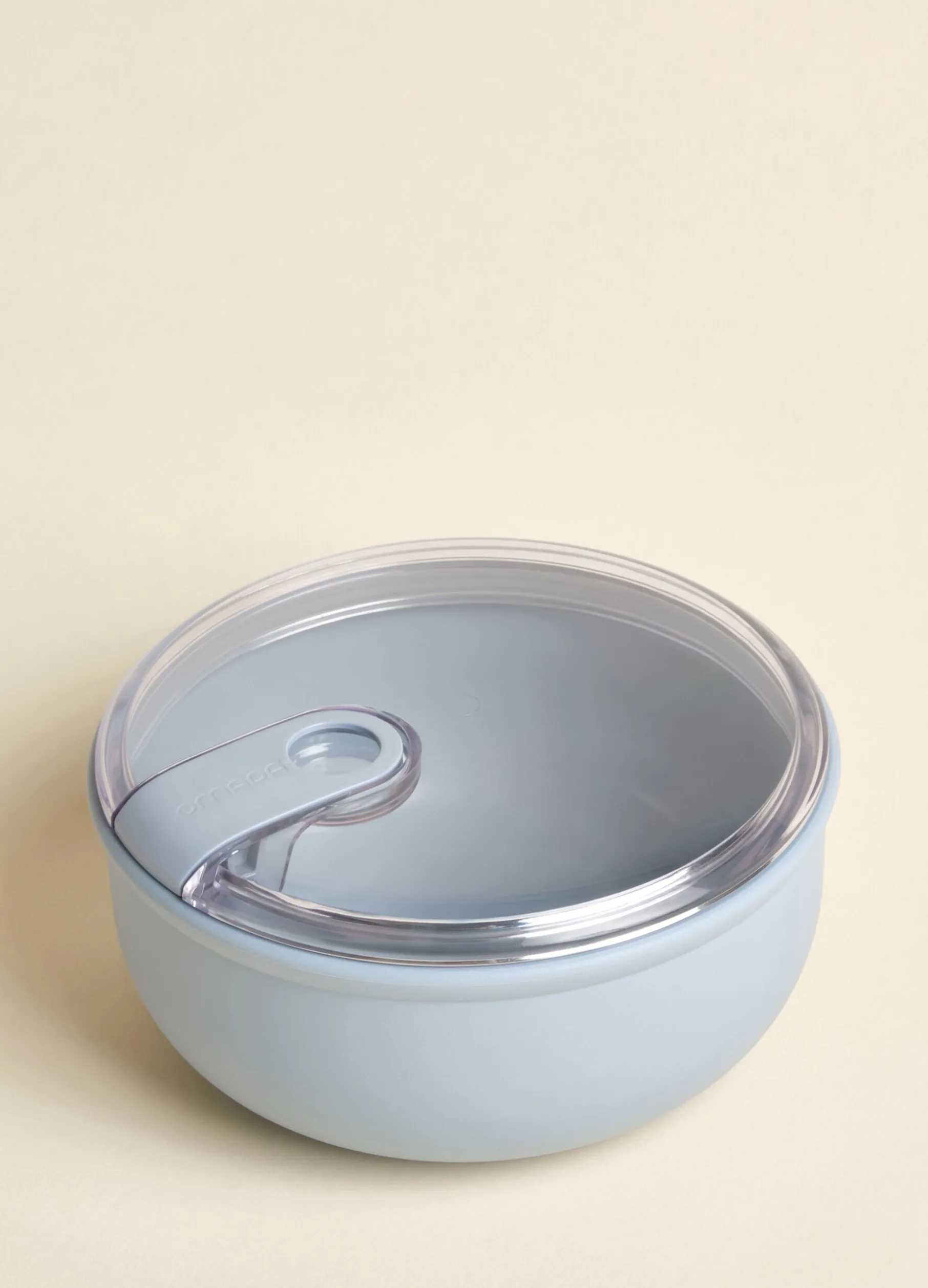 Contenitore rotondo, in versione medium, in materiale plastico realizzato in Italia. Versatile e resistente, ha una base azzurro chiaro a tinta unita e un coperchio trasparente con foro richiudibile.