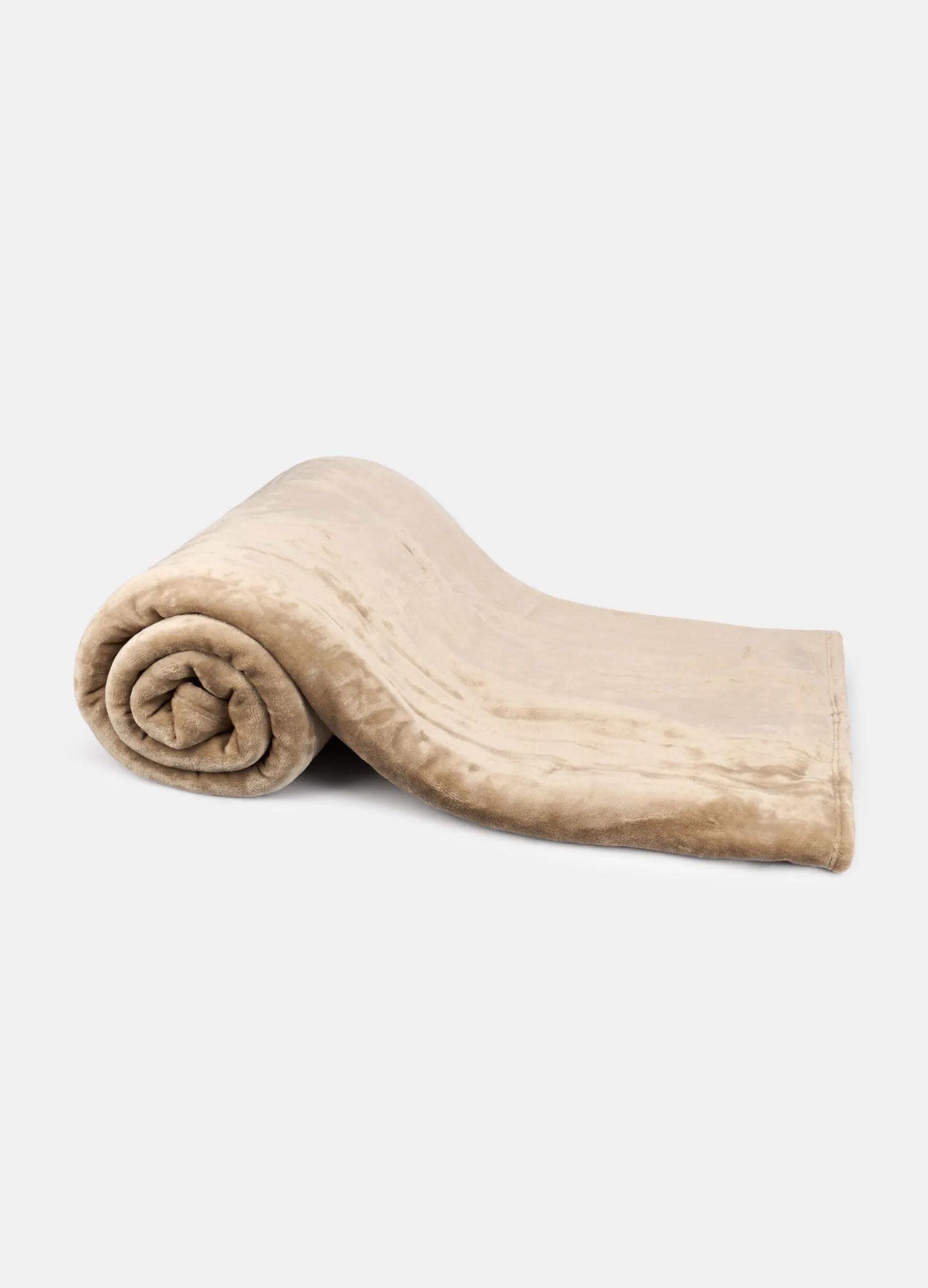 Coperta marrone a due piazze, ideale per letto matrimoniale, di medio spessore e rifinita lungo tutti i bordi con un orlo cucito. Il materiale effetto peluche è morbido e avvolgente, perfetto per garantire un riposo confortevole. Dimensioni: 250 x 210 cm.