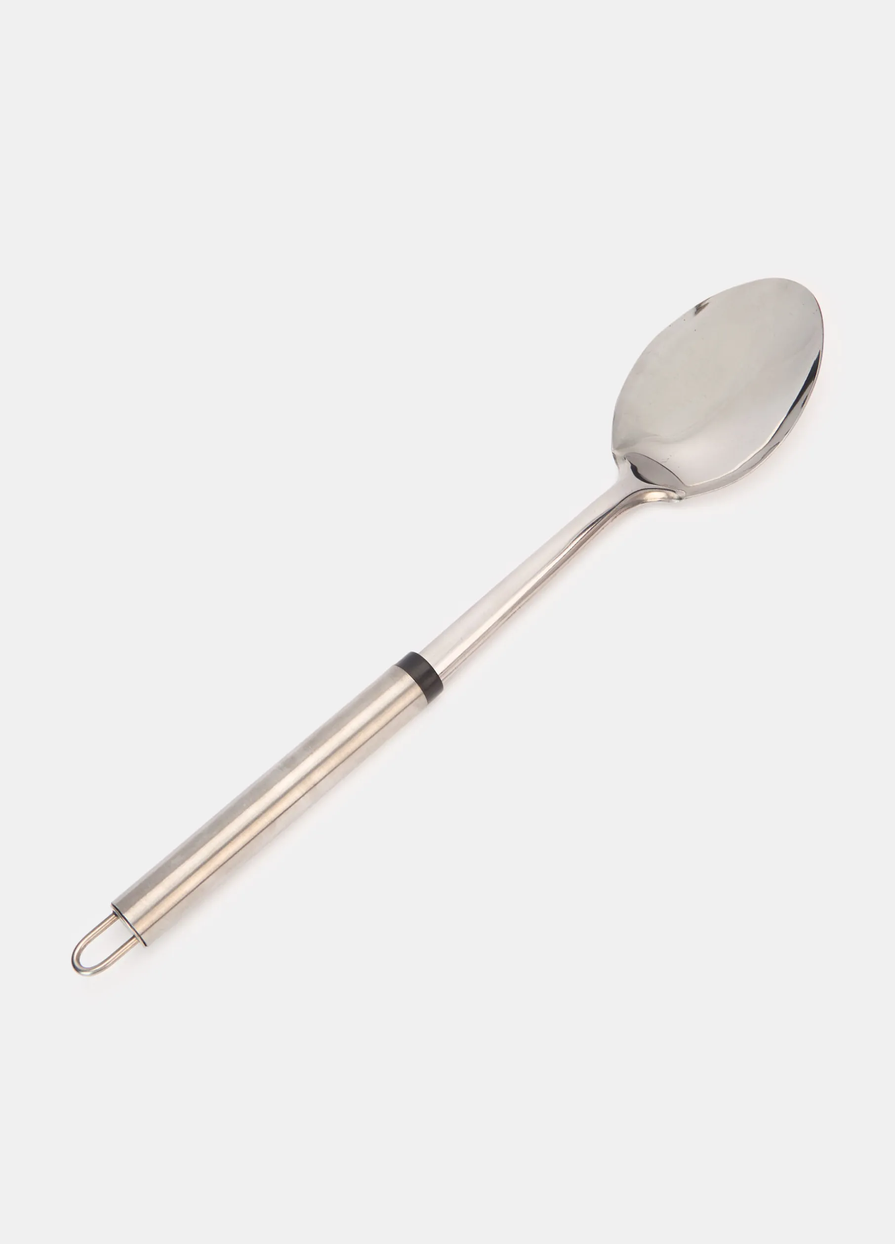 Cucchiaio grande da cucina in puro acciaio dalla superficie lucida e liscia, con manico rinforzato e gancetto per appenderlo comodamente alle pareti o sopra i fornelli.
