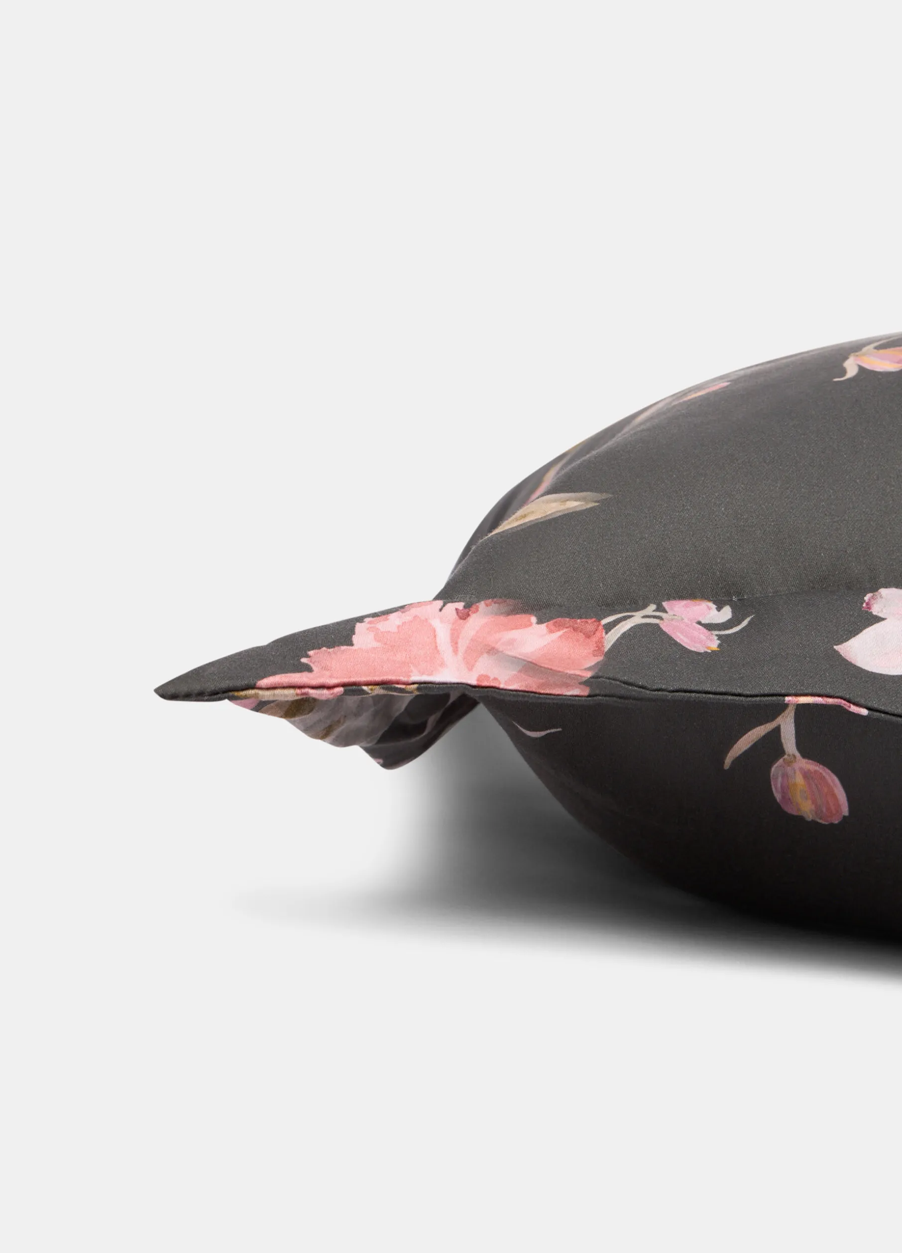 Cuscino nero quadrato con volant largo, dedicato all’arredamento della zona living o della camera da letto e realizzato in puro raso di cotone a fiori. La particolare tessitura del filato rende questo tessuto liscio e fresco al tatto, e luminoso, perfetto per garantire comfort e riposo. Dimensioni: 50 x 50.