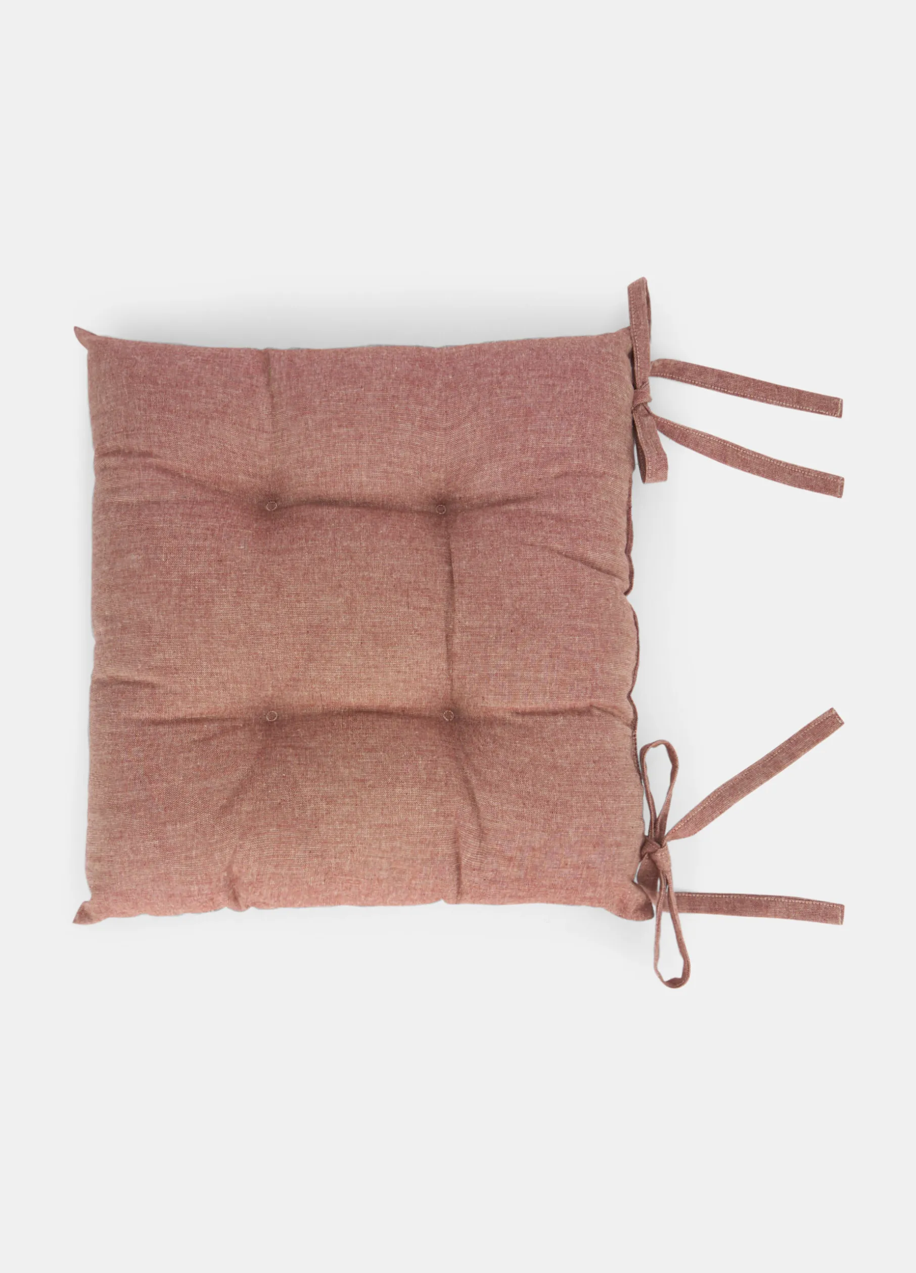 Cuscino quadrato per sedie da cucina in puro cotone rosso mattone con una caratteristica texture fiammata che regala al tessuto un effetto fiammato. È imbottito e trapuntato per un comfort massimo e presenta due laccetti per fissarlo alla sedia. Dimensioni: 40 x 40 cm.