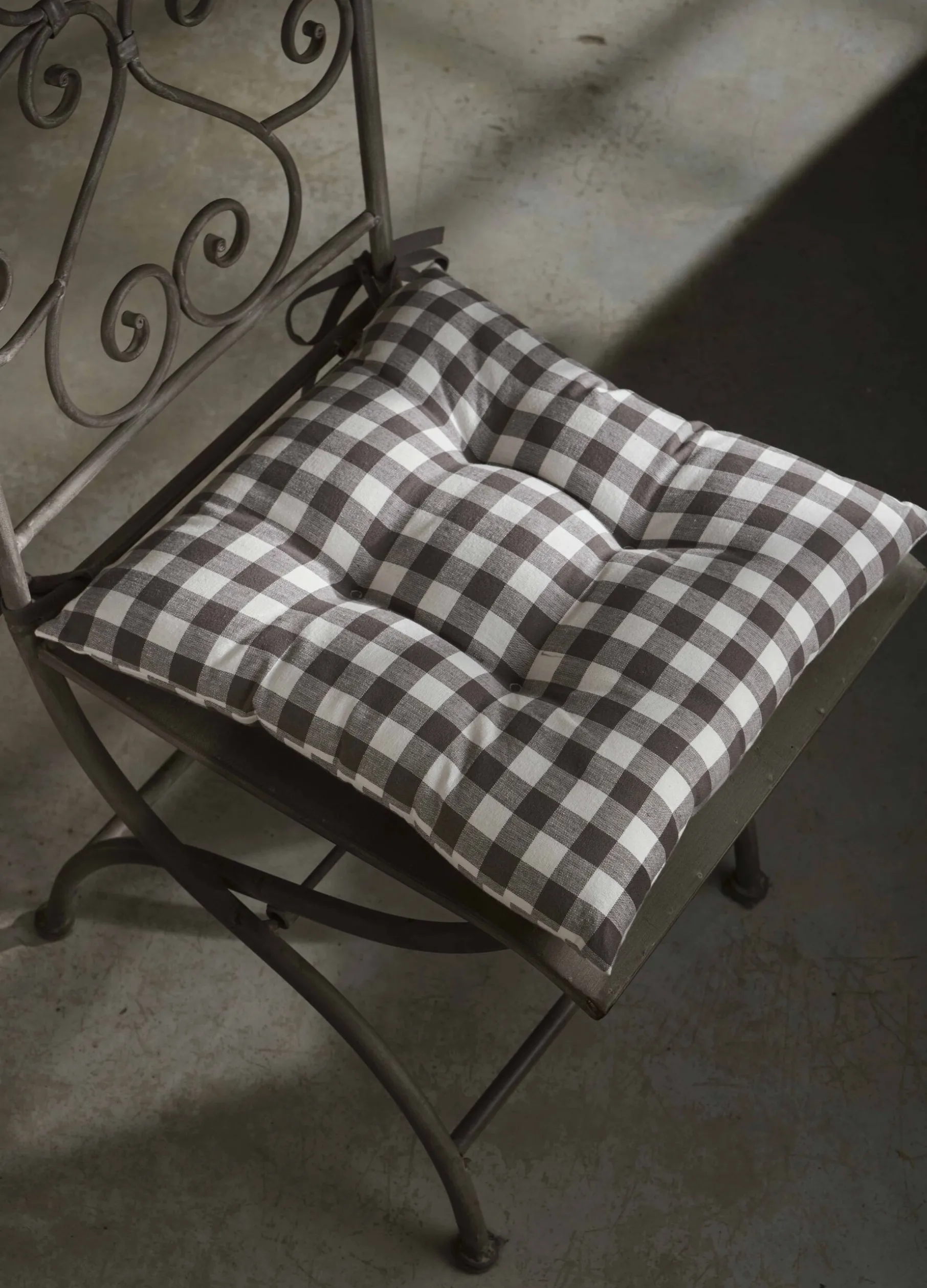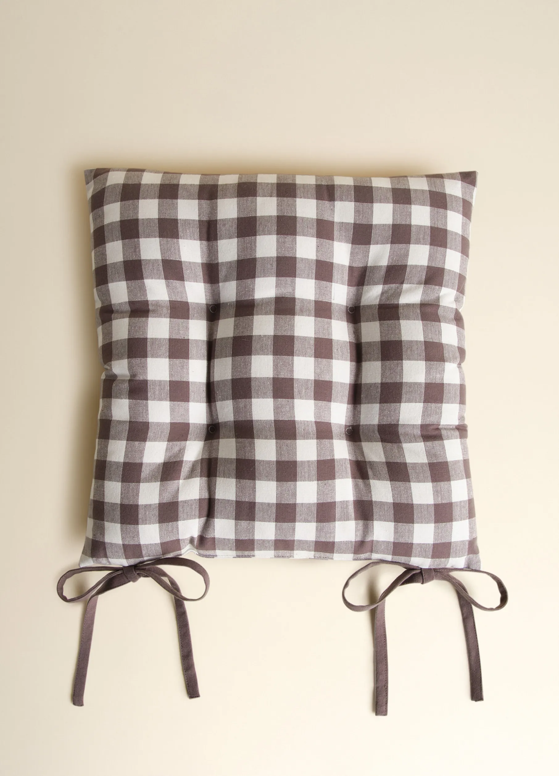 Cuscino coprisedia quadrato realizzato in puro cotone a quadretti bianchi e marrone, dallo stile rustico e accogliente. Completo di imbottitura e laccetti.