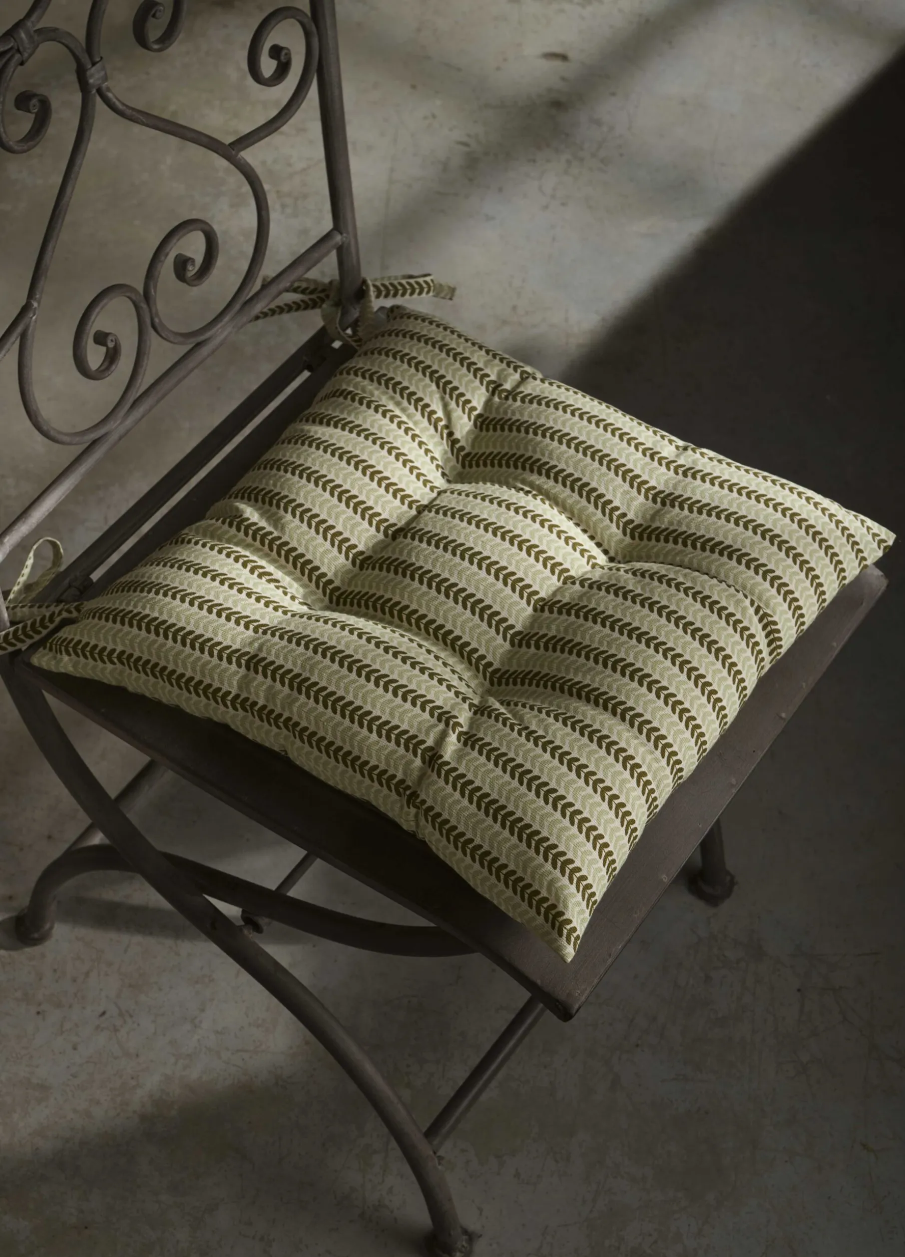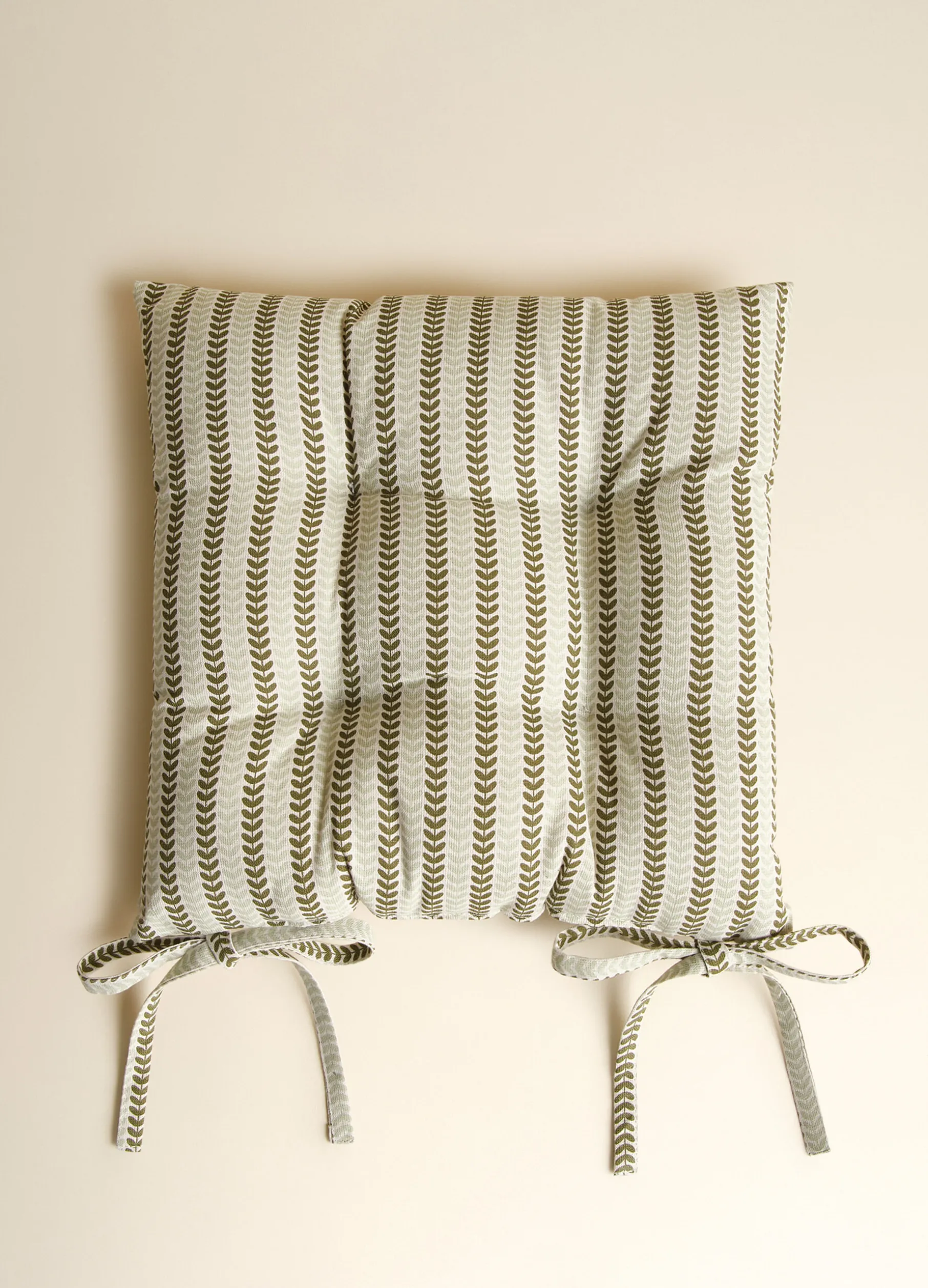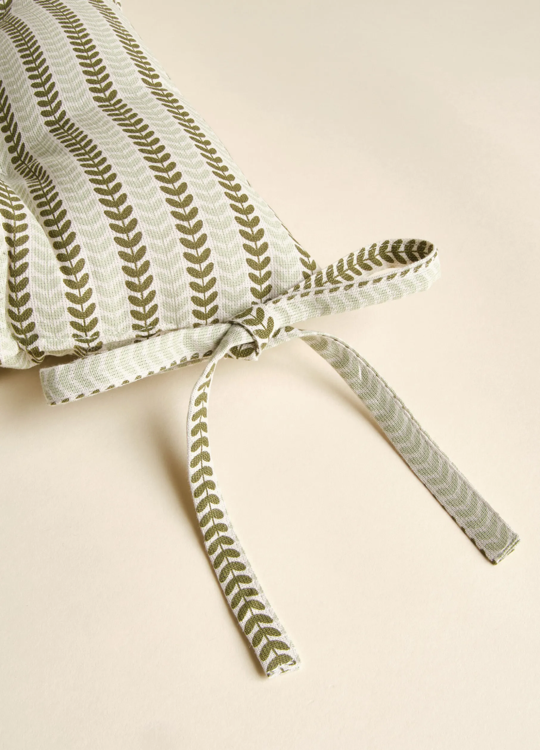 Cuscino coprisedia 40×40 cm quadrato con stampa foglie all over. Laccetti per chiusura. Esterno in puro cotone. Linea ECO by Croff.