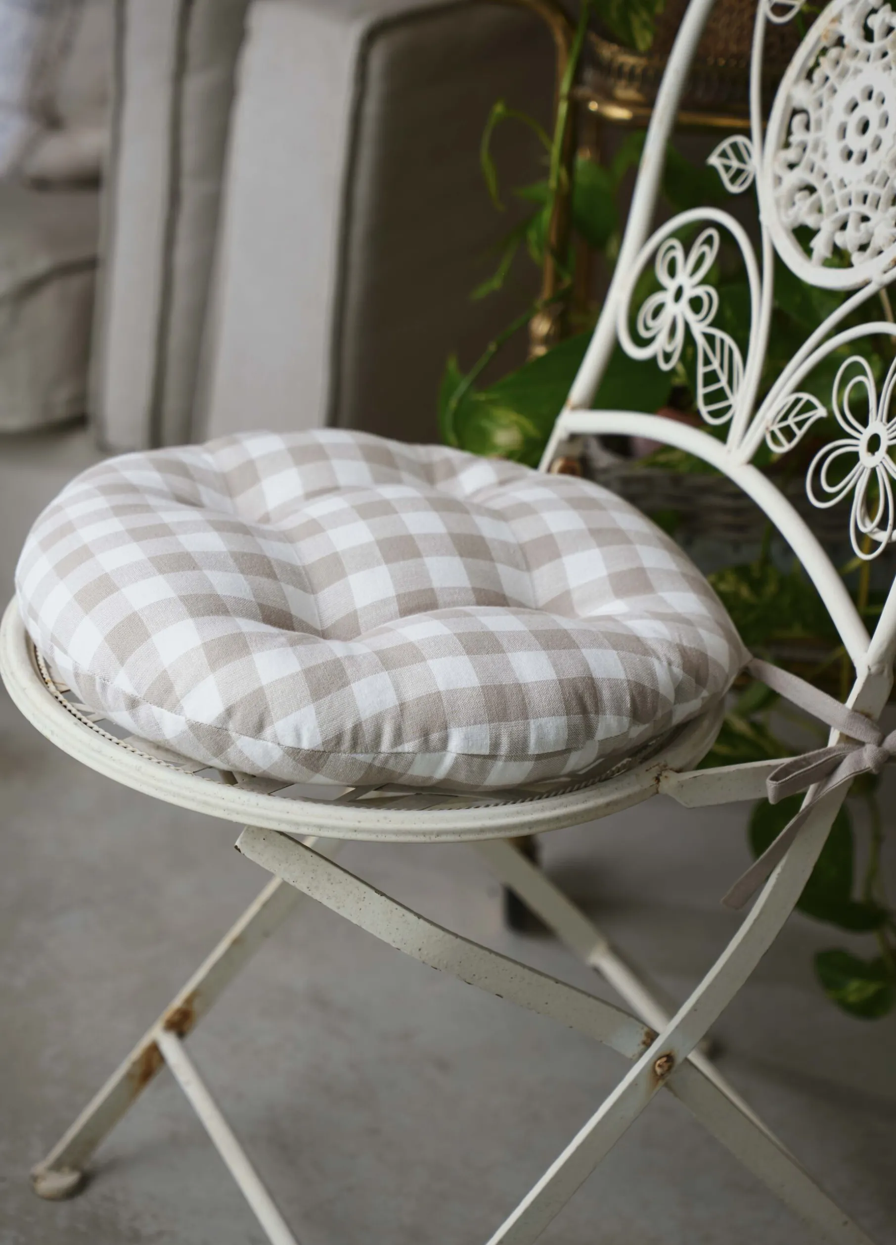 Cuscino coprisedia rotondo realizzato in puro cotone a quadretti bianchi e beige, dallo stile rustico e accogliente. Completo di imbottitura e laccetti.