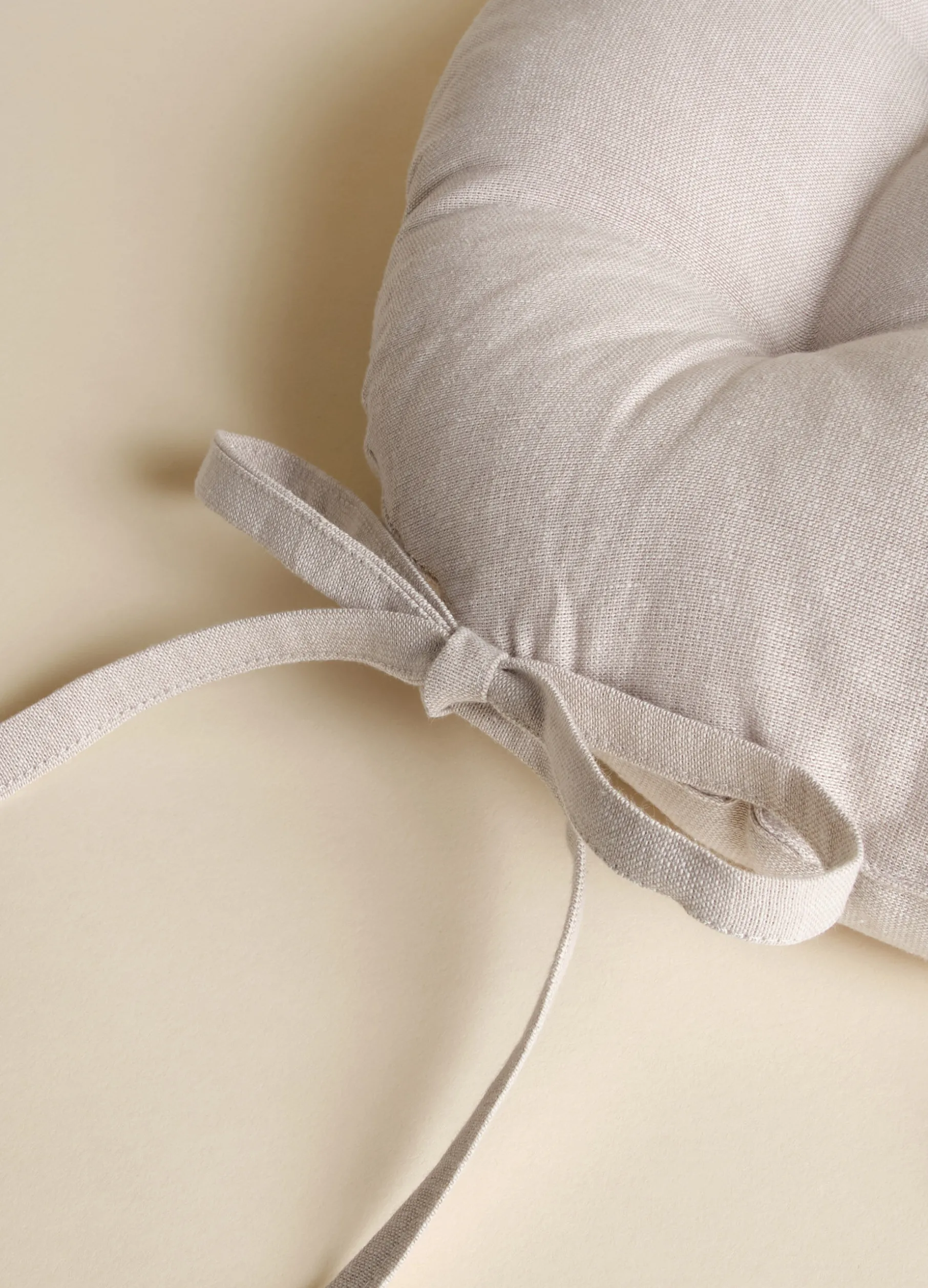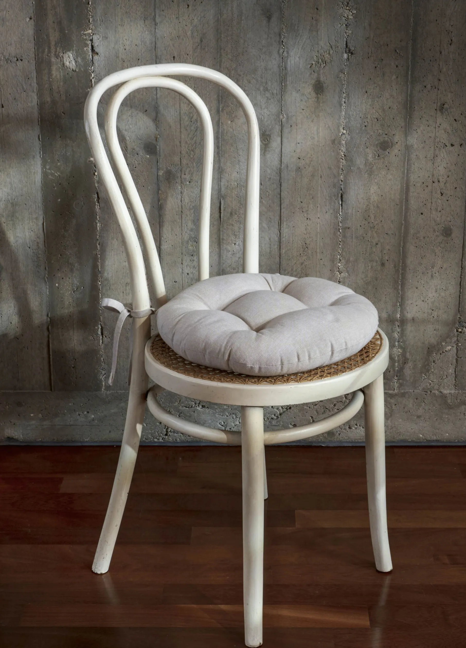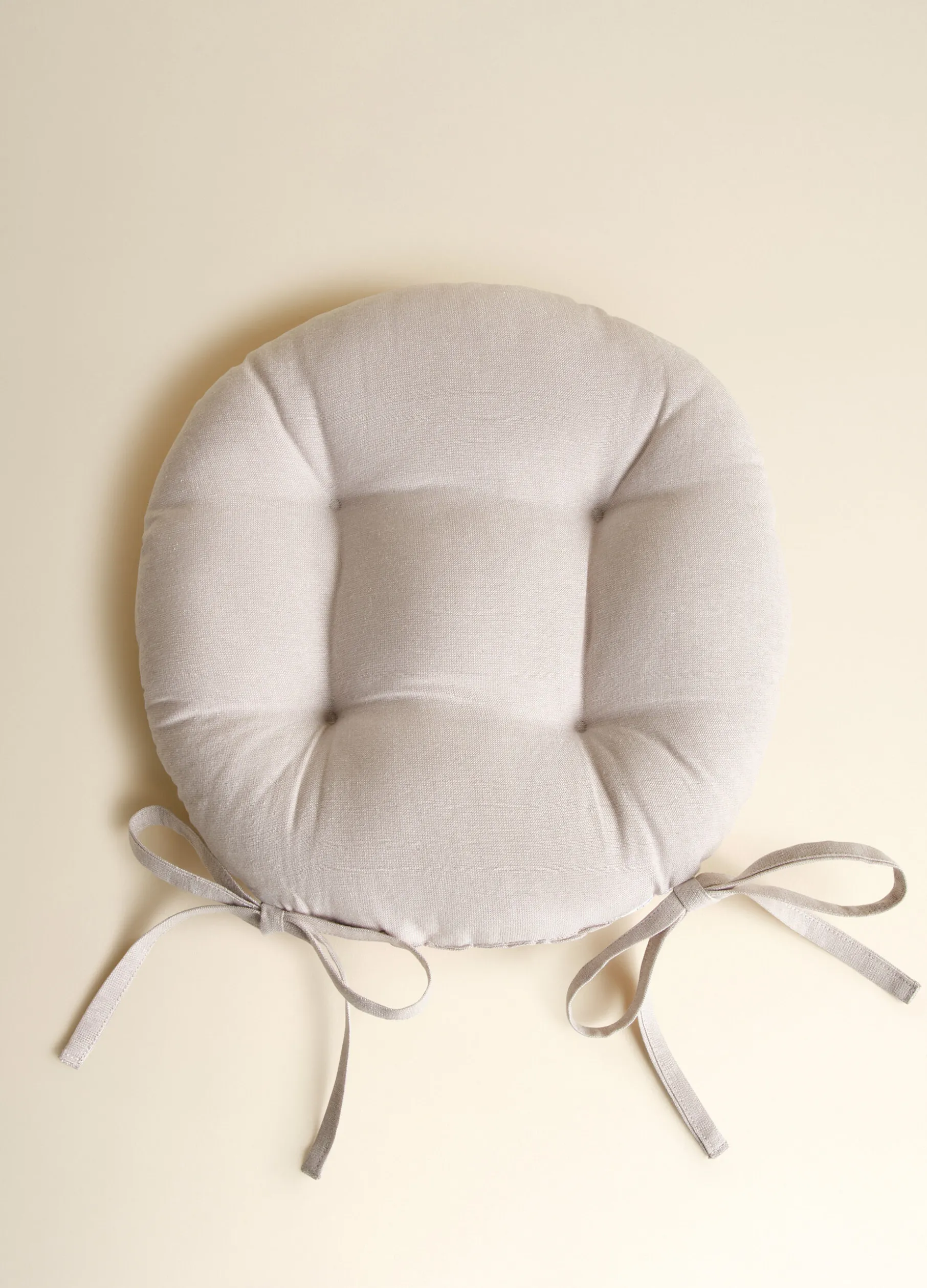 Cuscino rotondo per sedie da cucina in puro cotone beige chiaro dalla caratteristica texture leggermente grezza. Completo di imbottitura trapuntata e laccetti.