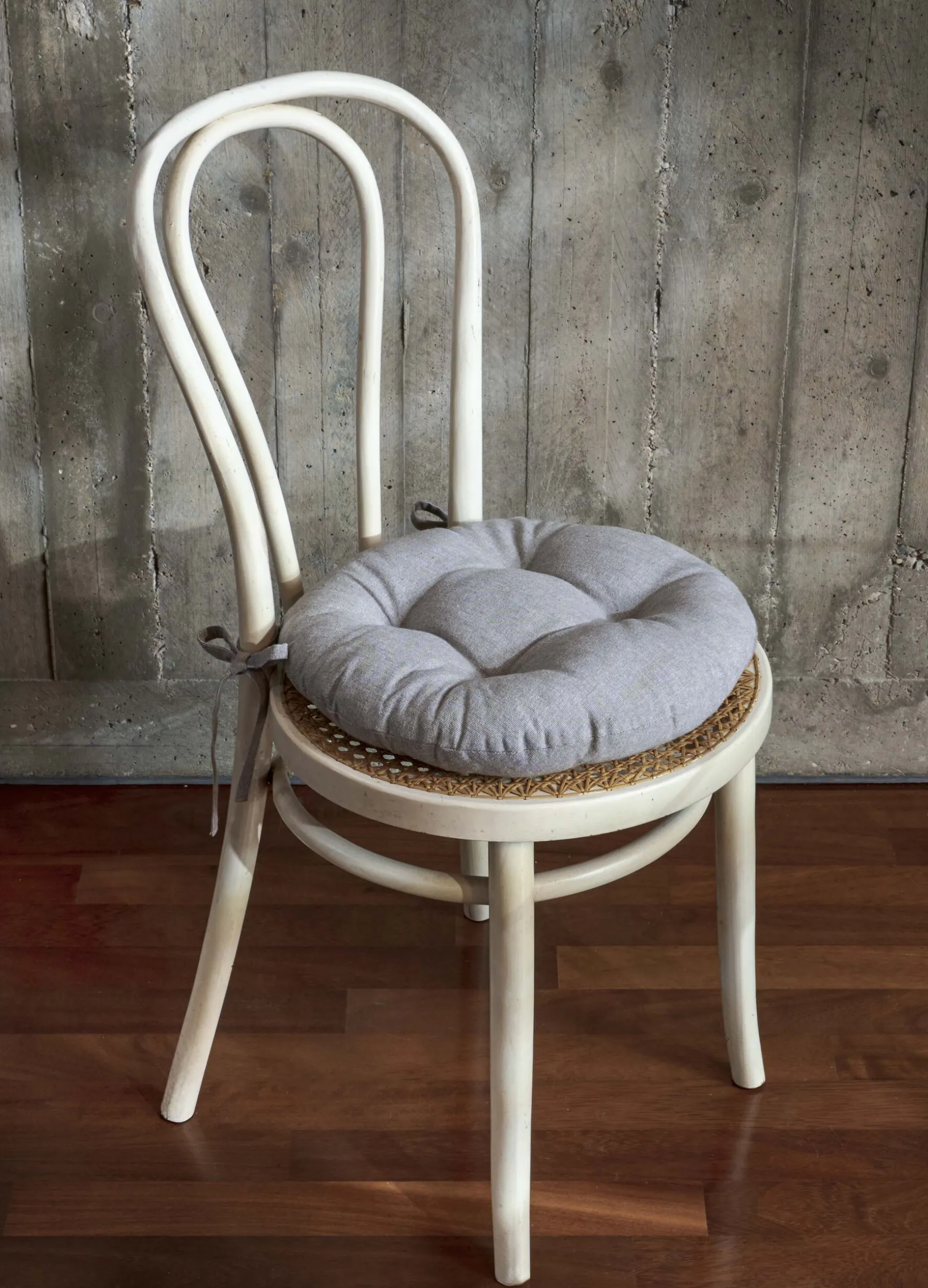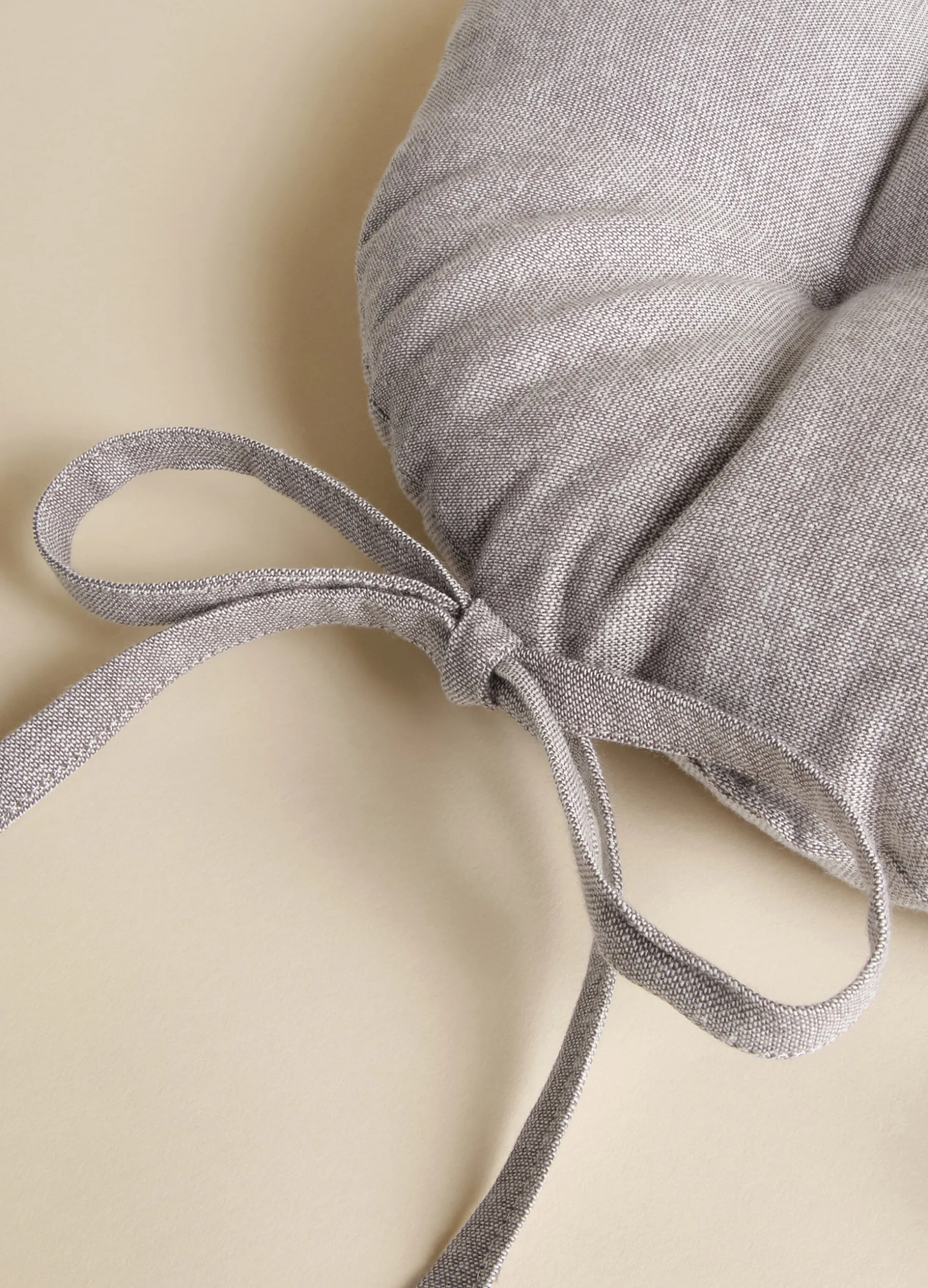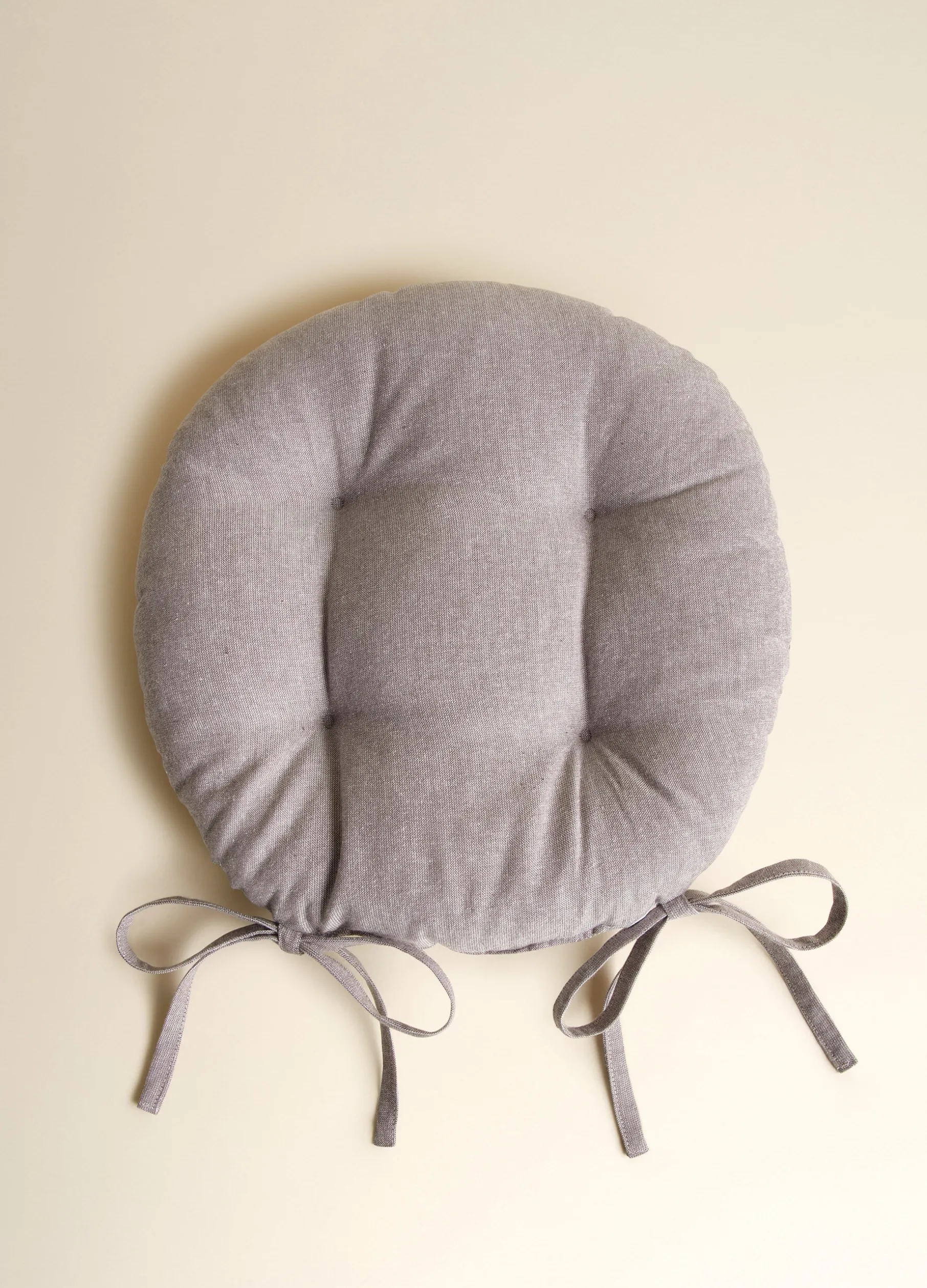 Cuscino rotondo per sedie da cucina in puro cotone marrone écru dalla caratteristica texture leggermente grezza. Completo di imbottitura trapuntata e laccetti.