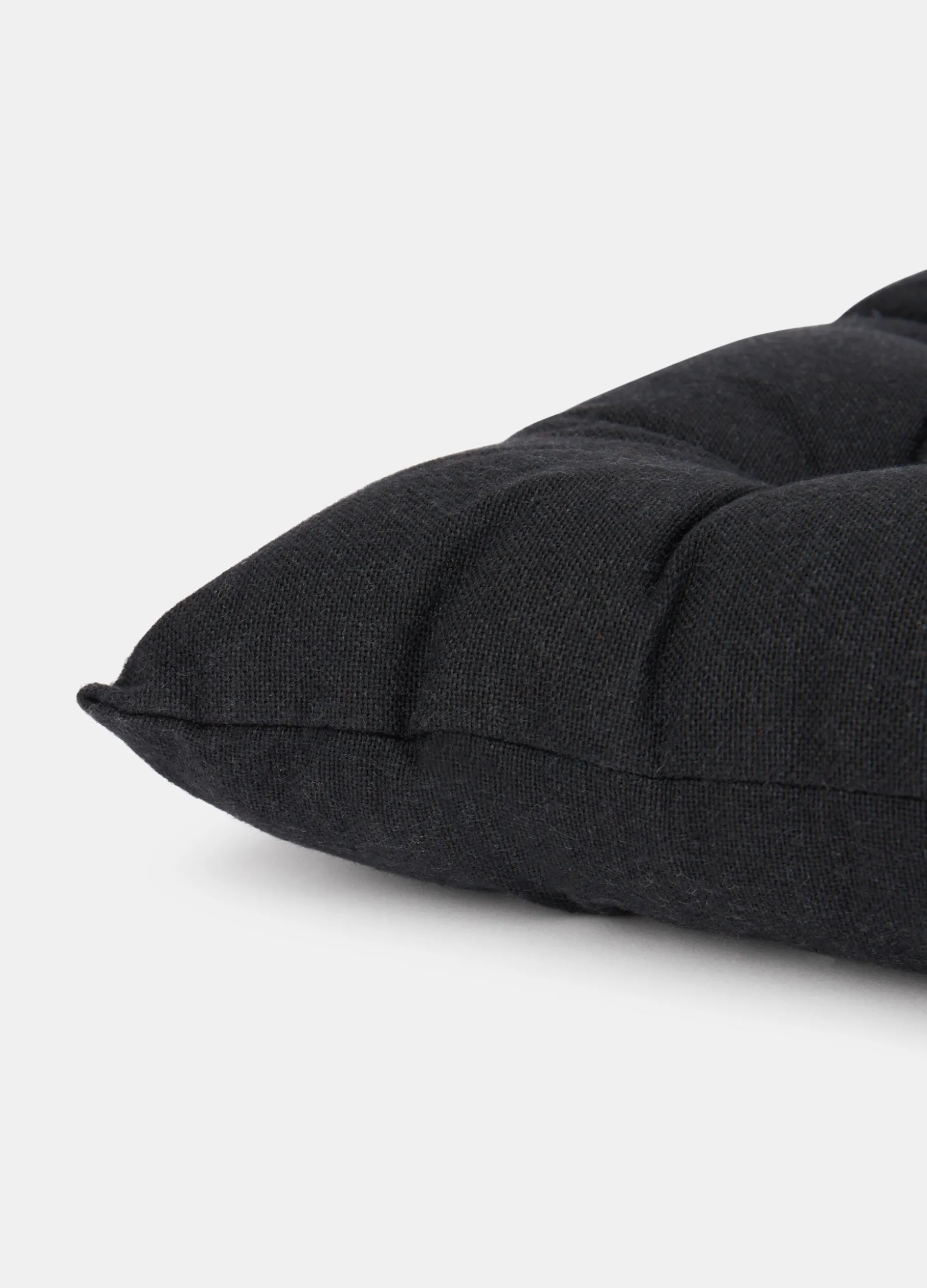 Cuscino quadrato per sedia, completo di imbottitura per garantire il comfort e una seduta corretta. Il tessuto nero a tinta unita ha una texture caratteristica simile alla tela, ed è completato dalla trapuntatura e dai laccetti per fissarlo alla sedia. Dimensioni: 40 x 40 cm.