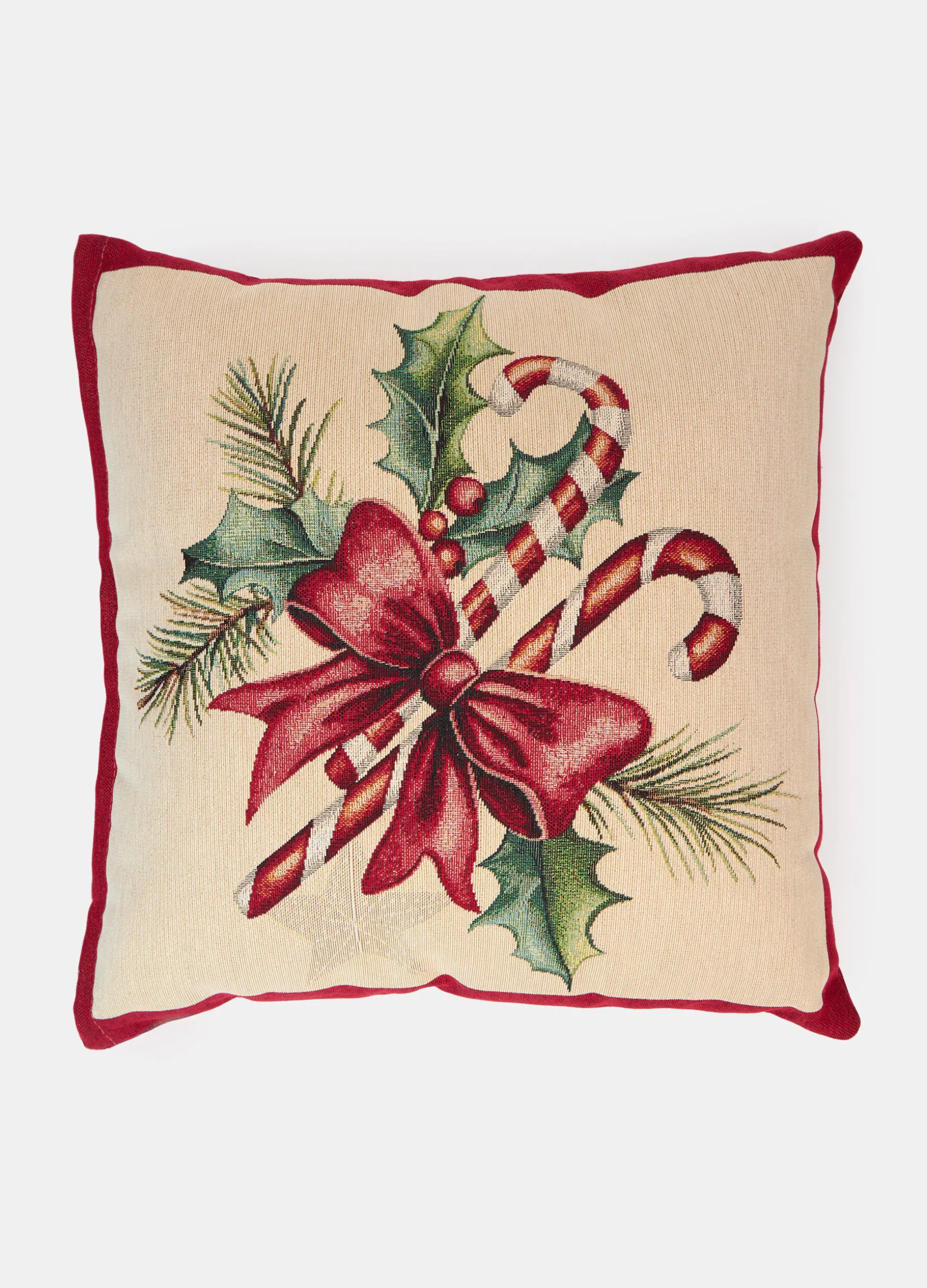 Cuscino quadrato, completo di morbida imbottitura e rivestito da un tessuto liscio caratterizzato dalla particolare lavorazione jacquard che ricorda il fascino rustico degli arazzi antichi, con sfondo beige, motivo di ispirazione natalizia e bordo a contrasto. Dimensioni: 45 x 45 cm.