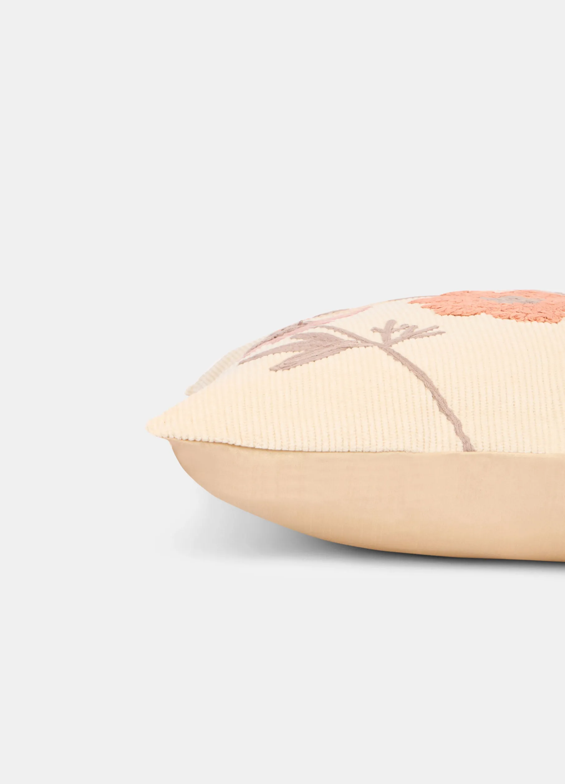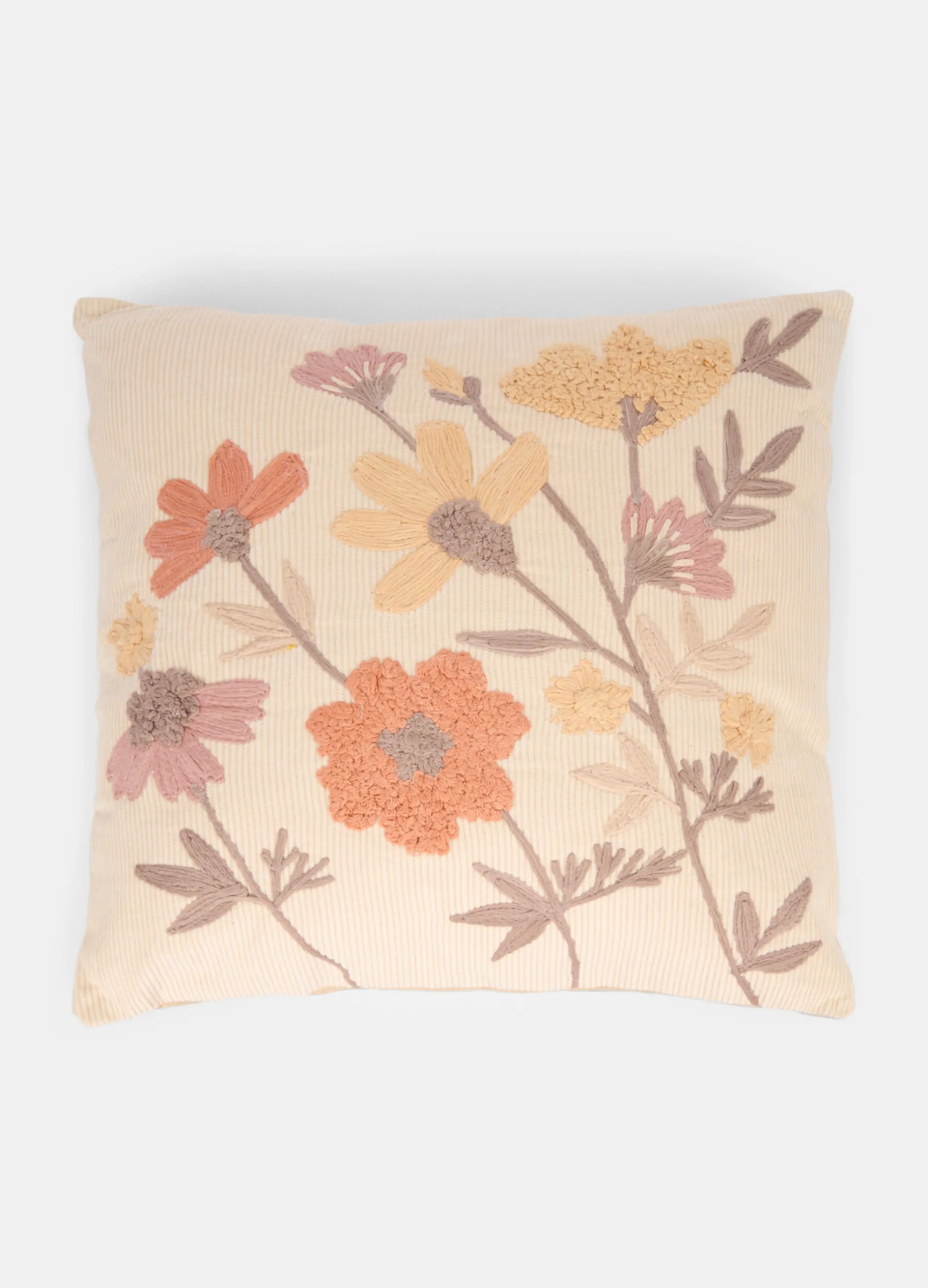 Cuscino quadrato beige, completo di imbottitura, con un lato in velluto a coste morbido e soffice, arricchito da una decorazione floreale ricamata in diverse tonalità pastello. Dimensioni: 45 x 45 cm.