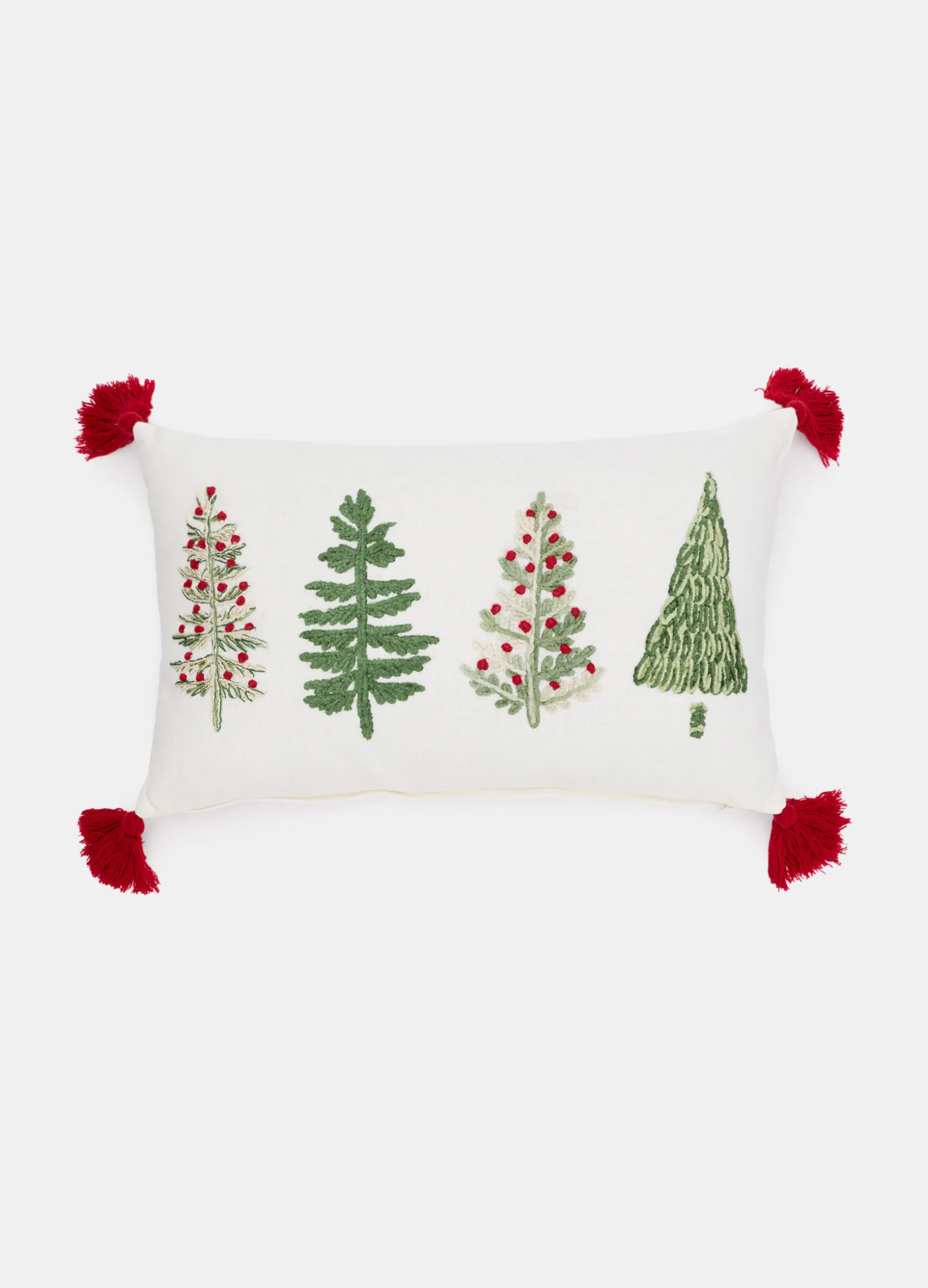 Cuscino imbottito di forma rettangolare rivestito in tela di cotone bianco candido e arricchito da un delicato ricamo a contrasto che richiama il paesaggio invernale e l’atmosfera delle feste. Le quattro nappe rosse agli angoli completano l’accessorio. Dimensioni: 50 x 30 cm.