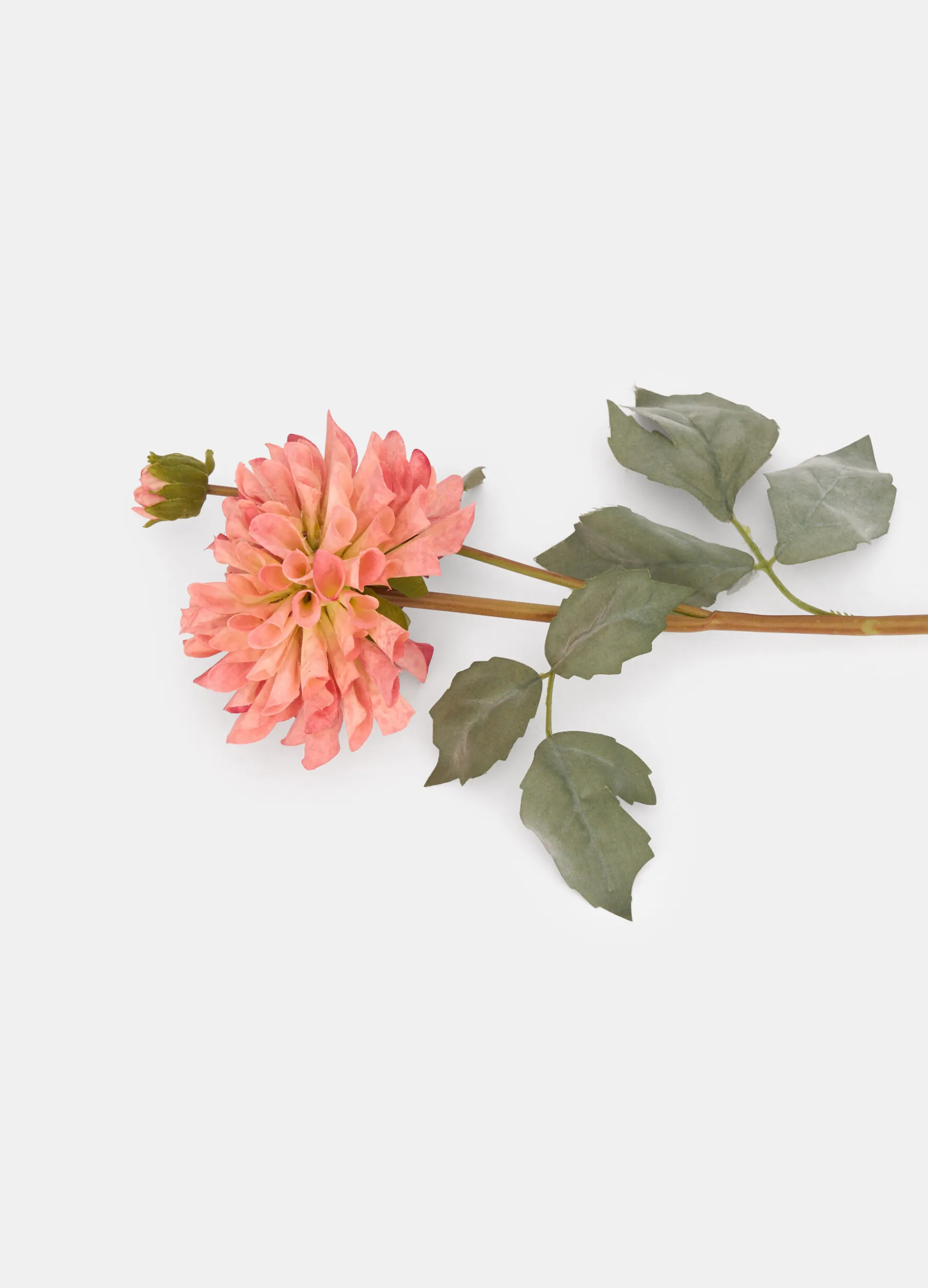 Singolo fiore di dalia su stelo lungo, completo di foglie verde scuro. La ricchezza dei dettagli rende realistica la corolla dai petali rosa chiaro. Lunghezza: 61 cm.