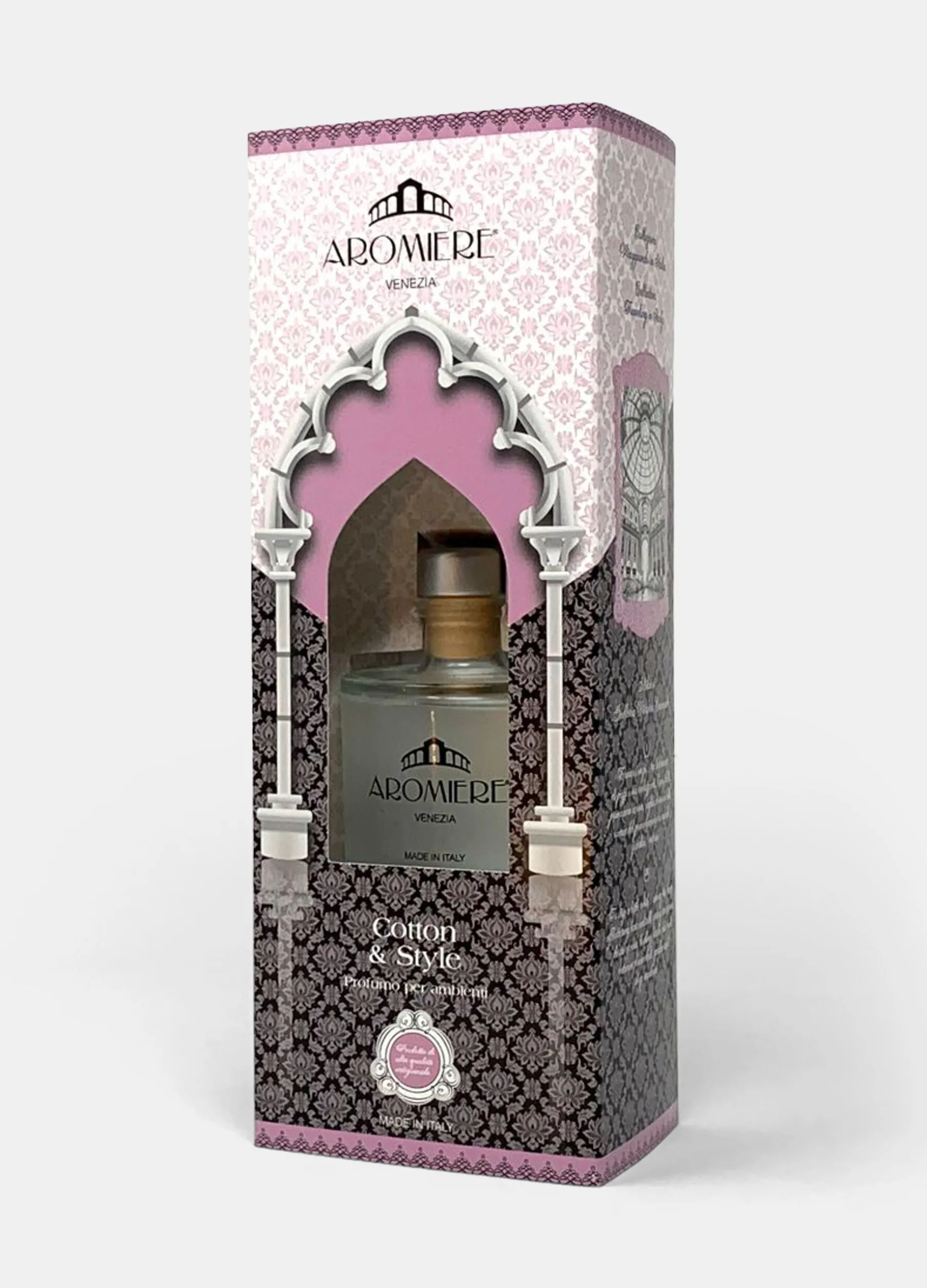 Diffusore per ambienti Aromiere Venezia aroma “Cotton & style”. Contenitore in vetro. Capacità 100ml. Altezza 25cm. Made in Italy.